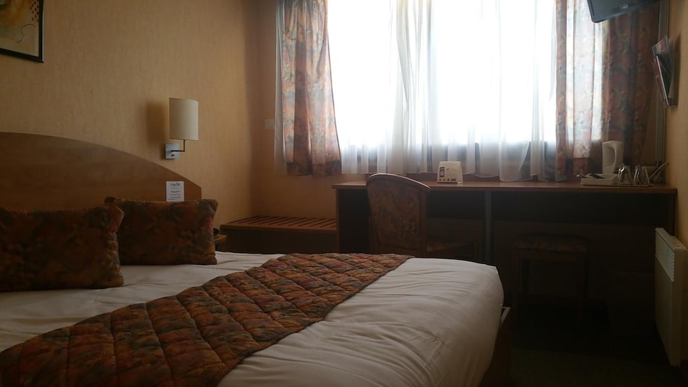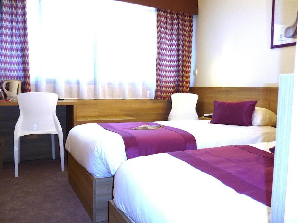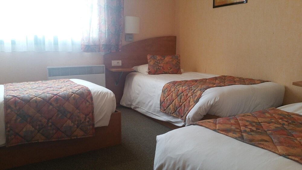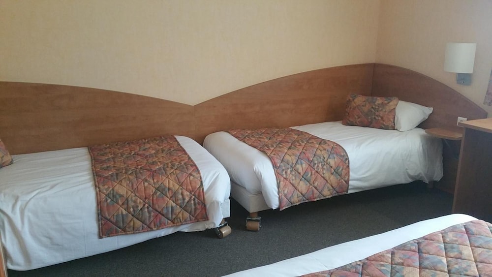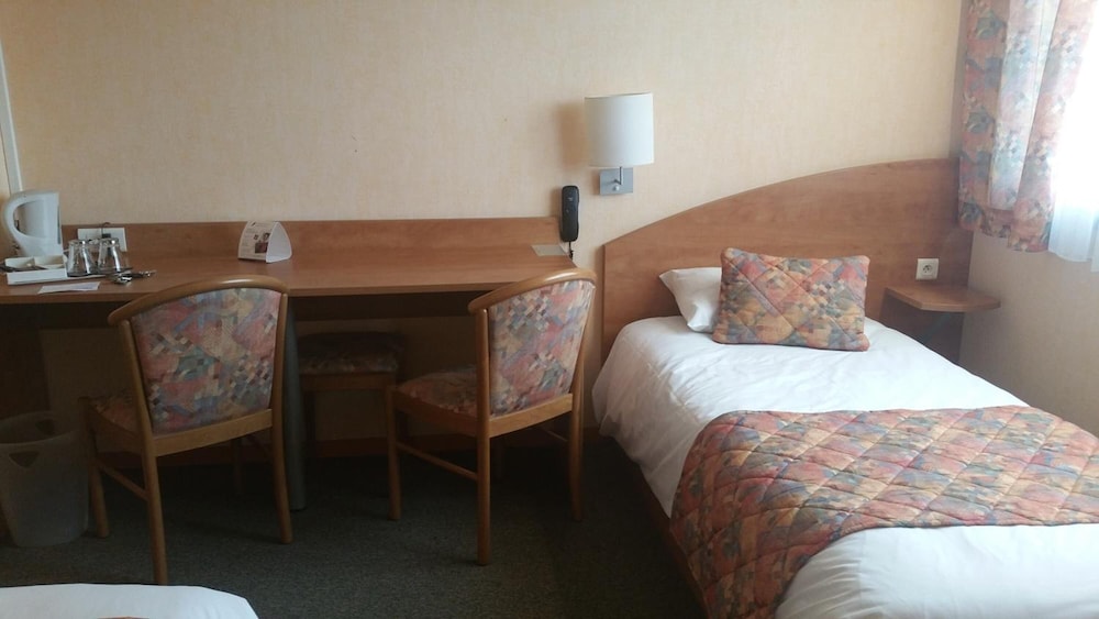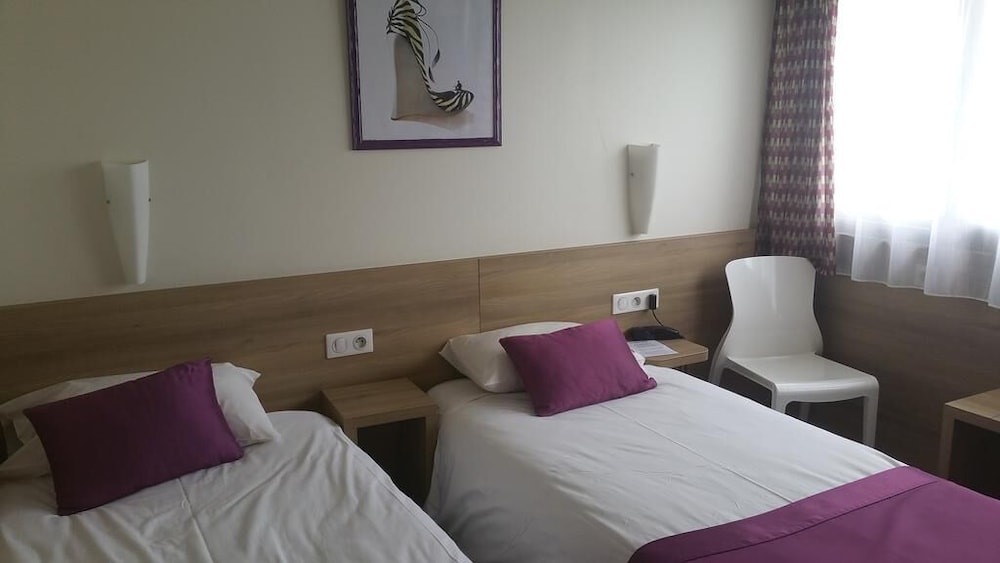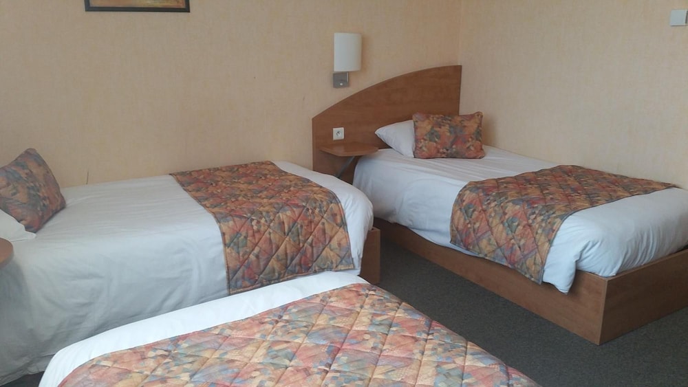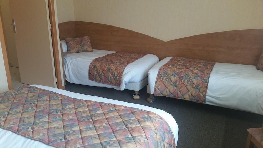 allumage automatique de la lumière cassée, donc dans le noir ds l entrée de la chambre... 3 petits lits, dont 2 un peu poussiéreux(problématique pr moi car allergique) le 3ème non poussiéreux avait un matelas écrasé ce qui fait qu'on penche ds le lit... de plus le bruit du conduit vmc des wc et de la sale de bain m a empêché de dormir une partie de la nuit.... en demain devicoration un beau trou de coup de poing ds la porte... enfin je regrette d avoir mangé le menu «gastronomique» très loin d être à la hauteur du prix, les escargot sont à vomir, j'aurai dû manger au mac do à côté. Le seul point positif est le personnel très sympathique et accueillant. Bref la chambre mérite un gros rafraîchissement, à defaut le prix de la chambre en mérite un...