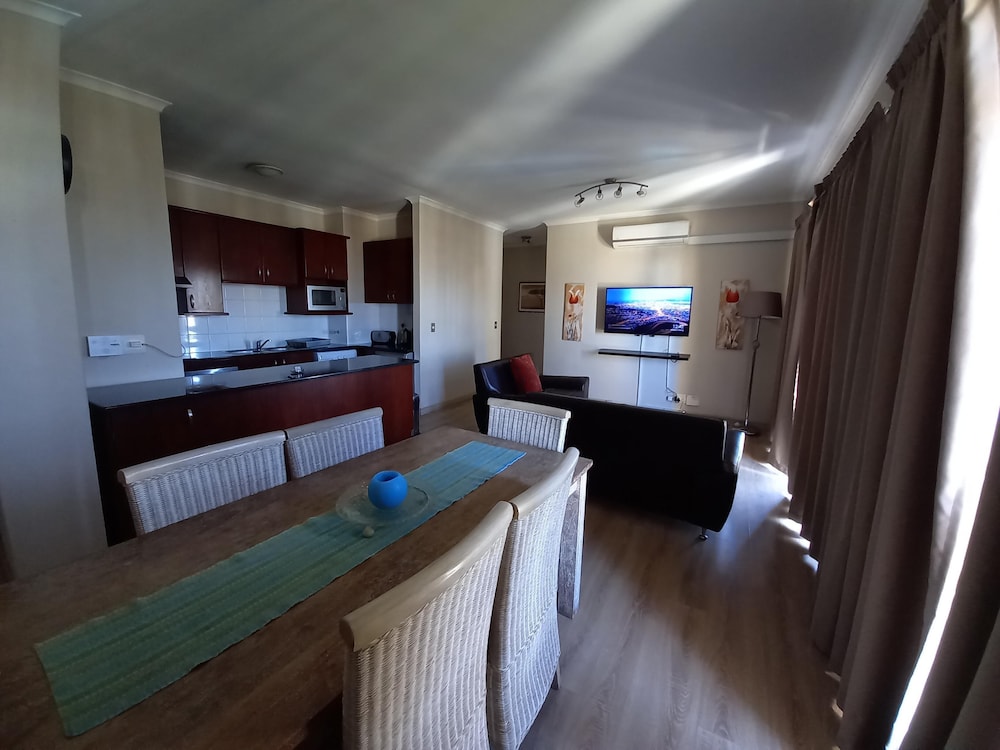 The apartments are privately owned and then rented out to visitors - our apartment was a 1 bedroom with a lovely living/lounge/kitchen area with a parking space. We stayed for 3 nights - it has very good security and the grounds are very well kept - there is a pool area central to the apartment blocks - though there were no sun loungers or even seats so had to take our beach towels to sit on. The shopping mall is close by - plenty of food outlets as well as supermarkets, pharmacy etc. Not all the apartments were being used and it is a big complex so it was quiet and lacked a bit of atmosphere. The surrounding area has hotels within walking distance for meals/drinks. A car/taxi required to get into Cape Town.