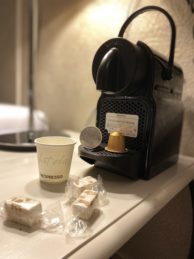 Nespresso Maschine und zwei Flaschen Wasser auf dem Zimmer.