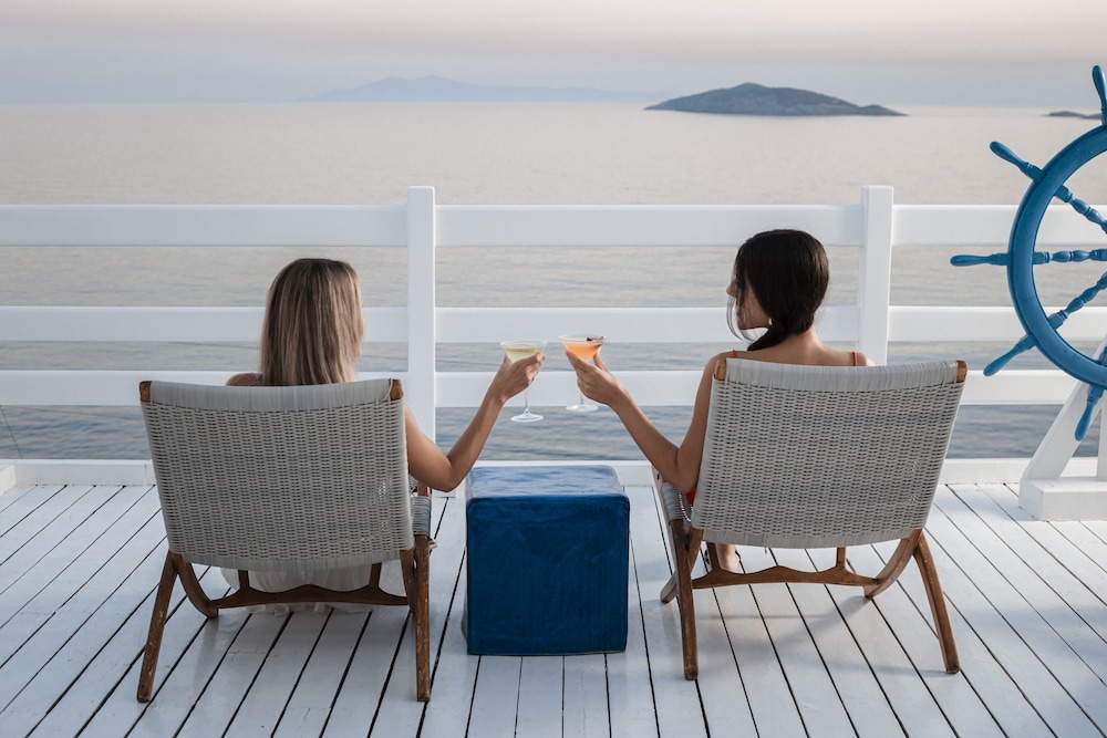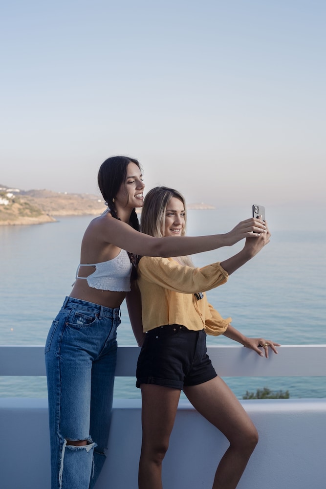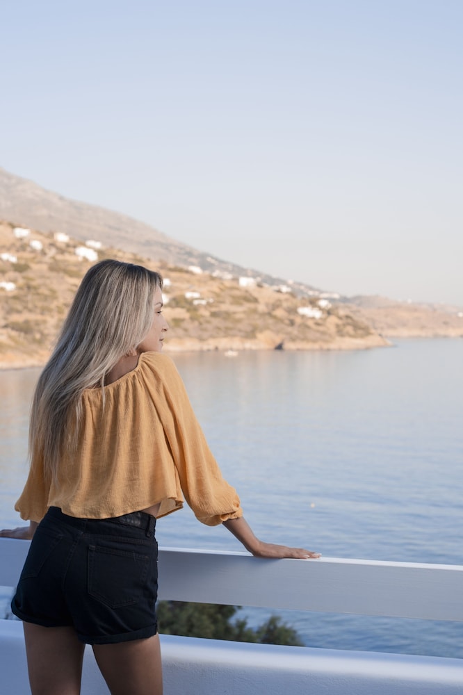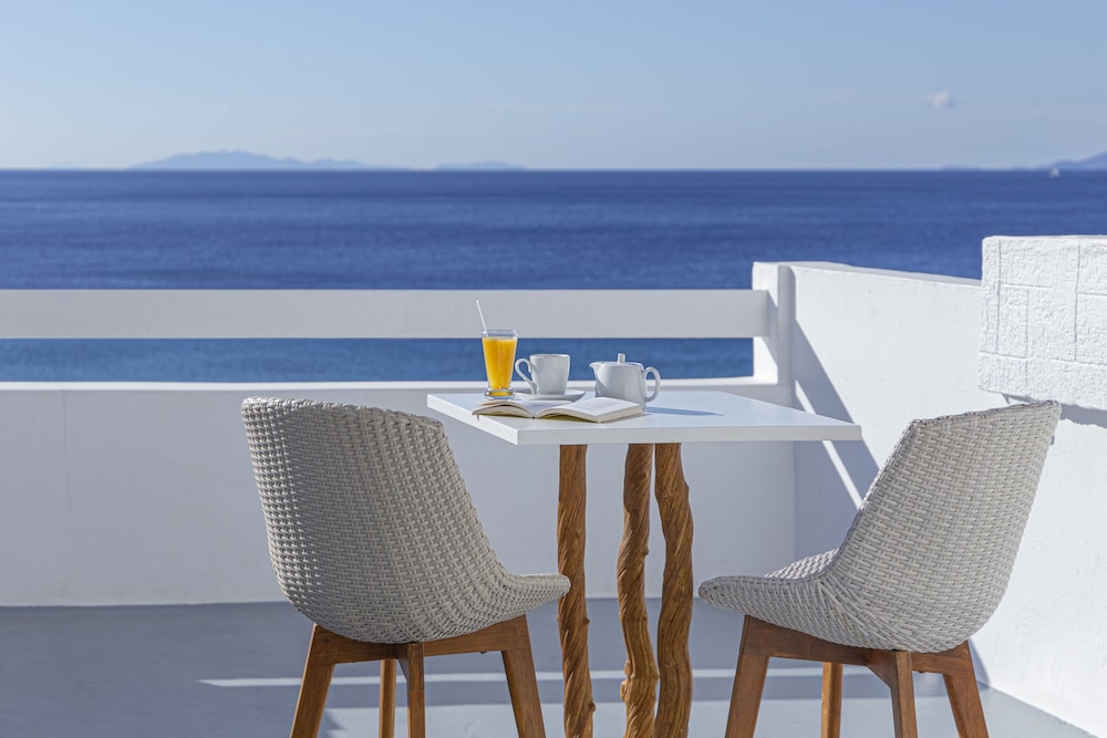 Hôtel très bien situé avec chambre vue sur la mer Egé et sur la piscine grande terrasse literie confortable chambre spacieuse nº215 une vraie douche à l’eau douce pas comme souvent sur les autres îles des Cyclades