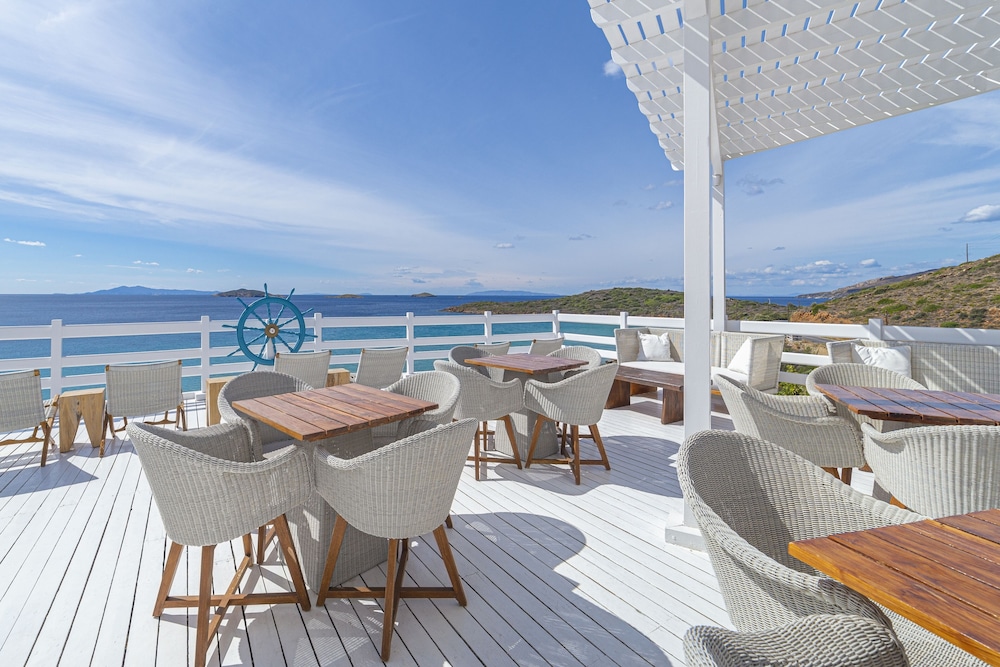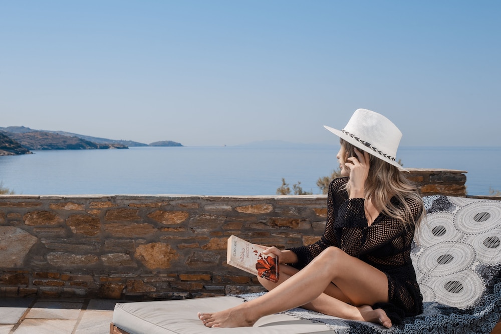 Die Einrichtung von Restaurant und Terrasse ist wunderschön. Ausblick von dort und vom Balkon des Zimmers atemberaubend. Leider ist das Essen nicht unbedingt griechisch, schmeckt durchschnittlich und ist überteuert. Das Personal ist ausnahmslos sehr freundlich und hilfsbereit. Lediglich etwas überfordert, als für 24h eine griechische Reisegruppe zu Besuch war - da fühlten wir uns als Gast nicht wohl, es war durchweg laut und störend beim Frühstück war auch, dass geraucht wurde. Das war das einzige Mal, dass das Personal nicht helfen konnte. Man braucht auf jeden Fall einen fahrbaren Untersatz, wenn man das Hotel verlassen möchte, da es isoliert genau zwischen den Orten Gavrio und Batsi liegt. Laufen wollten wir diese Strecke nicht, da es uns entlang der kurvigen Hauptstraße zu gefährlich erschien. Der hoteleigene Strand ist über die Straße zu Fuß bequem erreichbar und bietet kostenlose Schirme & Liegen für Hotelgäste. Grundsätzlich ist das Hotel empfehlenswert, perfekt für eine entspannte Auszeit.