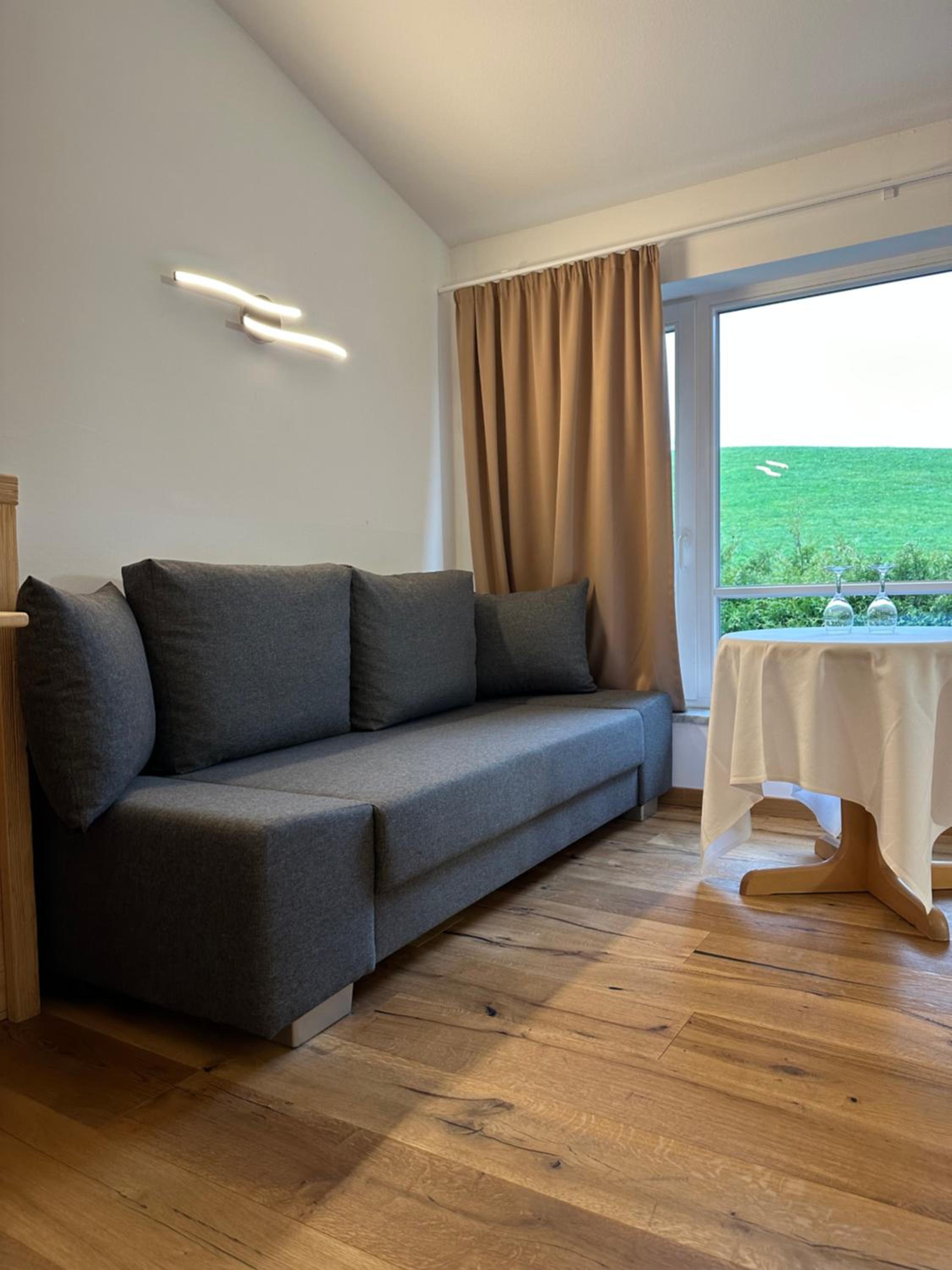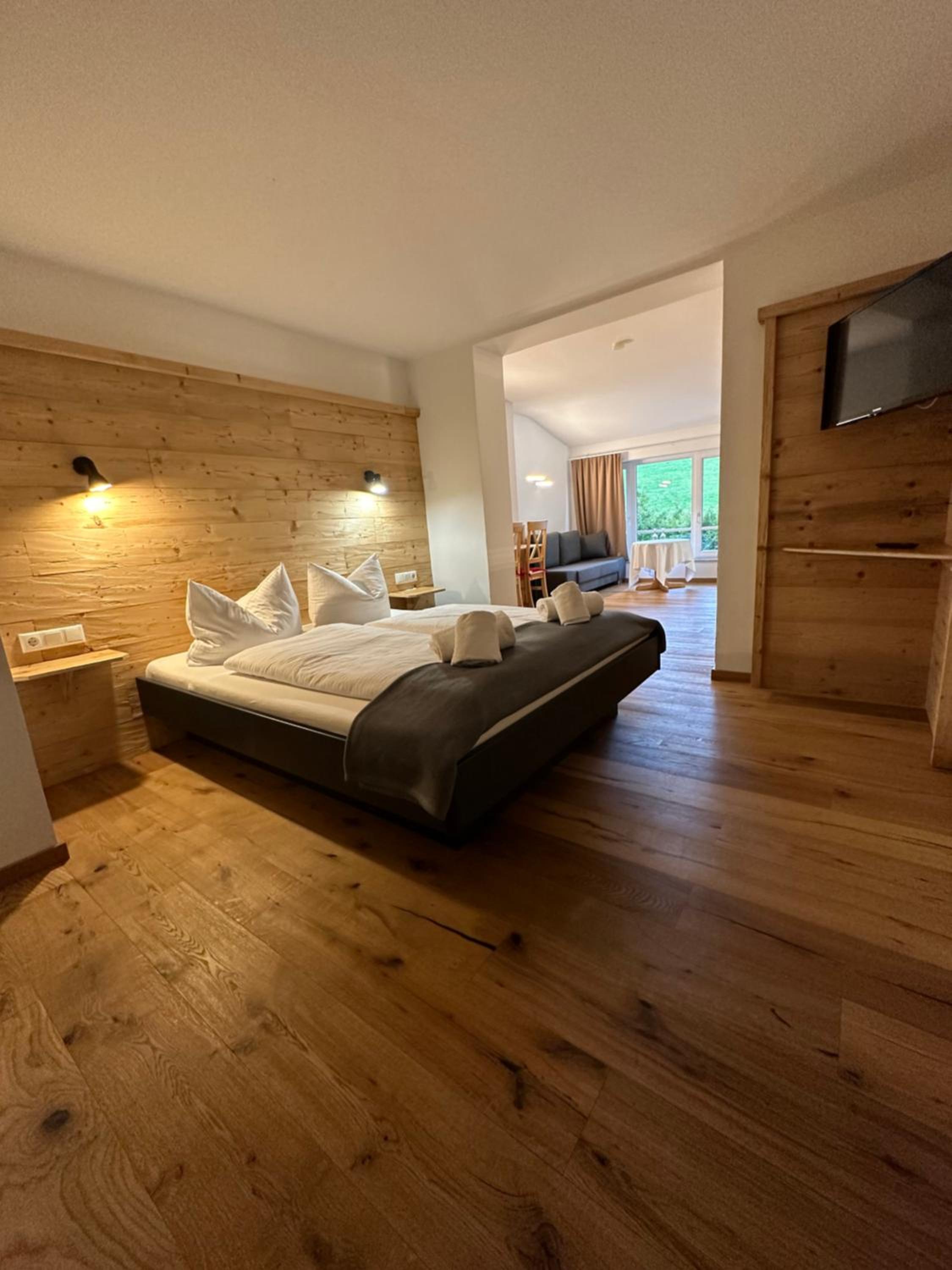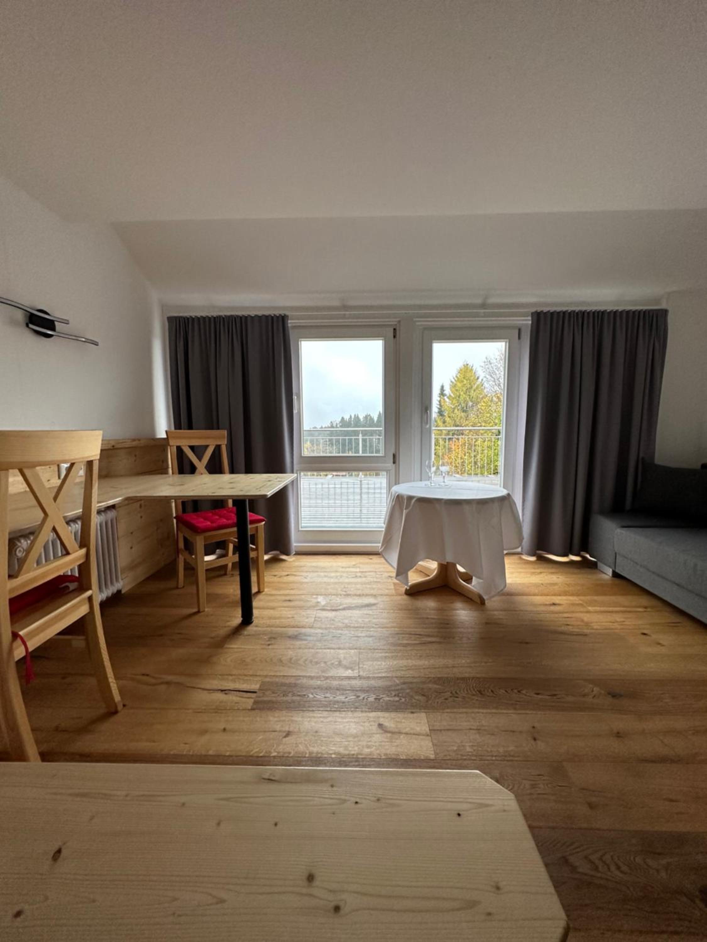 Nice and quiet location in the countryside, big room (we had a mini-apartment with kitchenette) with a very panoramic view on the mountains, comfortable bed and friendly staff (when around). There was a small sauna (to be paid extra) but we did not use it at the end.