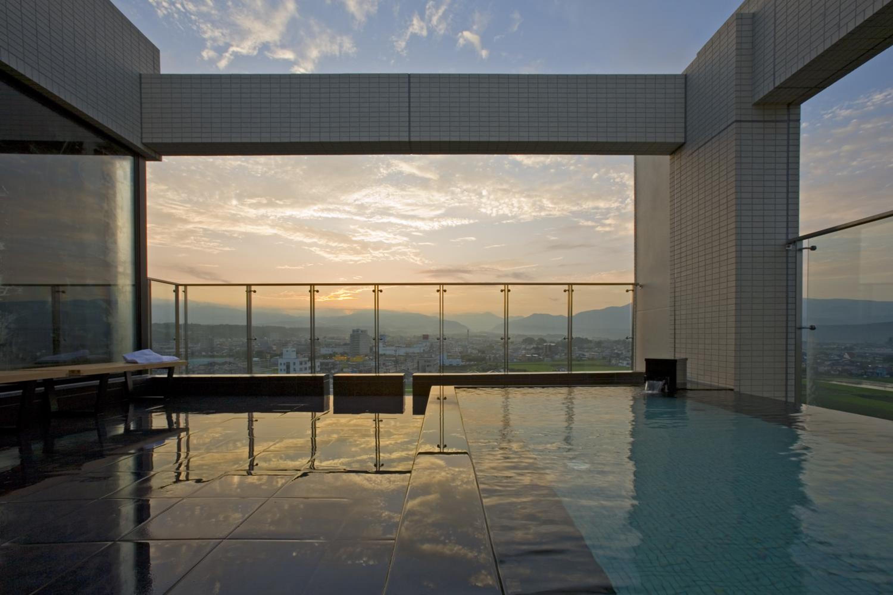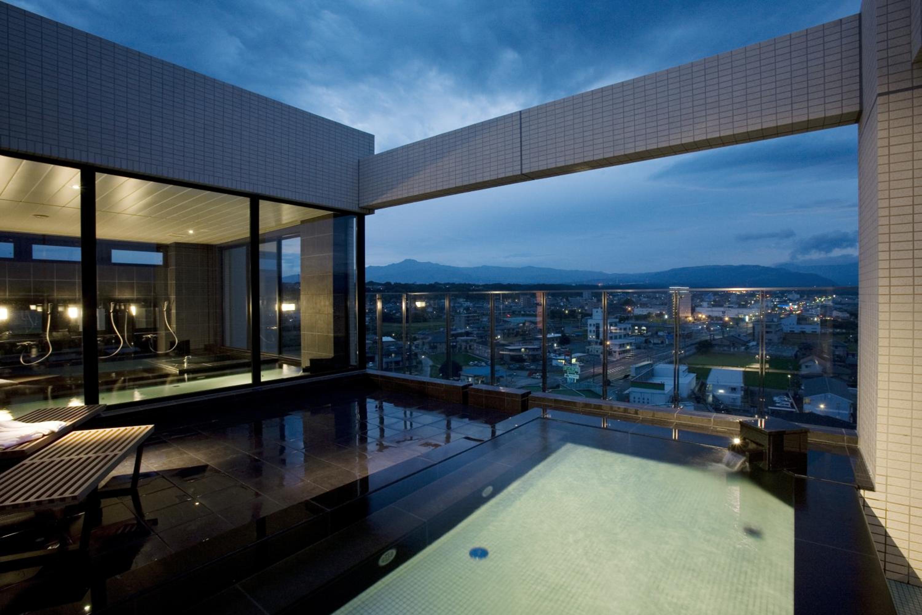 Experience relaxation and tranquility at Candeo Hotel Ozu Kumamoto with its rooftop outdoor bath offering breathtaking views of Mt. Aso.