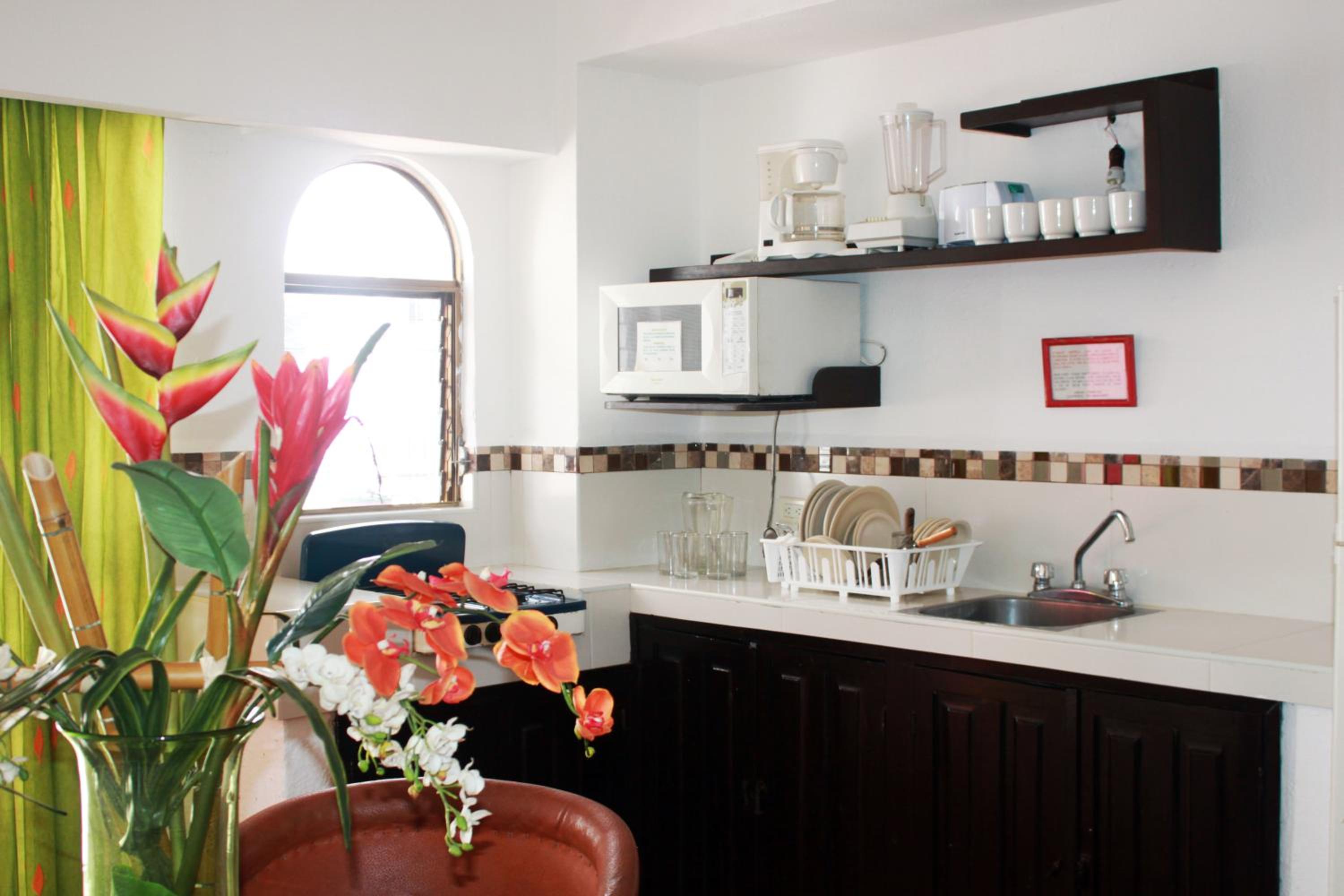 Experience a vibrant stay at Suites Plaza del Rio - Family Hotel Malecón Centro, offering colourful studios and apartments with essential amenities like a kitchen, balcony, and seating area.
