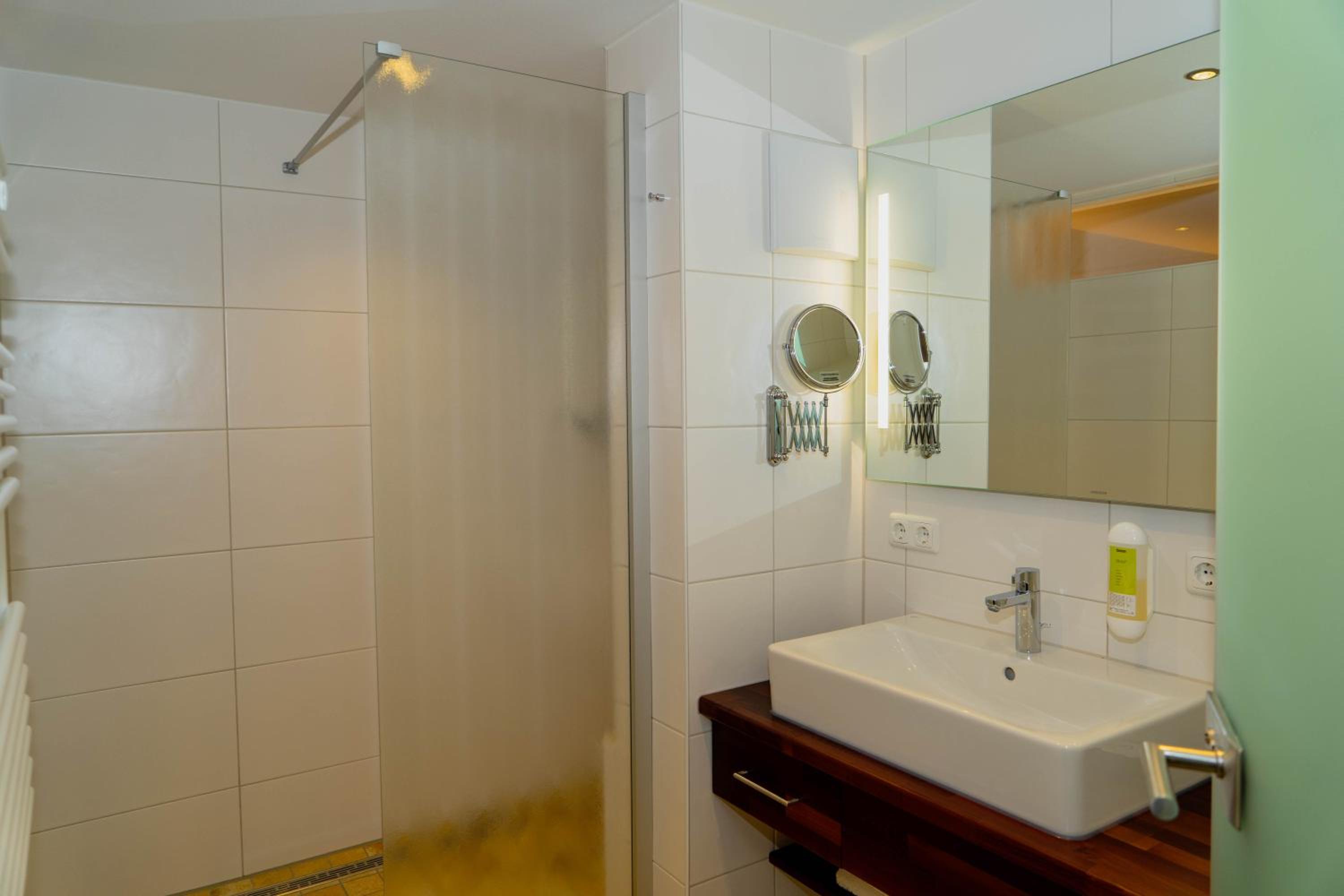 Die Dusche hat keinen Vorhang, sodass es nicht zu vermeiden war, dass der Boden im Bad nass wurde