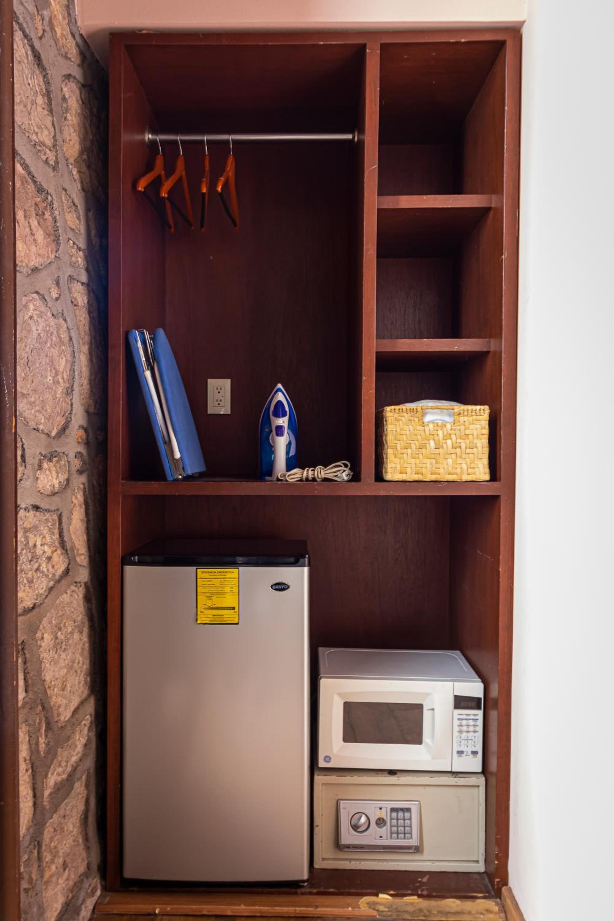 La habitación reducida ,accesorios ya muy viejos como un servibar,el microondas y la caja de seguridad que ni sirven y solo estorban para colocar ropa en el closet que es muy pequeño