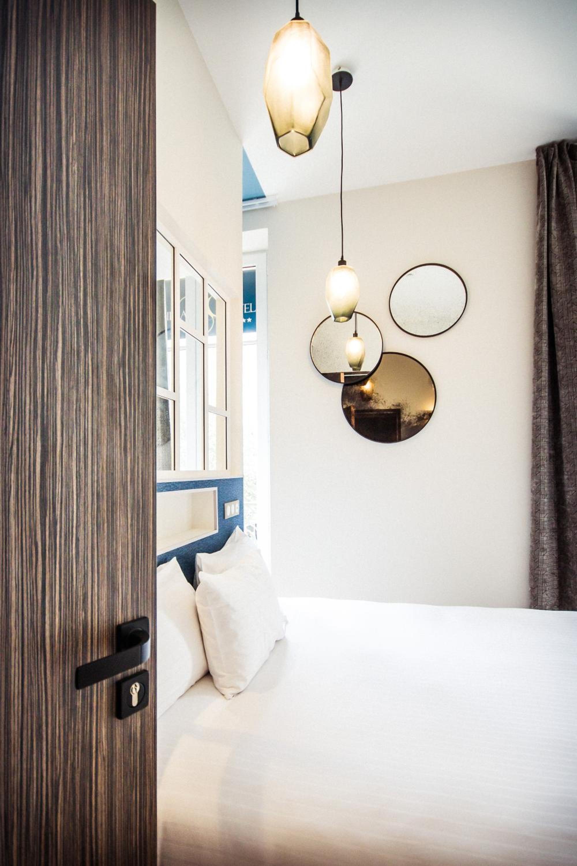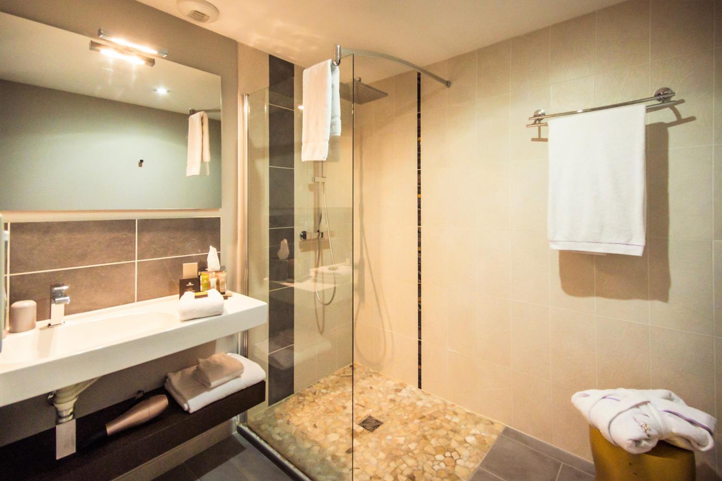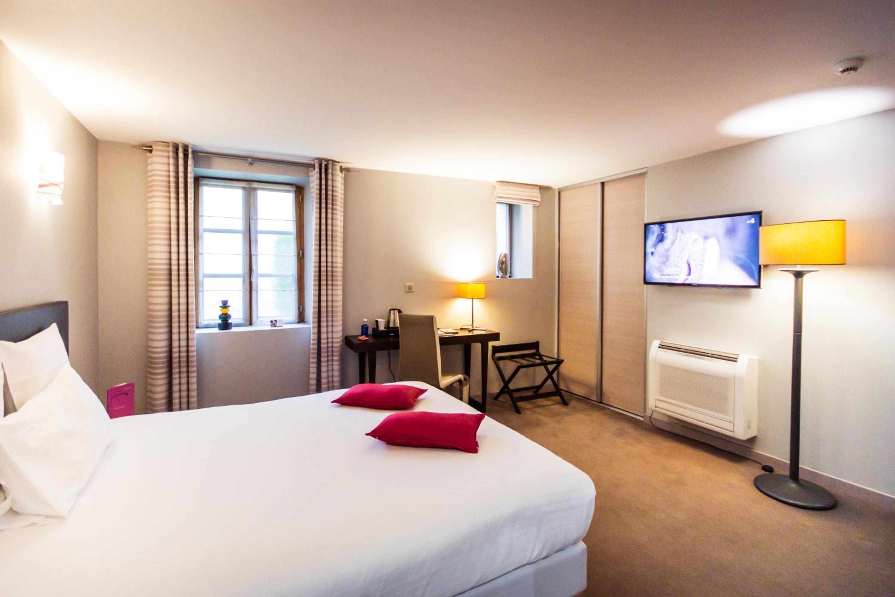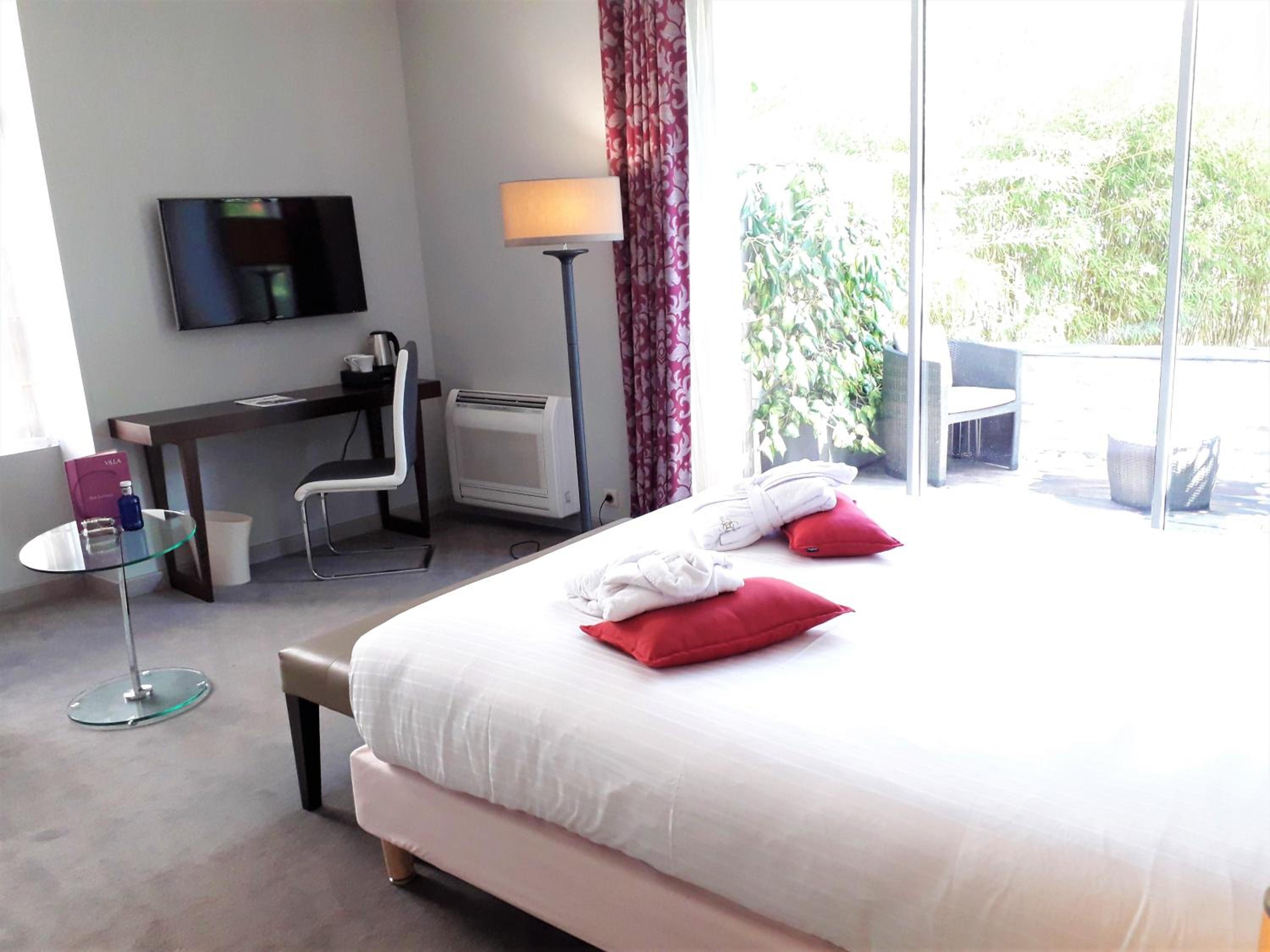 Experience chic Italian style guest rooms at Logis Villa C Hôtel, featuring luxury linen, satellite TV, and free high-speed WiFi. Each room is equipped with air-conditioning and a stylish stone-finished private bathroom. Enjoy the natural light through large windows and relax on your own balcony or terrace.