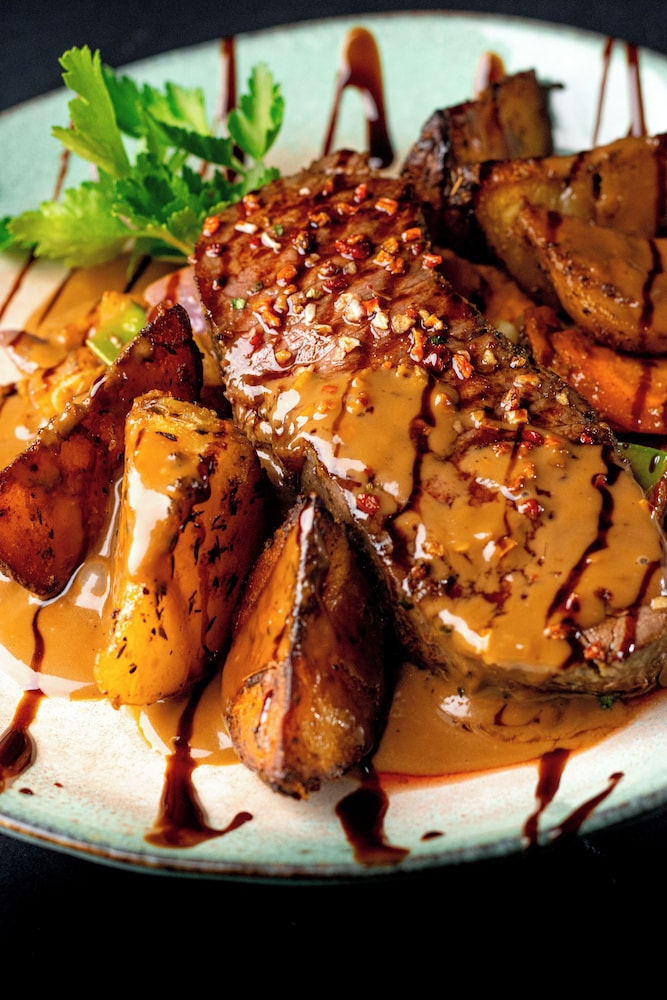 Godt kjøkken med et bra utvalg av forskjellige matretter, flott rustikk interiør på restauranten.