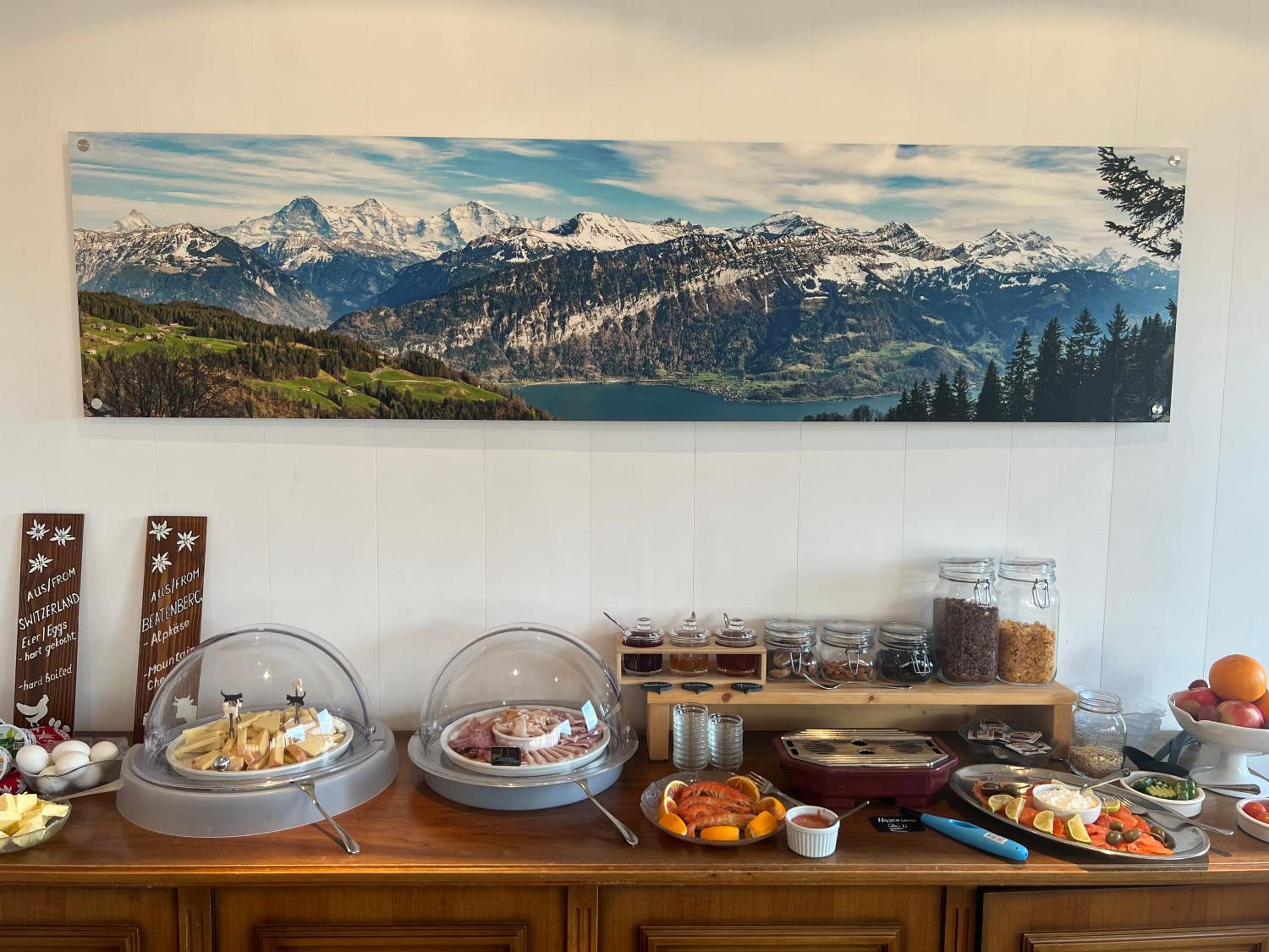 Bel hôtel bien décoré avec vue sur les magnifiques montagnes suisses pour le petit déjeuner.