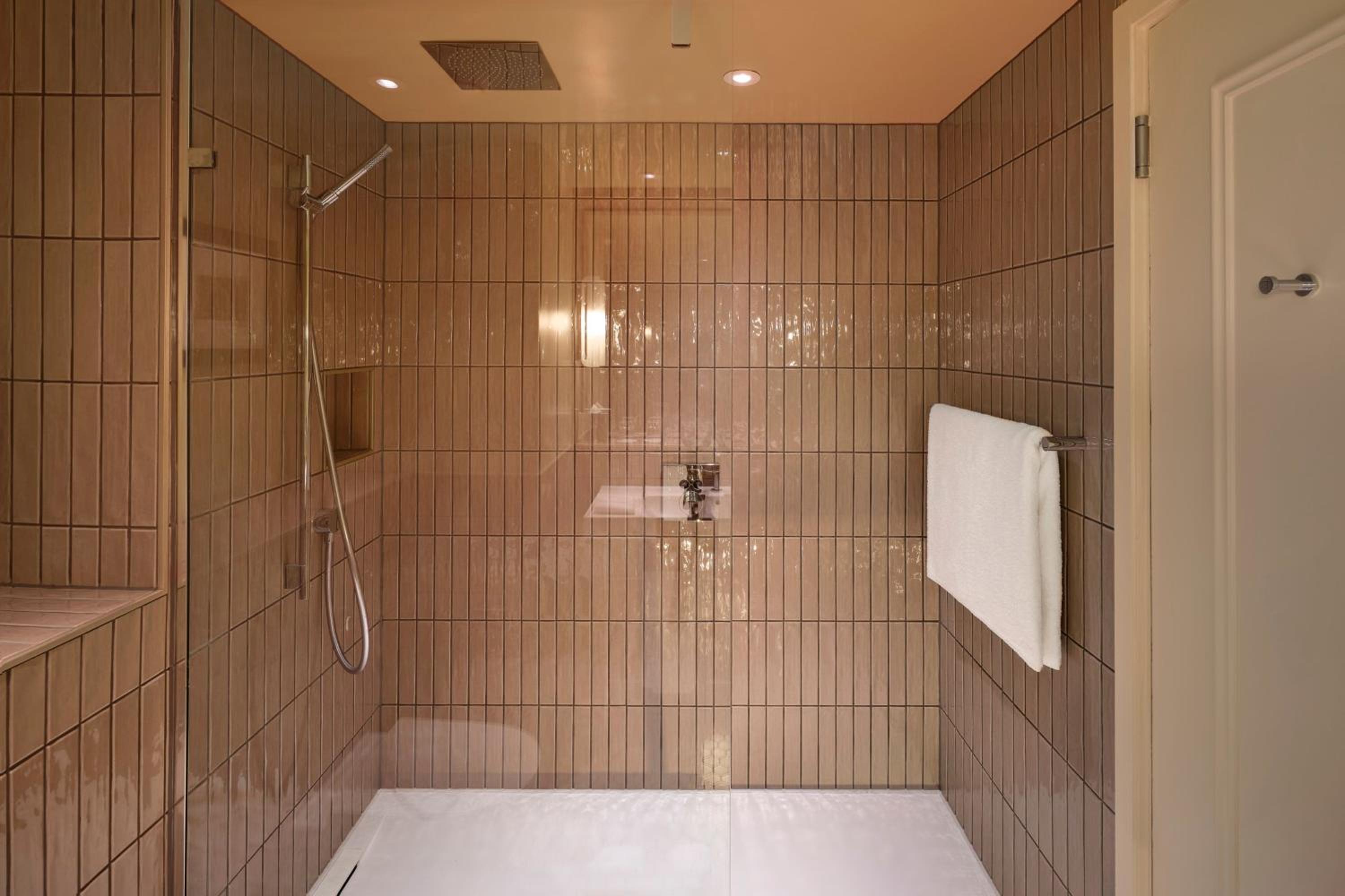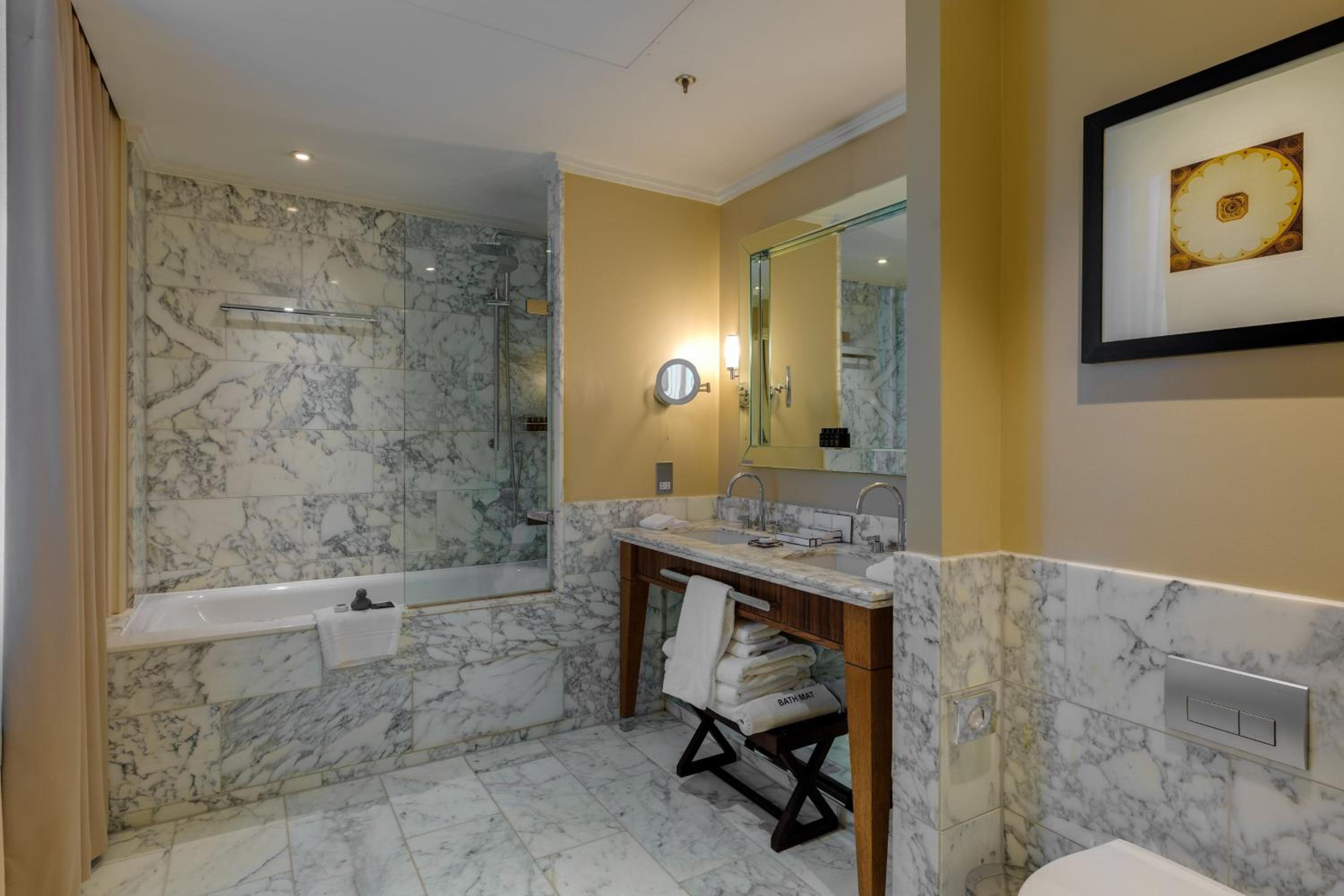 Each room in this elegant hotel is equipped with a 37-inch flat-screen TV and large tiled bathrooms with plush bathrobes and slippers, ensuring a comfortable and entertaining stay for all guests.