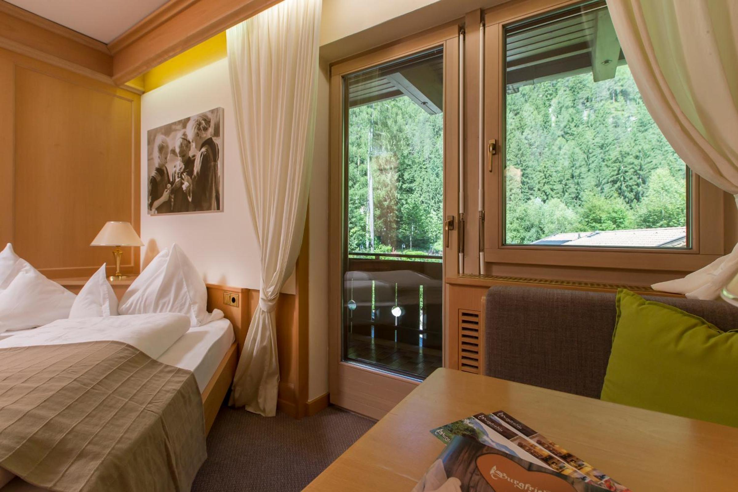 Hotel Burgfrieden, nestled in the picturesque Ahrntal valley, offers elegant rooms with balconies and stunning views of Neuhaus Castle. Whether you prefer a cozy carpeted room or a charming wood-floored space, each room is equipped with modern amenities including satellite TV and a private bathroom.