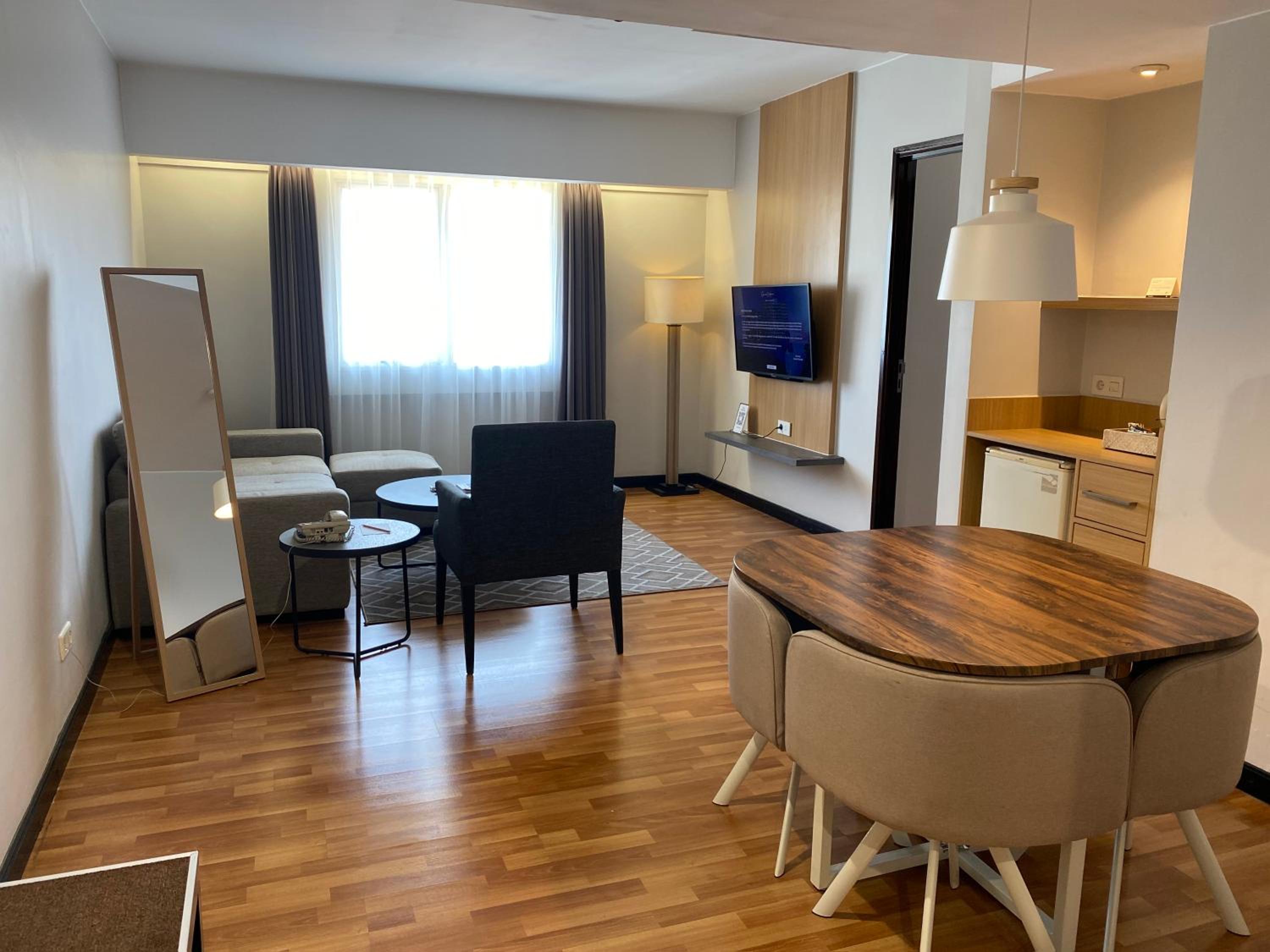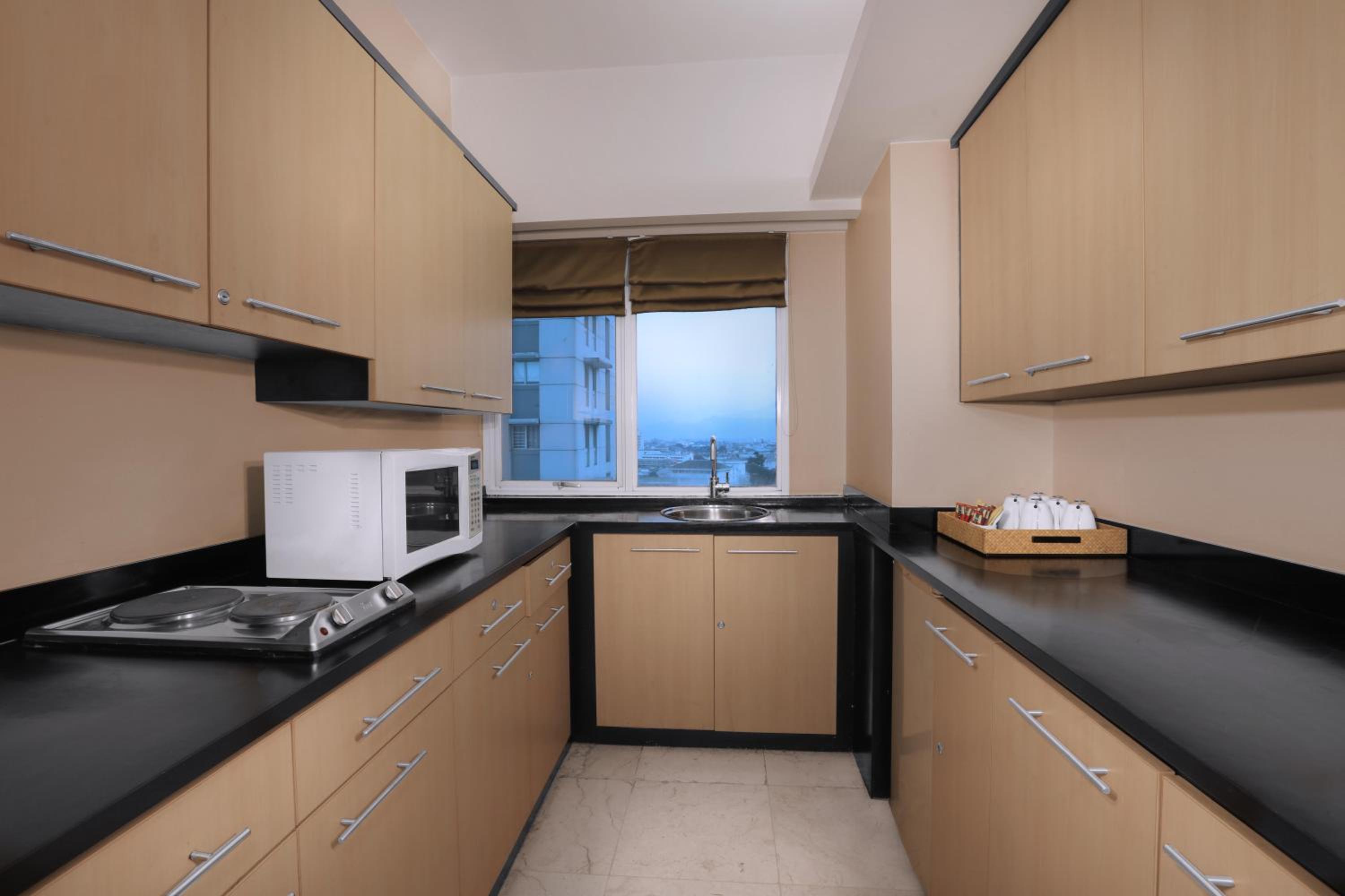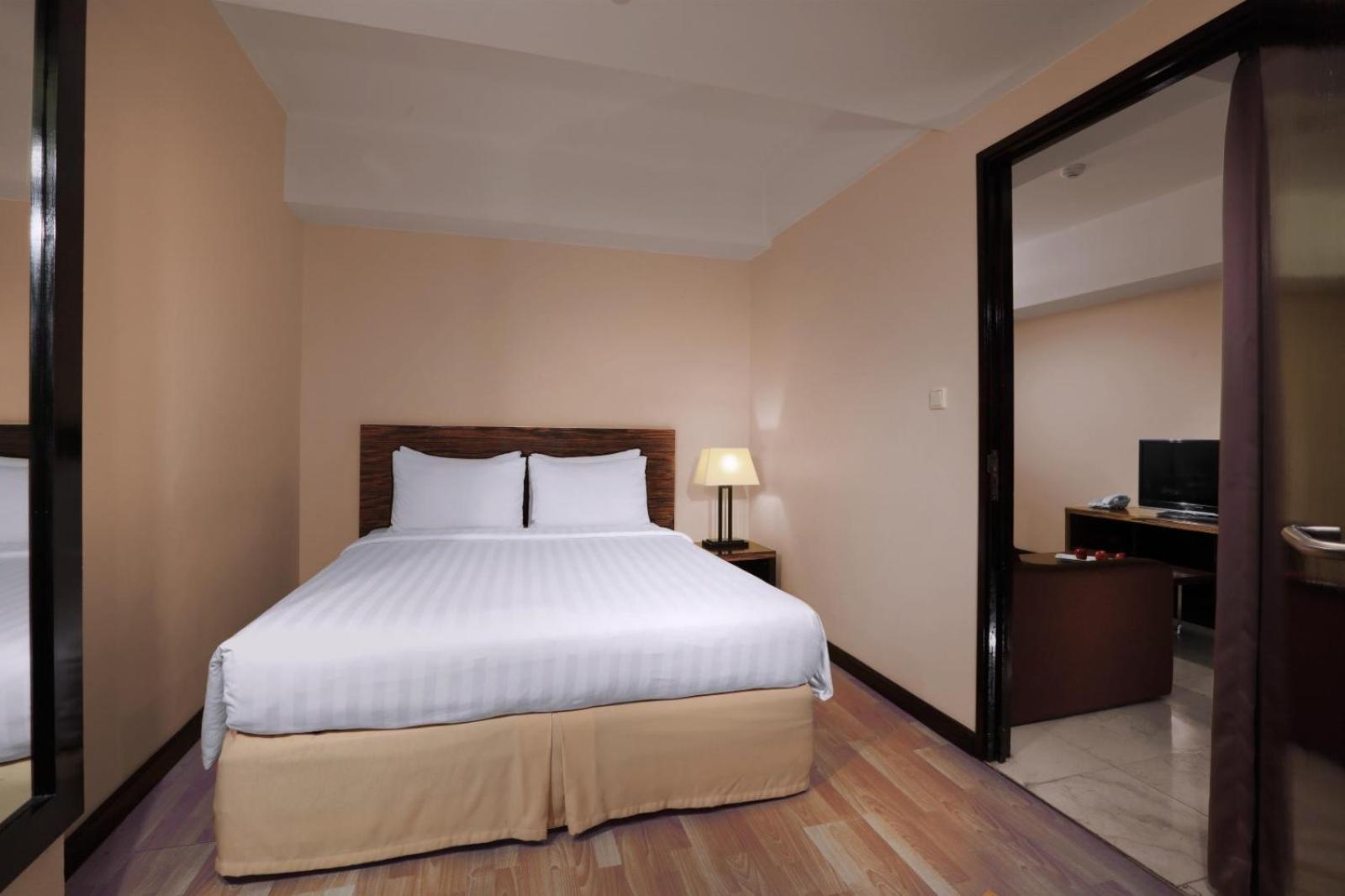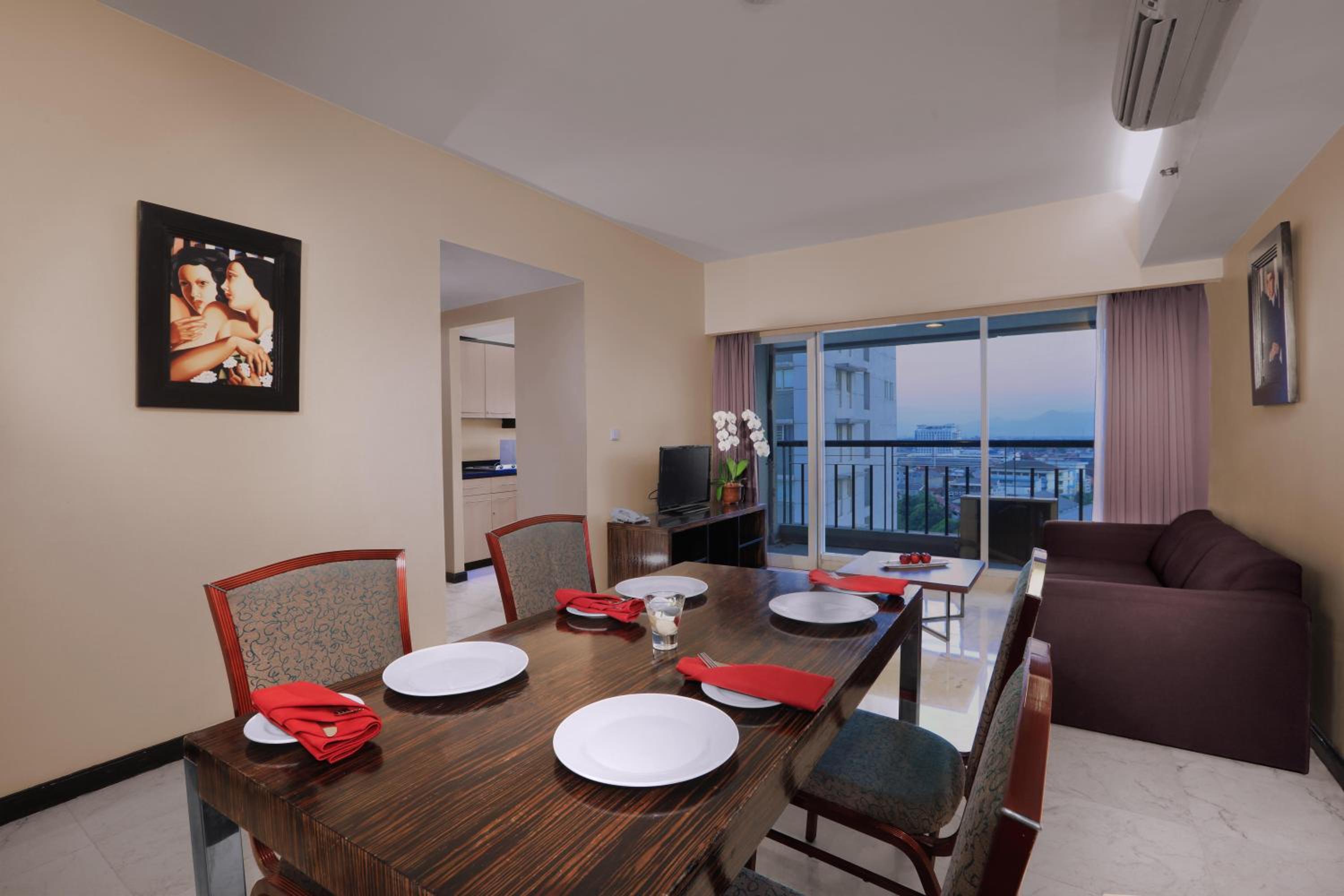 Grand Dafam Braga Bandung offers modern rooms and apartments with free internet. The elegant rooms are decorated with pleasant neutrals and modern dark wood furnishings. Apartments feature fully furnished kitchens and spacious seating areas with a sofa set.