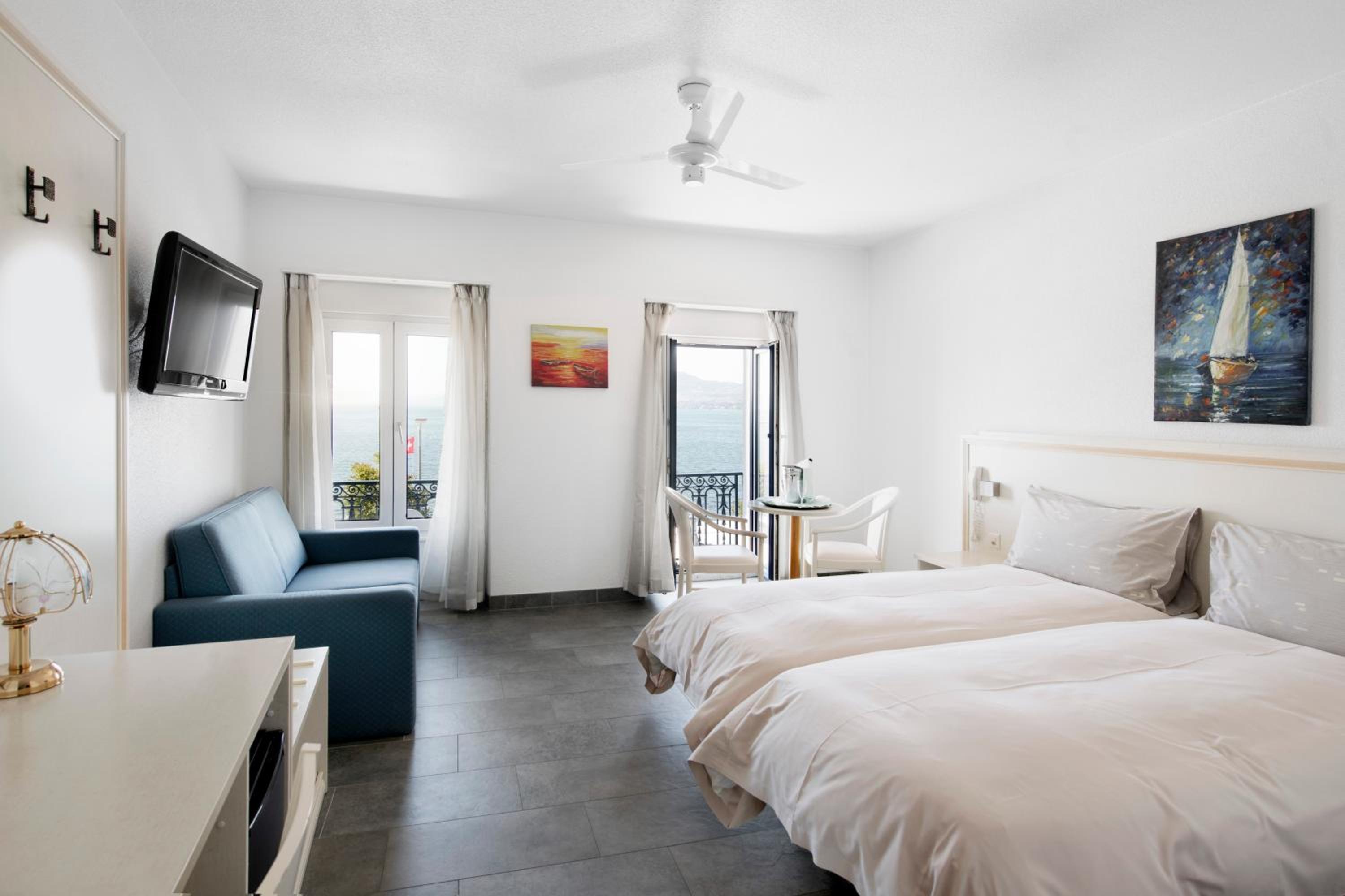 Hotel du Port in Villeneuve offers a stunning setting right on the shores of Lake Geneva. Indulge in international cuisine at the on-site restaurant or unwind at Le Bar Américain for a delightful aperitif.