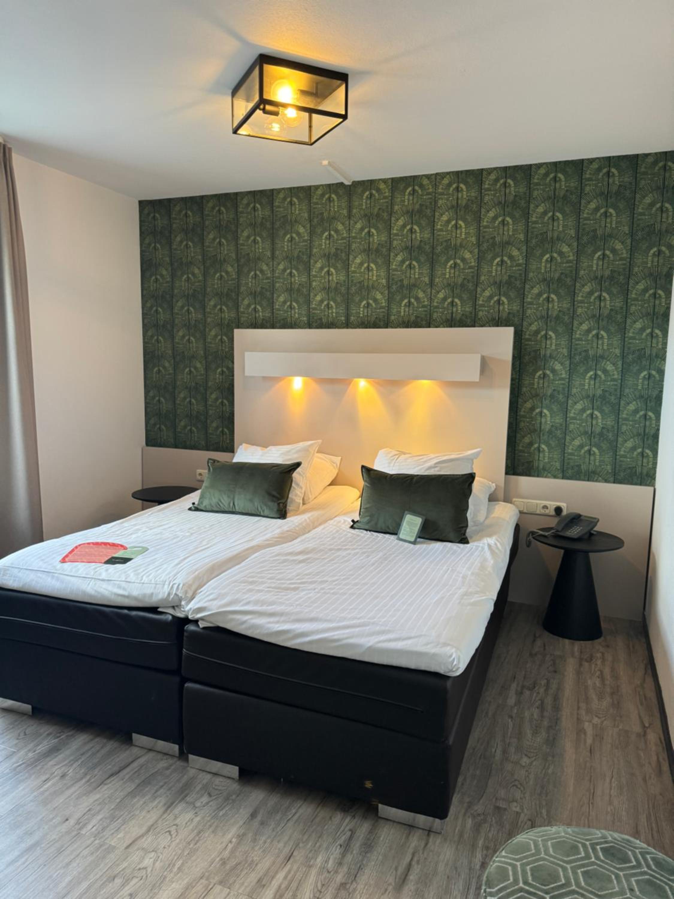 Je hoort in de kamer wil de mensen op de gang lopen en praten, dus een beetje gehorig, maar je hoorde totaal niets van buiten zodra het raam dicht ging. 2 verschillende kussens op het bed, maar beide niet naar onze smaak.