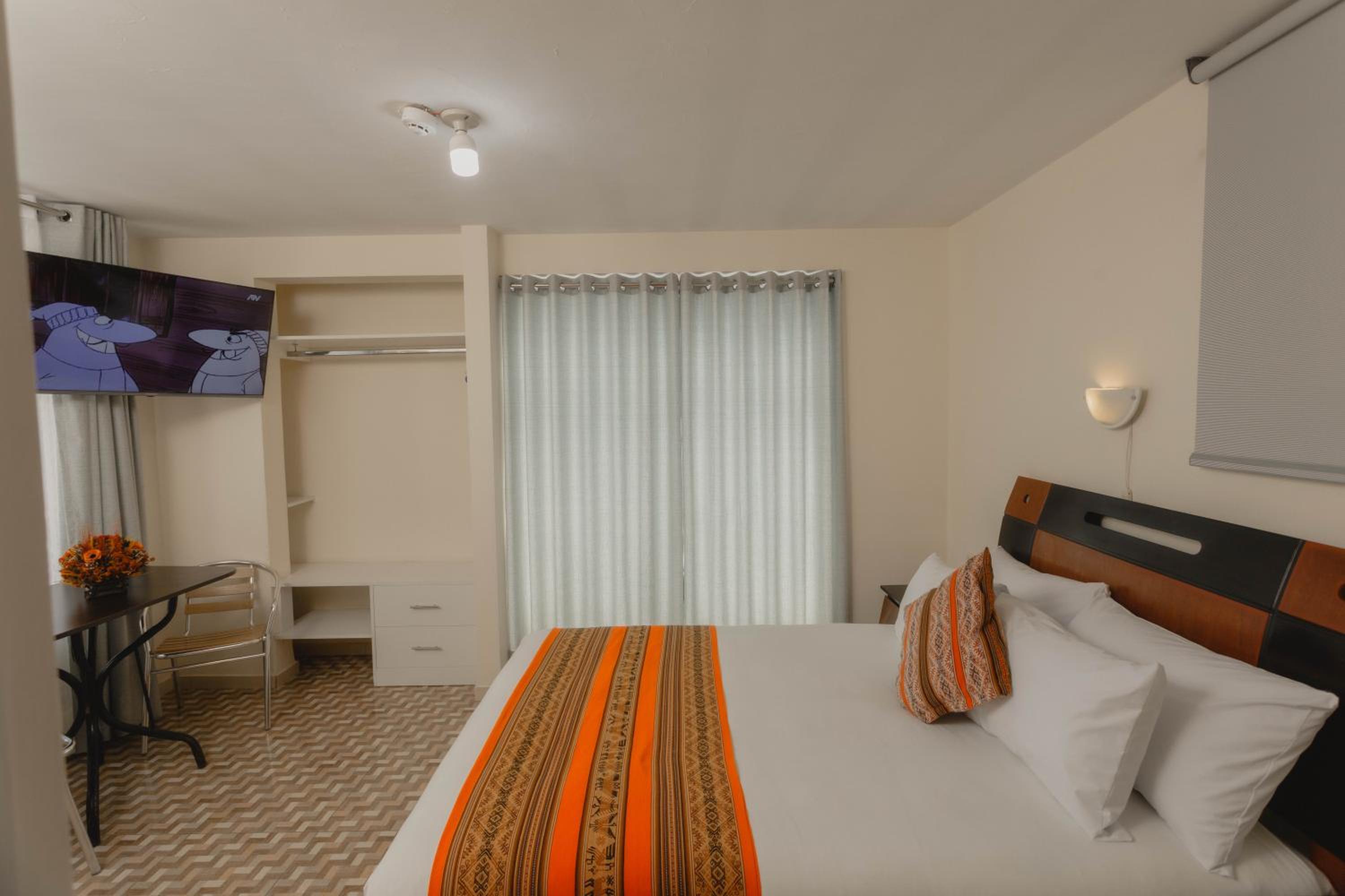 O hotel fica em uma localização muito boa, próximo aí Mercado San Pedro. Particularmente não gostamos de quarto somente com uma janela sem vista, então encontramos esse hotel que tinha quarto, banheiro, cozinha equipada com frigobar, micro-ondas e sala com sacada. A sacada tinha uma pequena vista interna para o hall do hotel, mas mesmo assim valeu a pena. Lugar simples, a cama era muito boa, banho quente e super limpo. Tinha serviço de quarto todos os dias para troca de toalhas e limpeza do banheiro. O café da manhã tinha bastante opções, como por exemplo: pães, geleia e manteiga, frutas, café, chás. Todo dia tinha omelete e opções de comida salgada, vou citar alguns exemplos porque ficamos 9 dias e o cardápio nunca repetiu. Tinha macarrão com molho vermelho, salsicha, frango com pimentão e cebola, frango com quinoa, várias opções, era quase um almoço no café. Achei super bom porque geralmente as pessoas passeiam o dia todo, então uma refeição dessas ajuda bastante com o estilo de viagem. Nos dias que tínhamos passeios cedo que saía antes do café, o pessoal do hotel preparava um pocket com frutas, suco, bolachinhas e um chocolate para levarmos. A recepção é 24hs e os atendentes são super simpáticos e queridos. Usamos serviço de lavanderia por 2x, você entrega as roupas na recepção de manhã e à noite estão prontas, eles possuem uma lavanderia terceirizada que levam as roupas para lavar a serviço do hotel, o preço é bem acessível. O hotel é silencioso à noite, fica em um ponto muito bom, umas 3 quadras da Plaza de Armas. Tem um mercado quase na esquina. Gostamos muito da estadia e no check-out pela manhã fizeram a gentileza de guardar nossas malas, pois a Latam cancelou nosso voo e remarcou para a noite, não tínhamos como sair com as malas, eles guardaram para nós até o horário do voo e nos deixaram ficar na recepção, carregar celular e usar o banheiro também enquanto estávamos esperando.