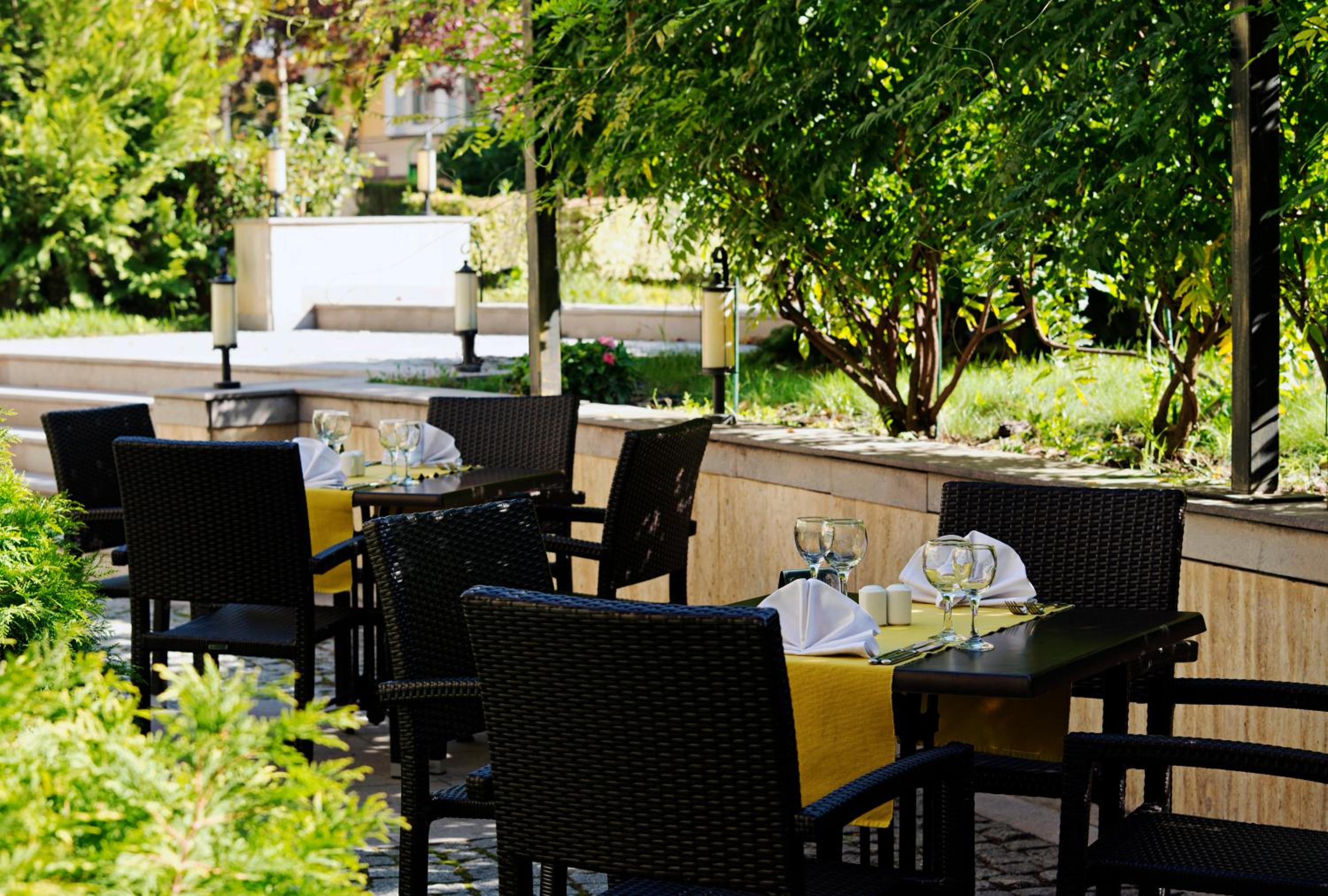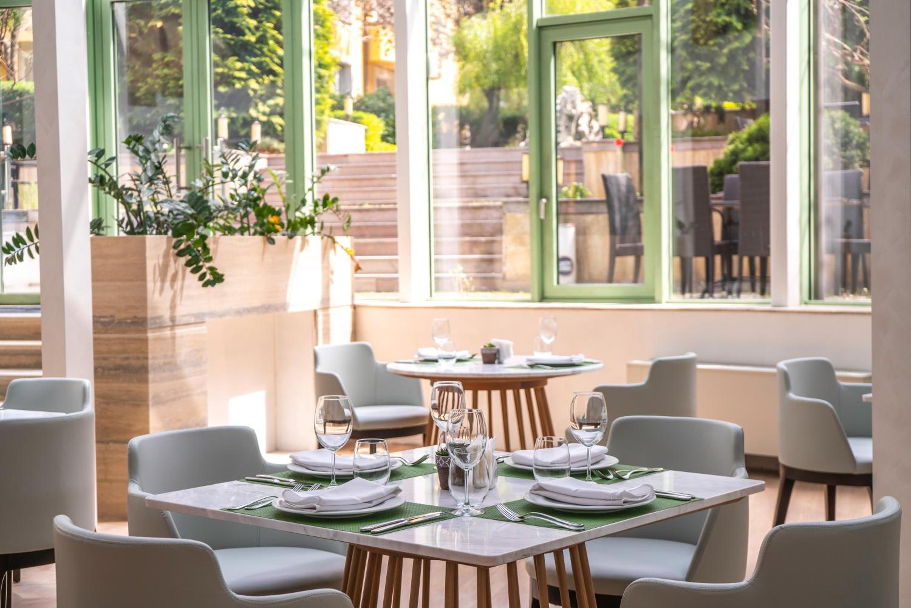 Indulge in international cuisine at Restaurant Maison, featuring natural daylight and outdoor seating in the garden, perfect for a delightful dining experience during your stay.