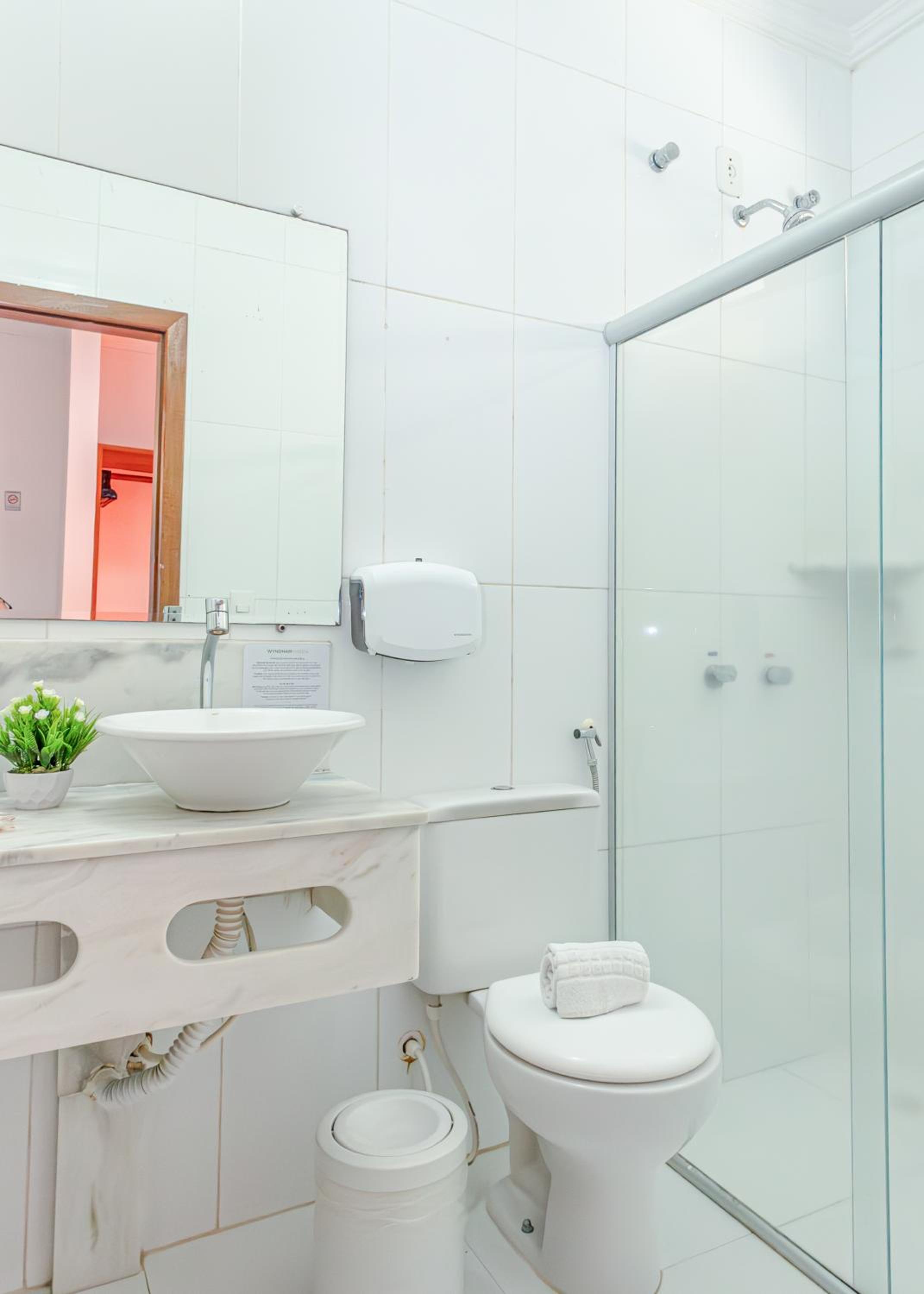 O quarto poderia ter melhorias, falta de tomadas, apenas uma disponível no quarto, banheiro, precisa de melhores cuidados, box não estava bom, espelho já desgastado, sem saboneteiras.