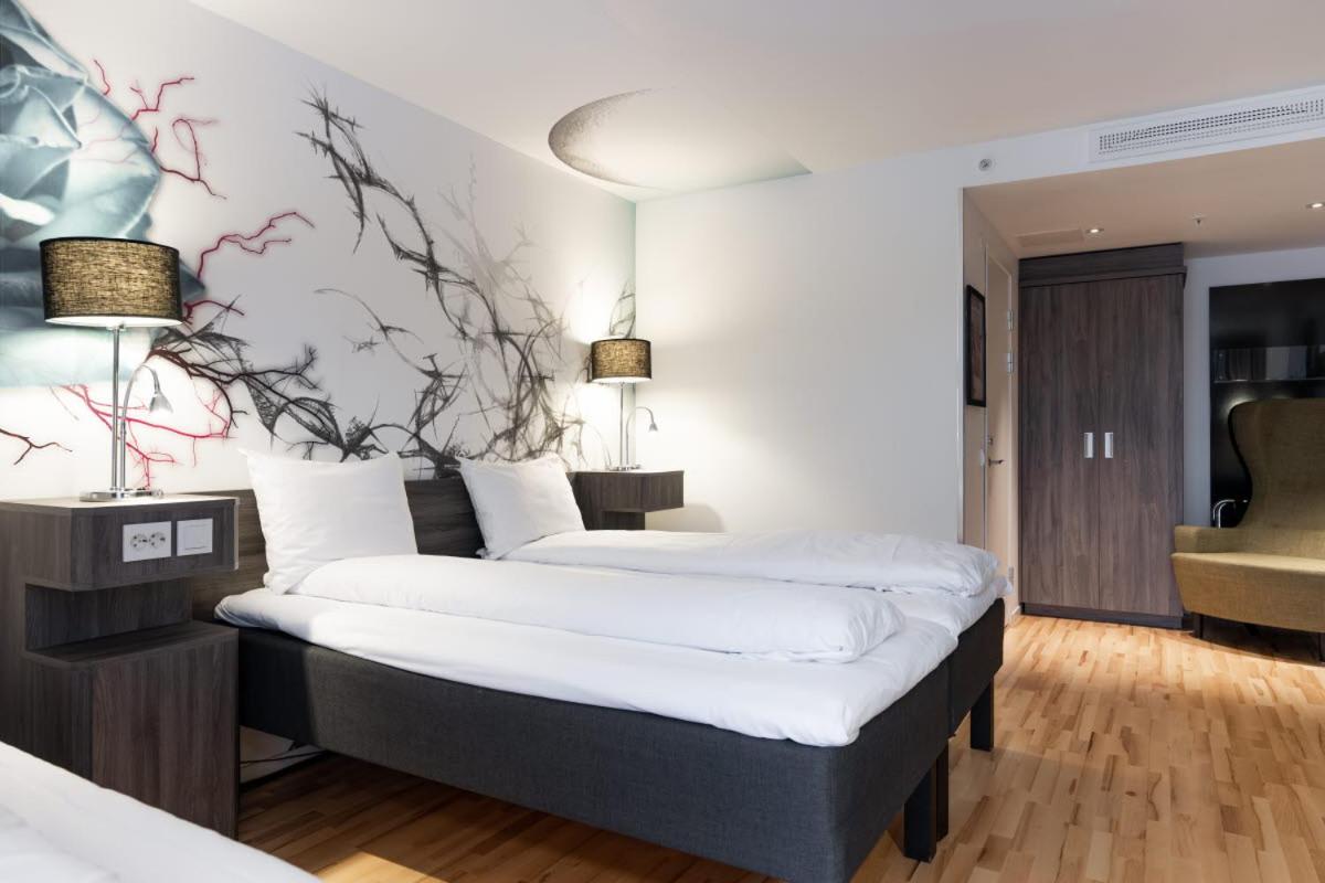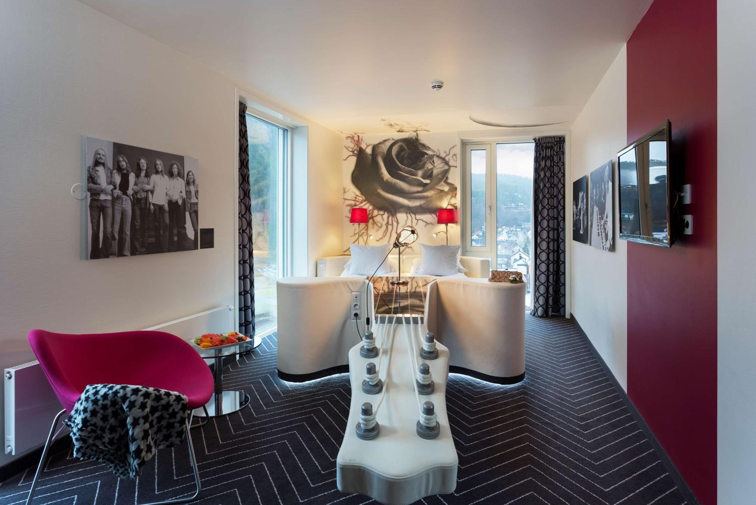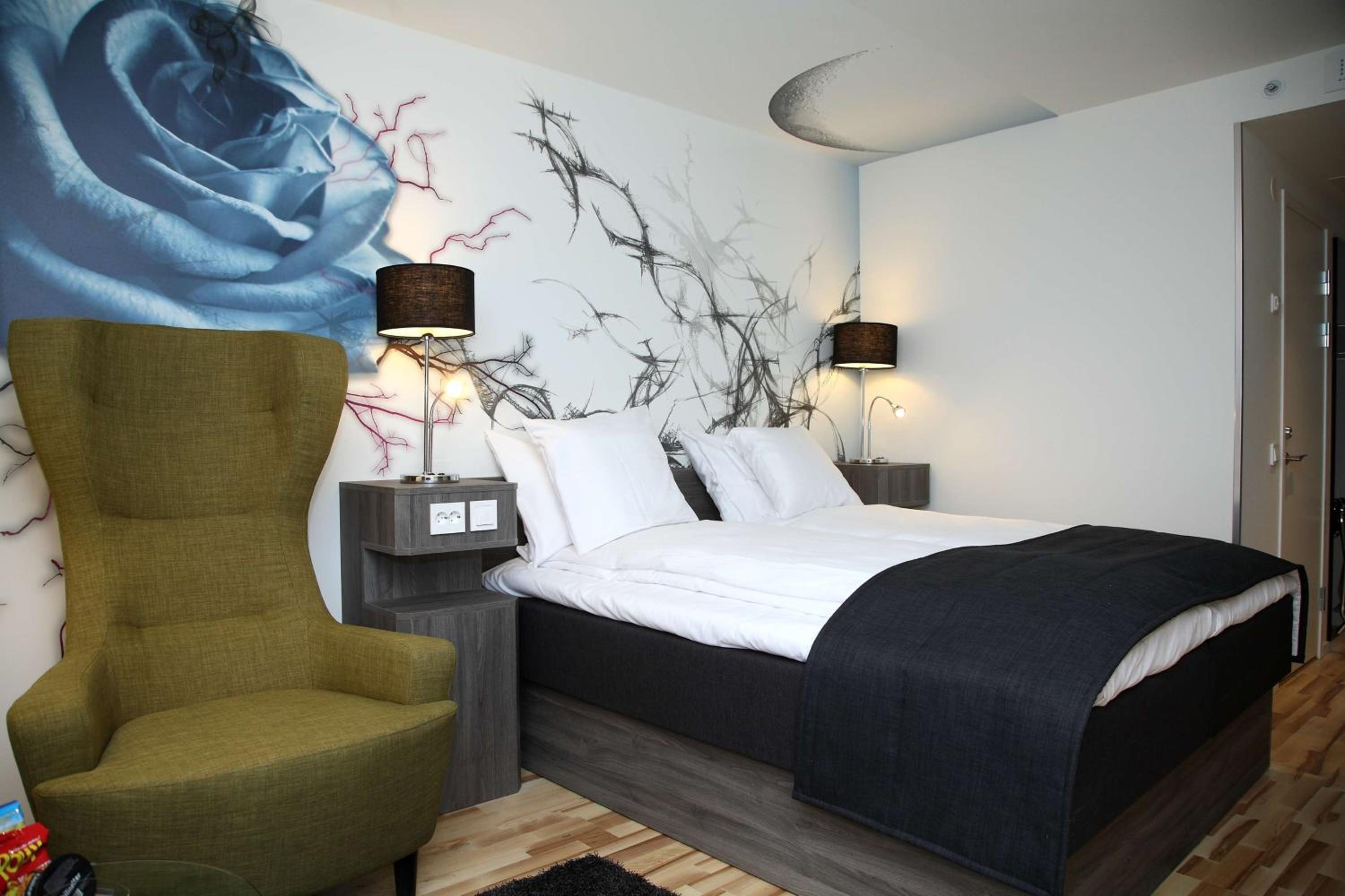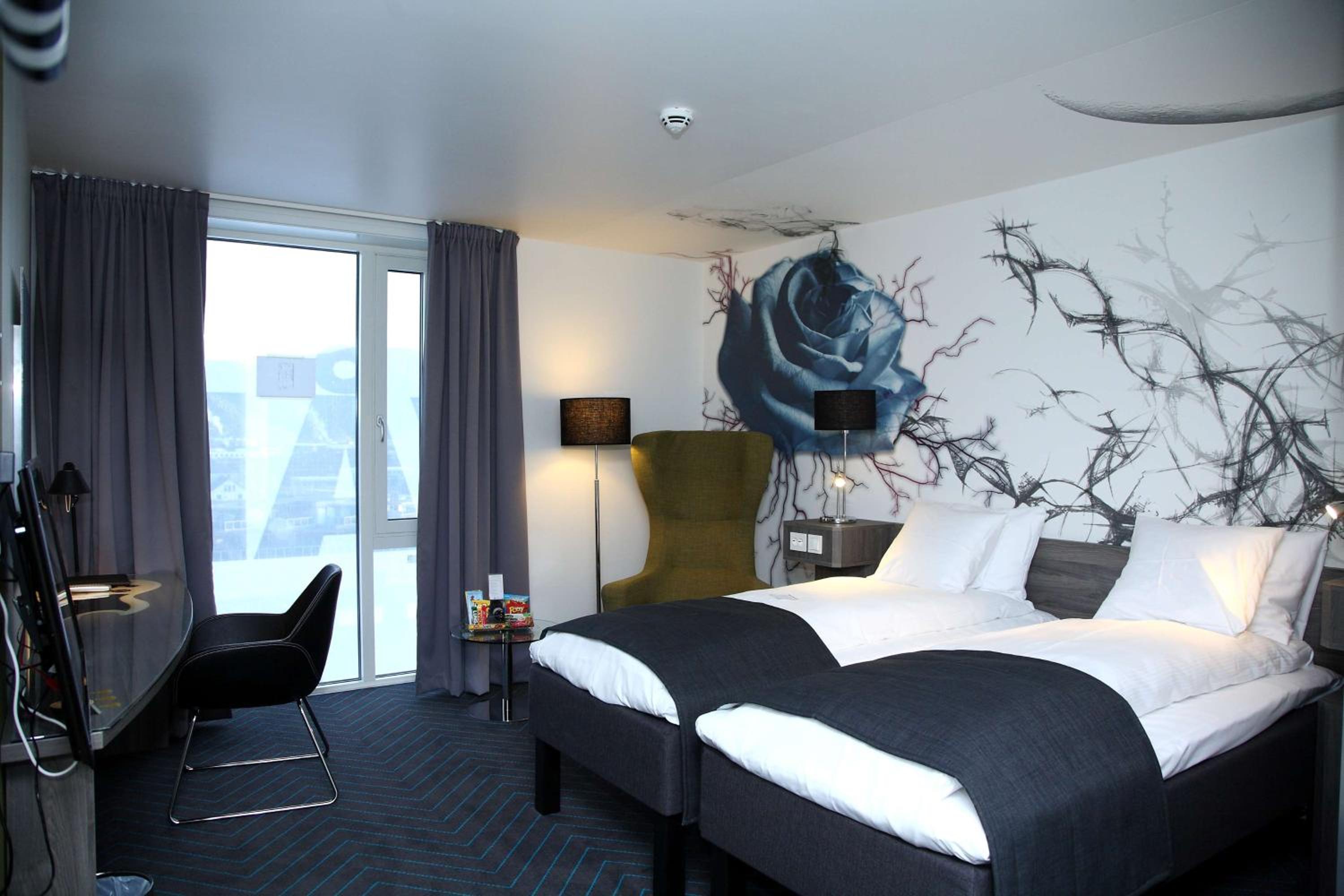 Experience the unique charm of Scandic Rock City Hotel's modern guest rooms adorned with music-themed décor. Each room is equipped with a flat-screen TV, minibar, and a private bathroom with a shower, ensuring a comfortable stay.