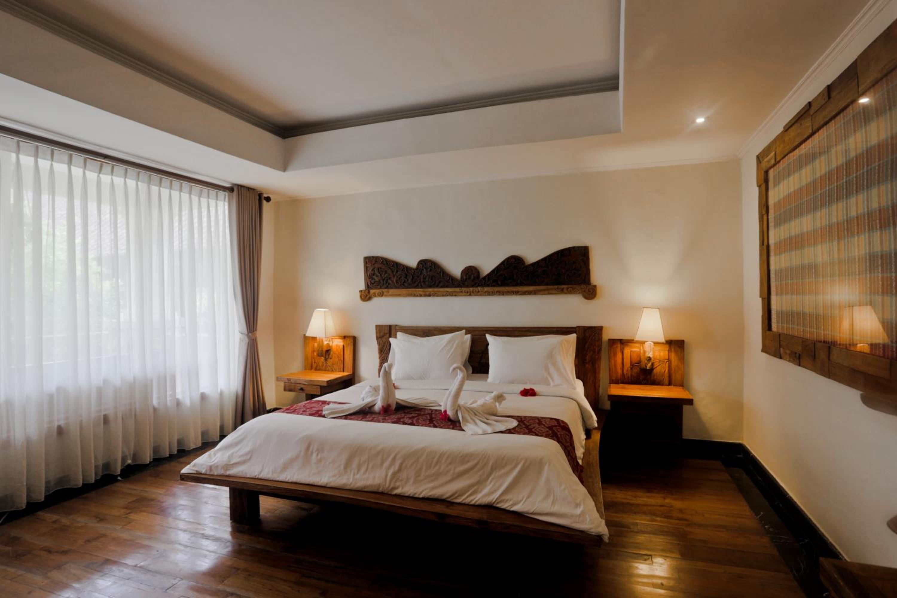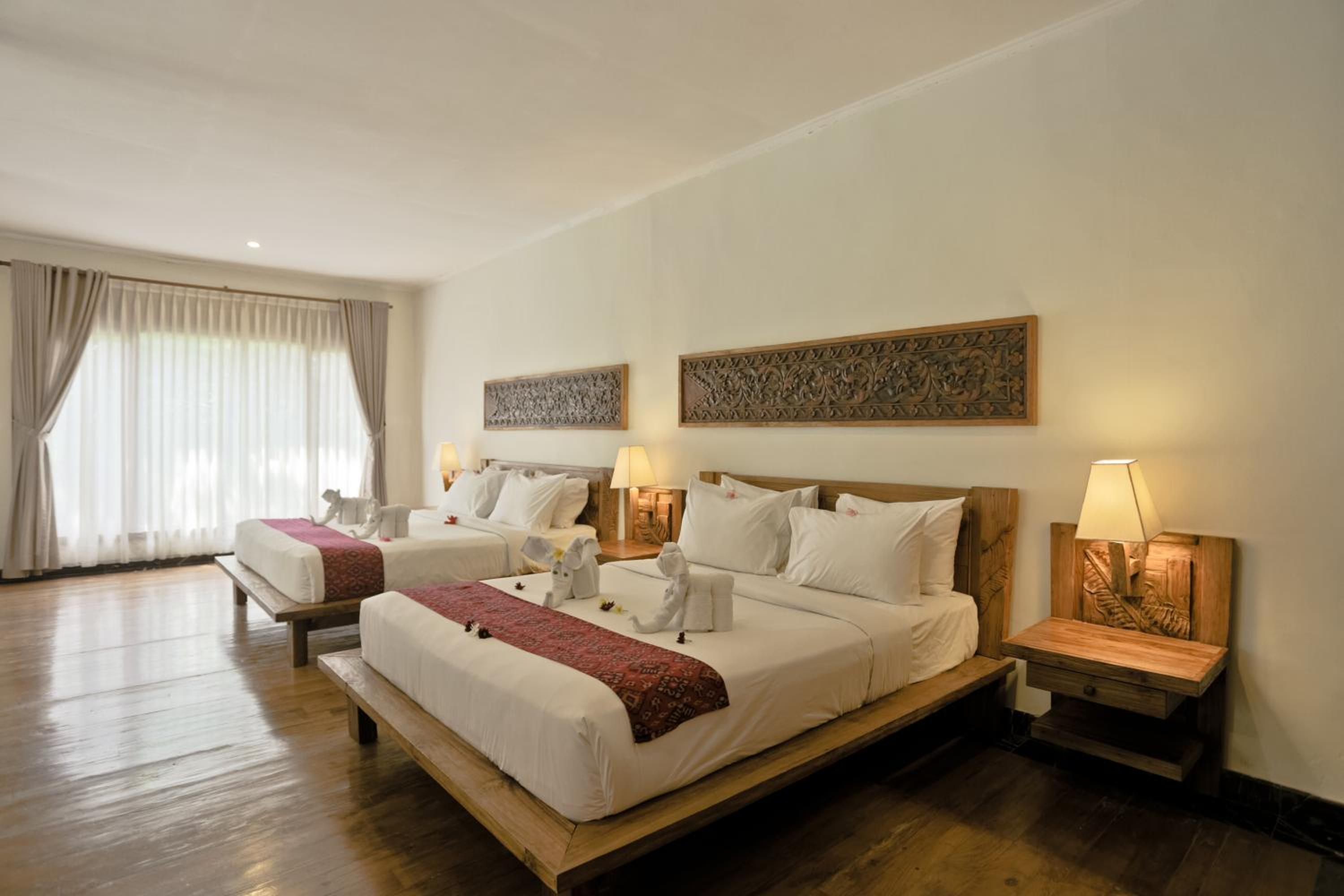 Indulge in the charm of Balinese-style rooms offering serene views of the green surroundings and a private balcony. The spacious rooms with carved wood furnishings provide a comfortable stay.