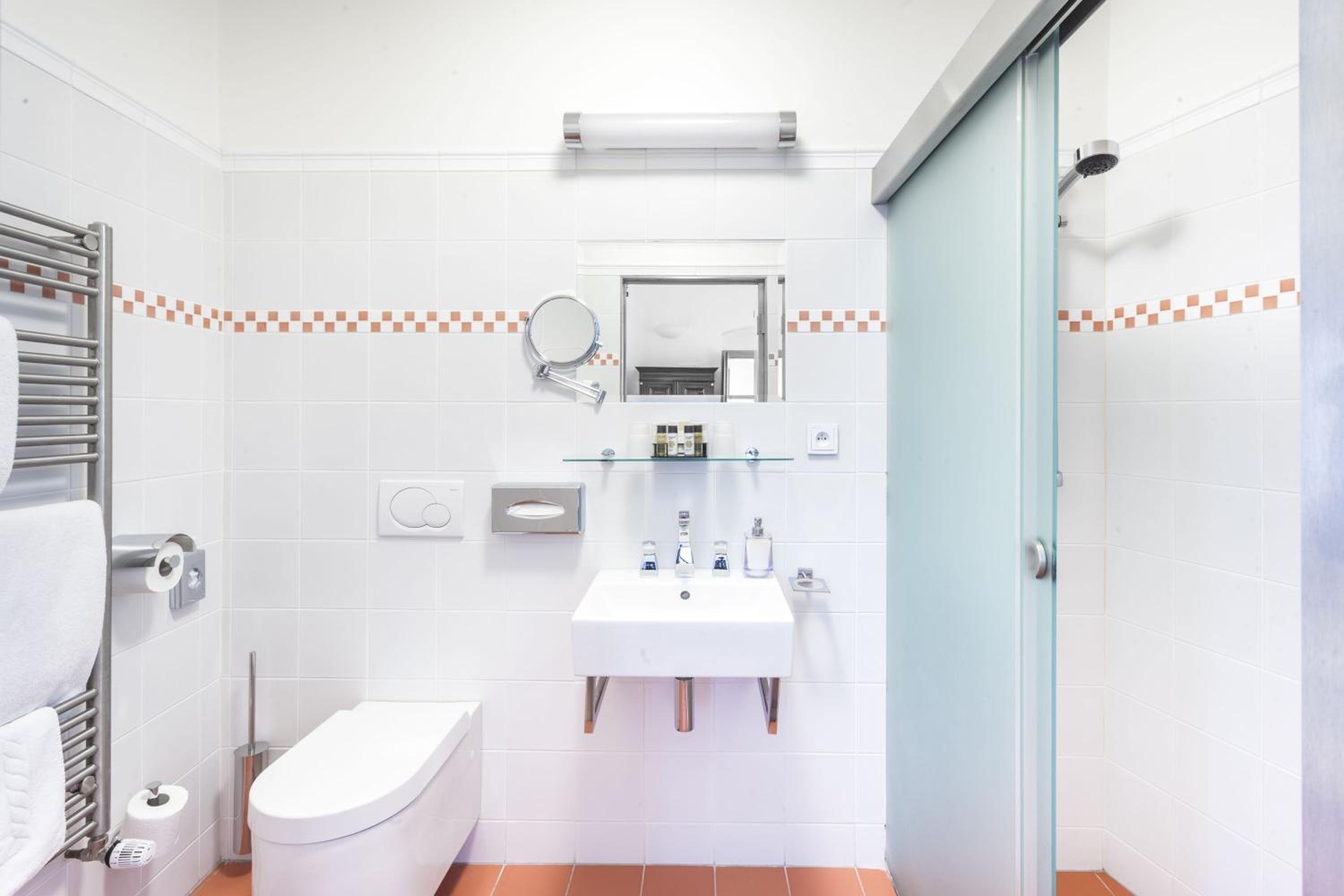 ein Duschvorhang an der Badewanne wäre wünschenswert