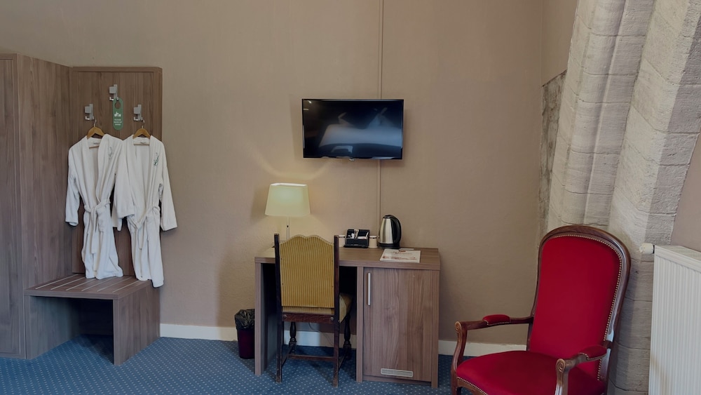 Chambre spacieuse, grande salle de bain avec baignoire et douche, wc séparé, vestiges du château visibles dans la chambre, un espace salon agréable avec télé, lit kingsize, bouilloire, beaucoup de rangements, literie confortable, très bon accueil.