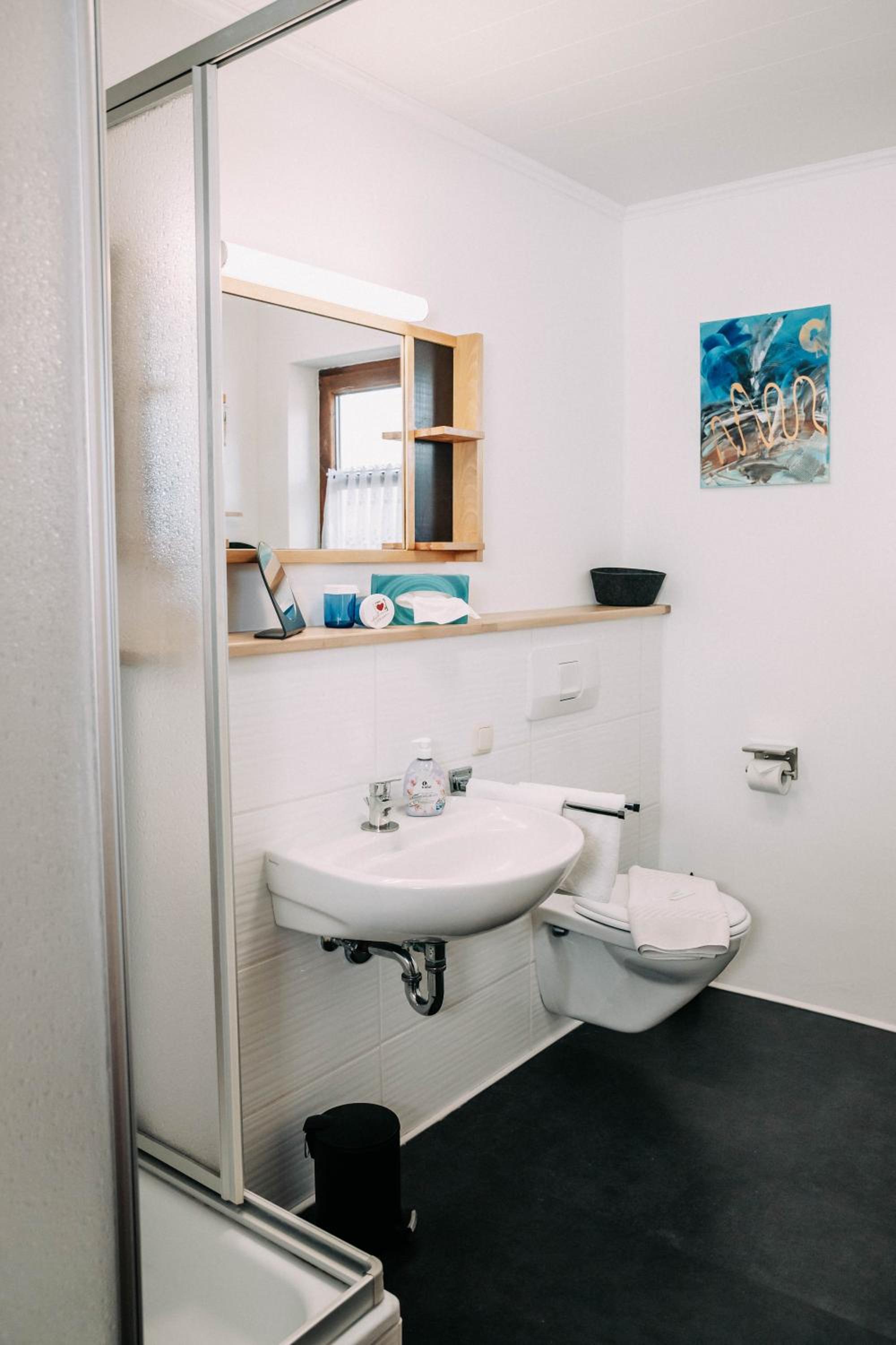Das Zimmer war sehr gemütlich und das Badezimmer angenehm groß. Rund ums Haus Natur pur. Ein herrlicher Ausblick ins Grüne. Das Frühstück war sehr gut und es gab eine große Auswahl. Wir kommen sicher wieder.