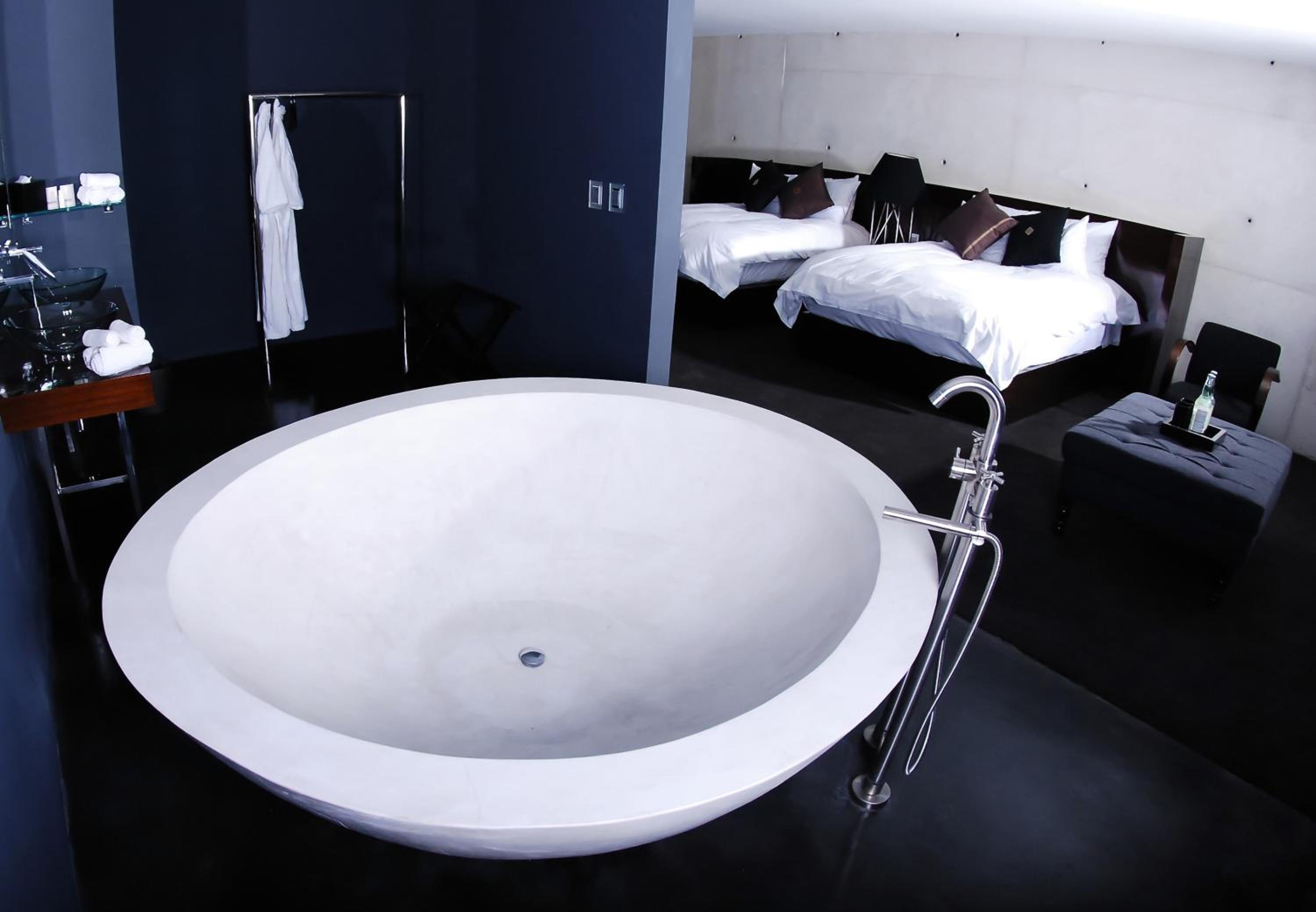 - The room designs are bizarre and vary wildly. E.g., showers, beds, and toilets right next to each other with no privacy, random dangerous steps you can't see because everything is colored black, giant TV stands protruding in the middle of the room at eye level, no closets or real storage – expect a single exposed clothing rack that could be in the middle of your bathroom.