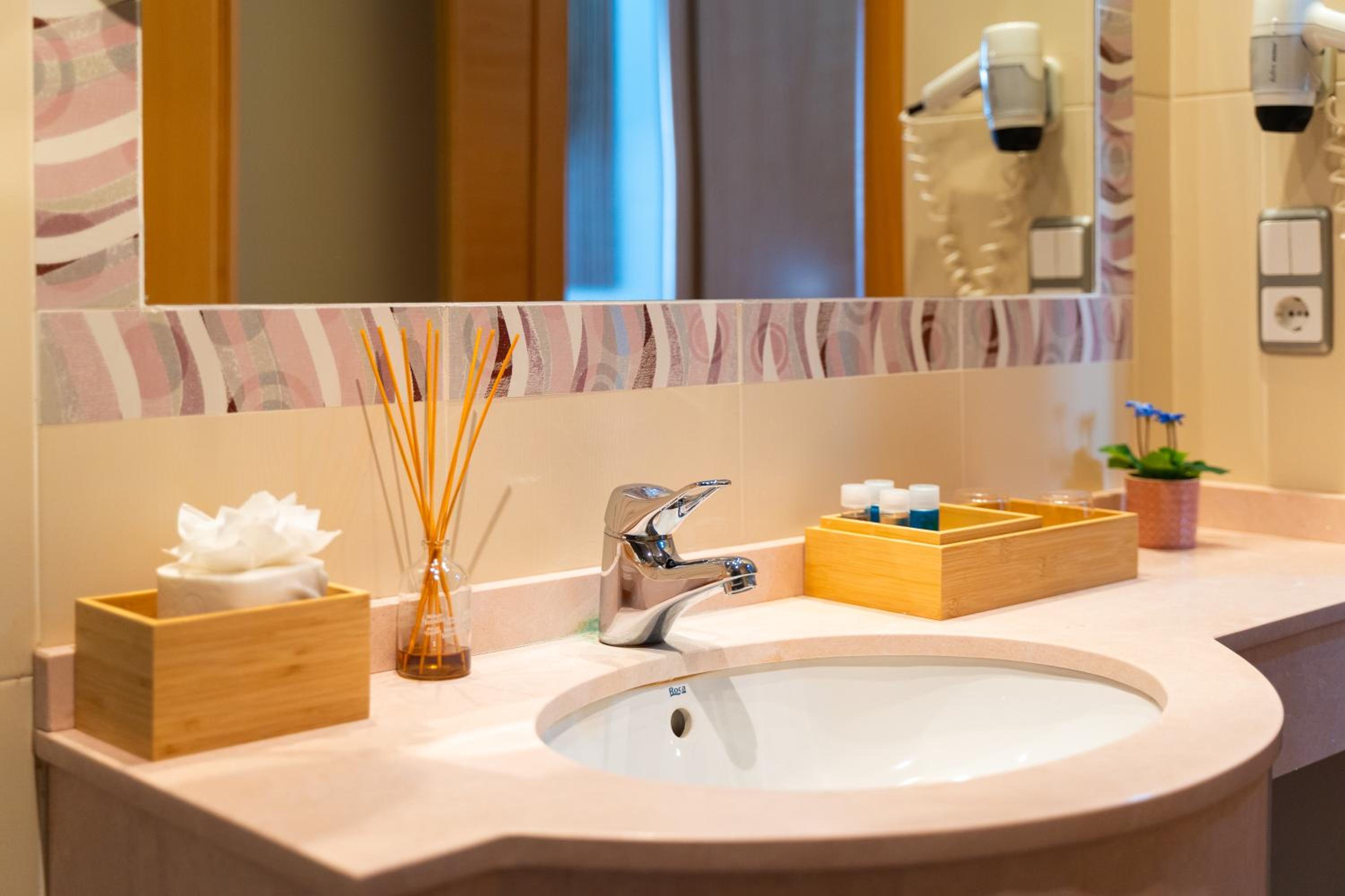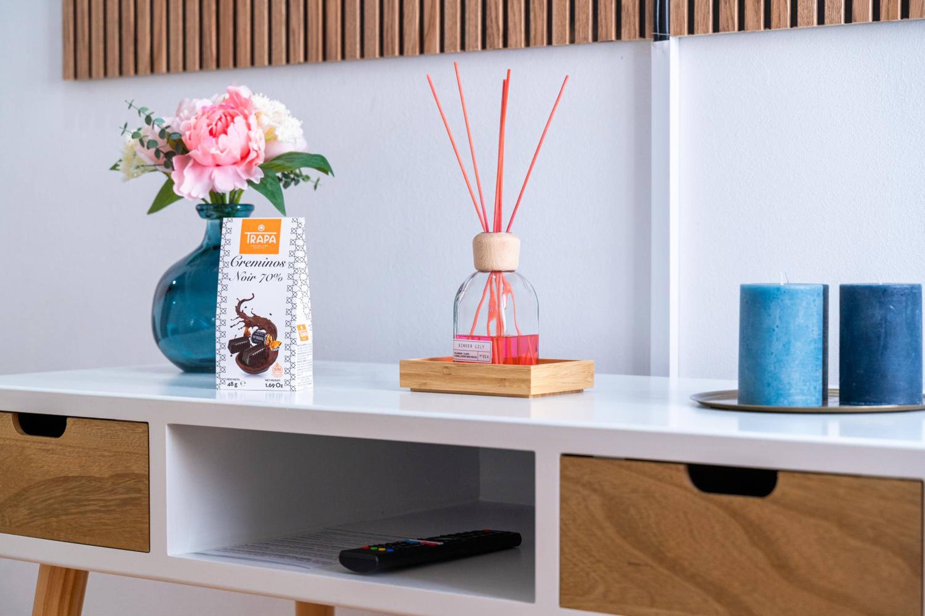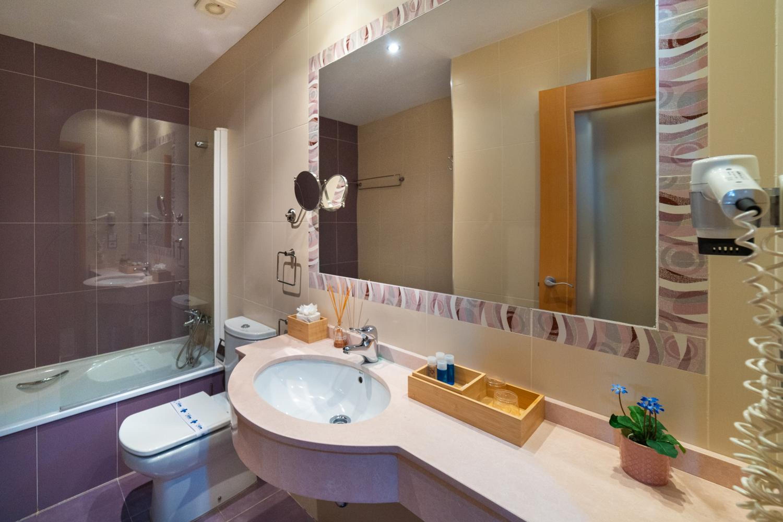 No me gustó nada el ambientador de la habitación y que el florero estuviera pegado con silicona a la mesilla.
