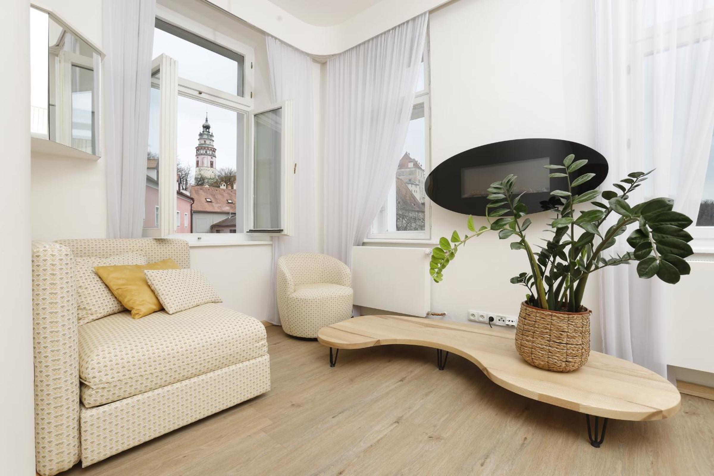 Experience a tranquil stay at Wellness Pension Ametyst, where a private garden terrace overlooks the enchanting castle and tower of Český Krumlov.
