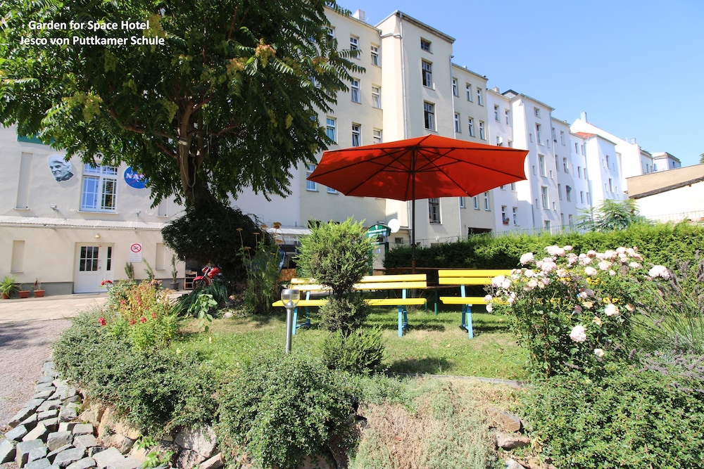 Indulge in the picturesque views from the terrace and garden at Space Hotel - Campus der Jesco von Puttkamer Schule. Embrace the tranquility and beauty that surrounds you during your stay.
