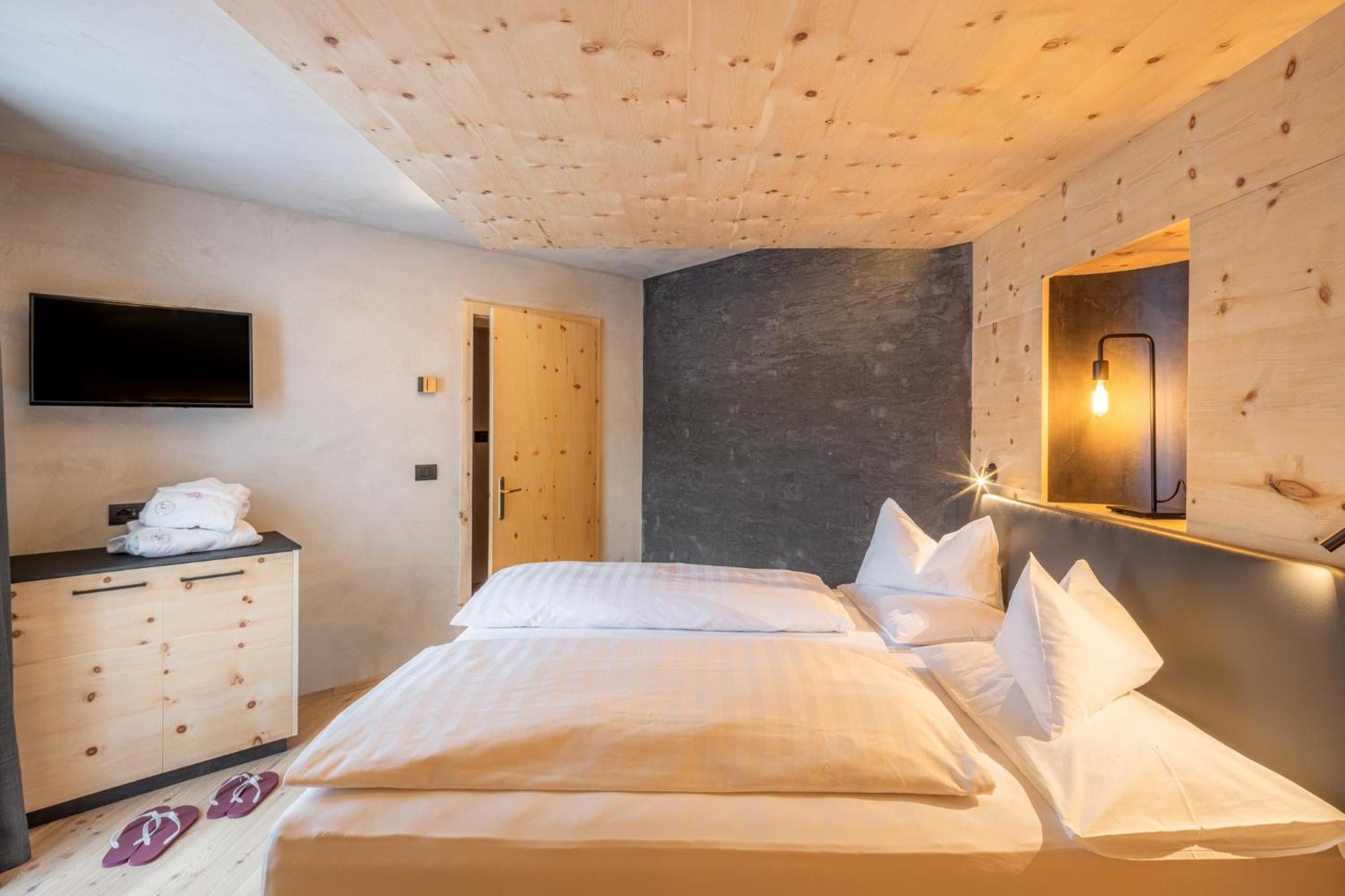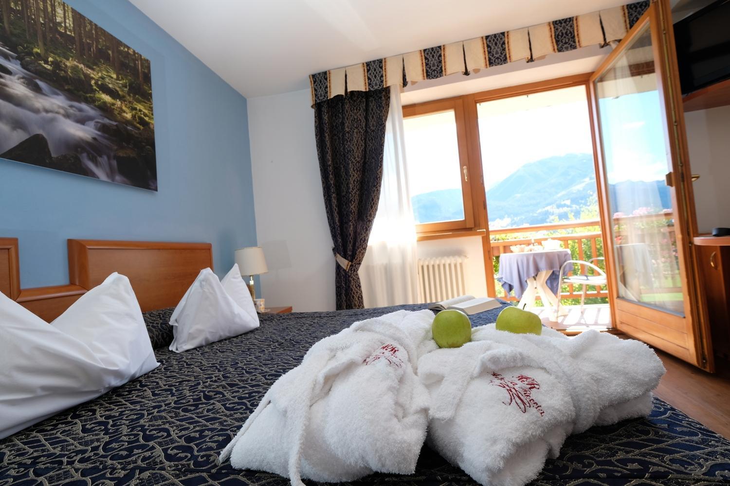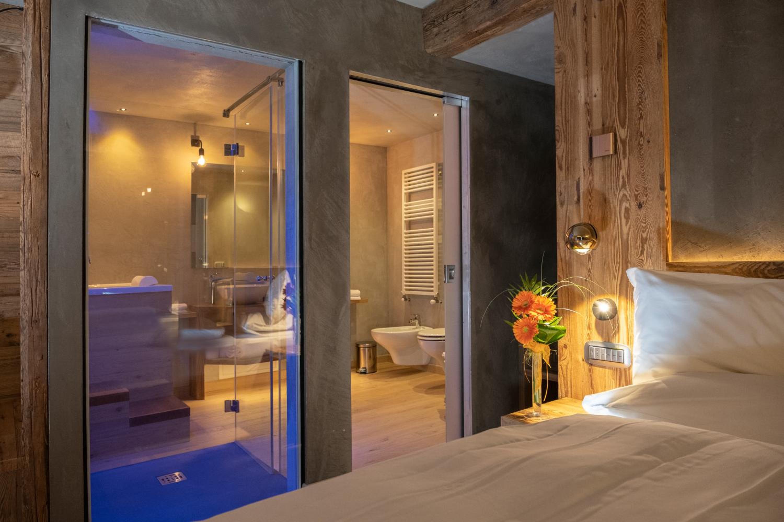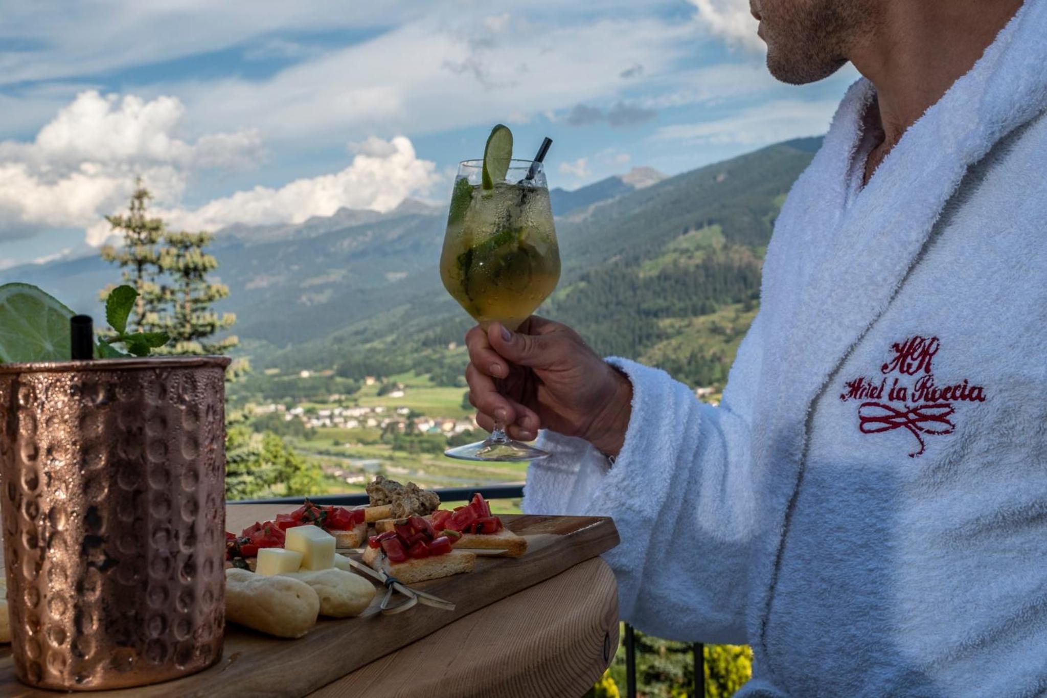 La Roccia Wellness Hotel offers spacious rooms and luxurious suites with balconies, some showcasing stunning valley views. Indulge in the spa's sauna, Turkish bath, hot tub, and relaxation area with local wood deckchairs.