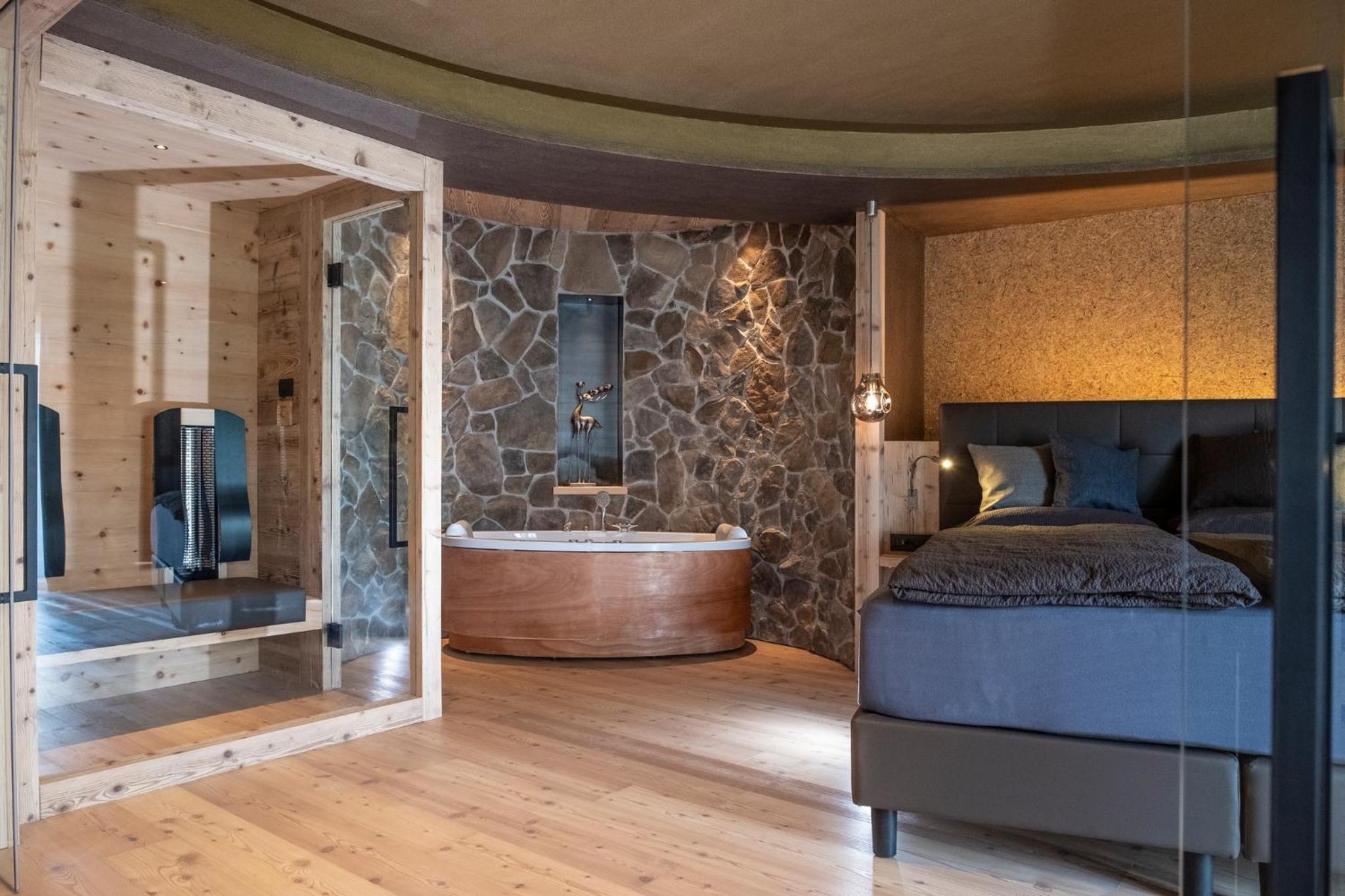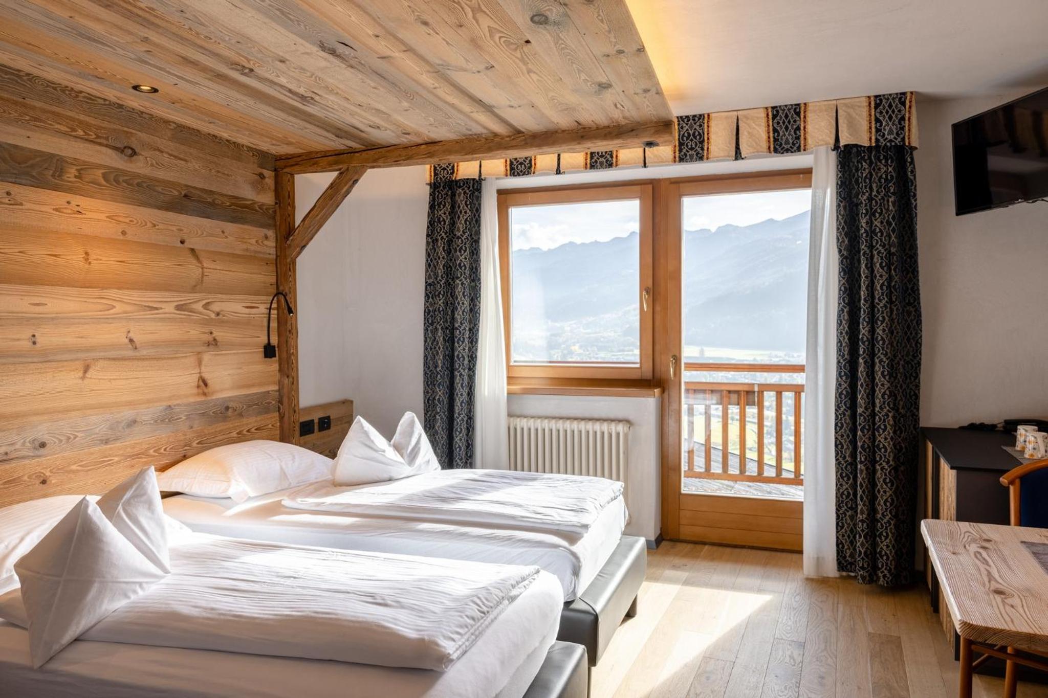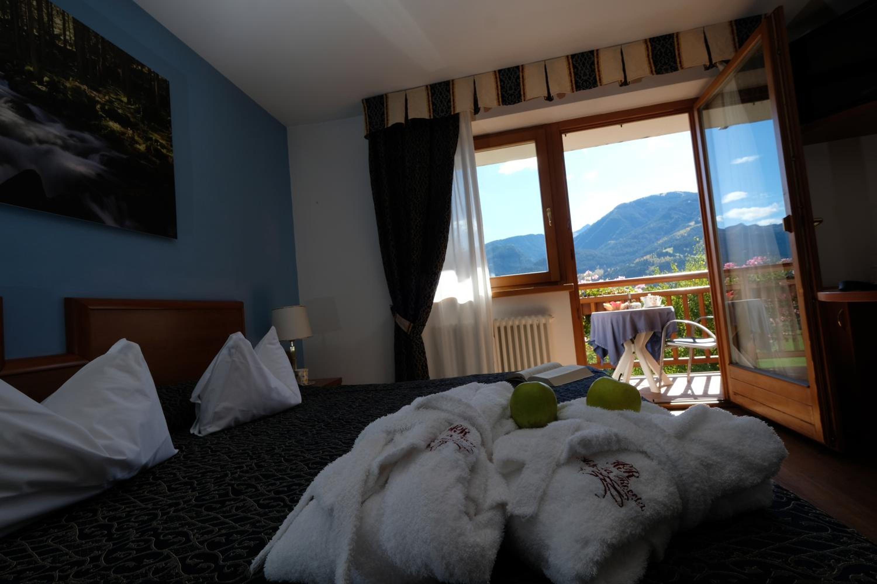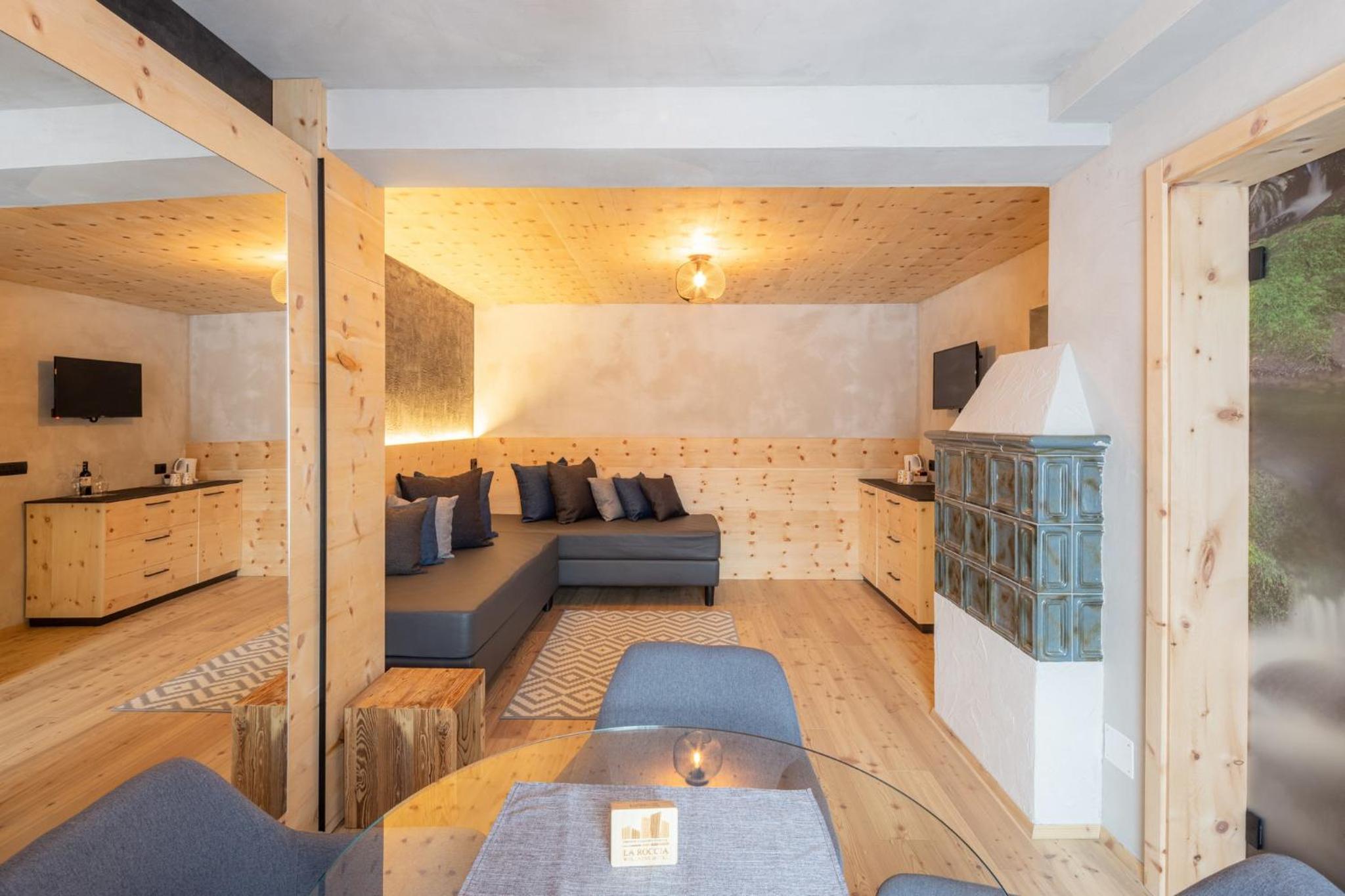 La Roccia Wellness Hotel offers spacious rooms and luxurious suites with balconies, some showcasing stunning valley views. Indulge in the spa's sauna, Turkish bath, hot tub, and relaxation area with local wood deckchairs.