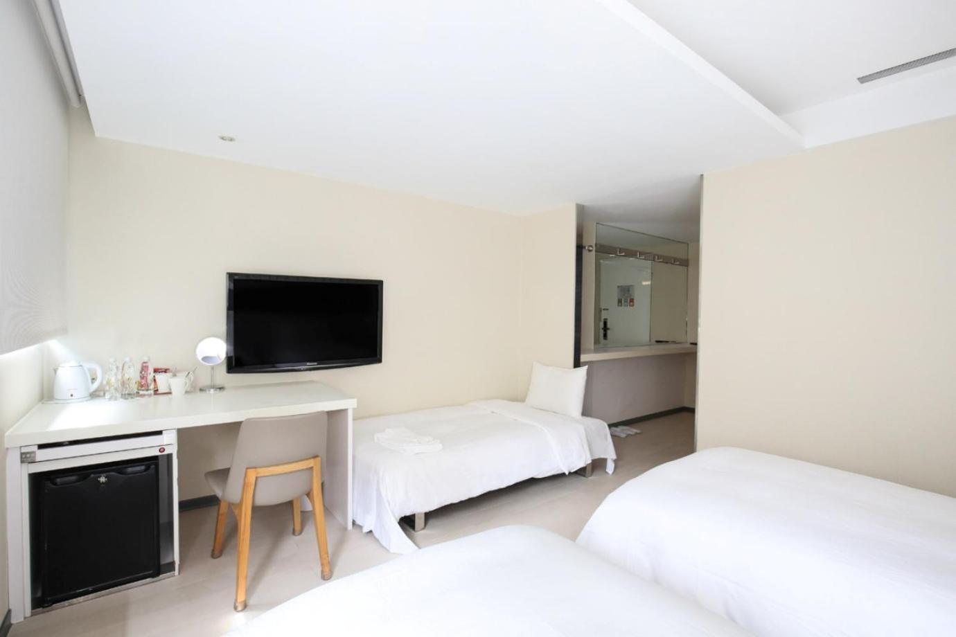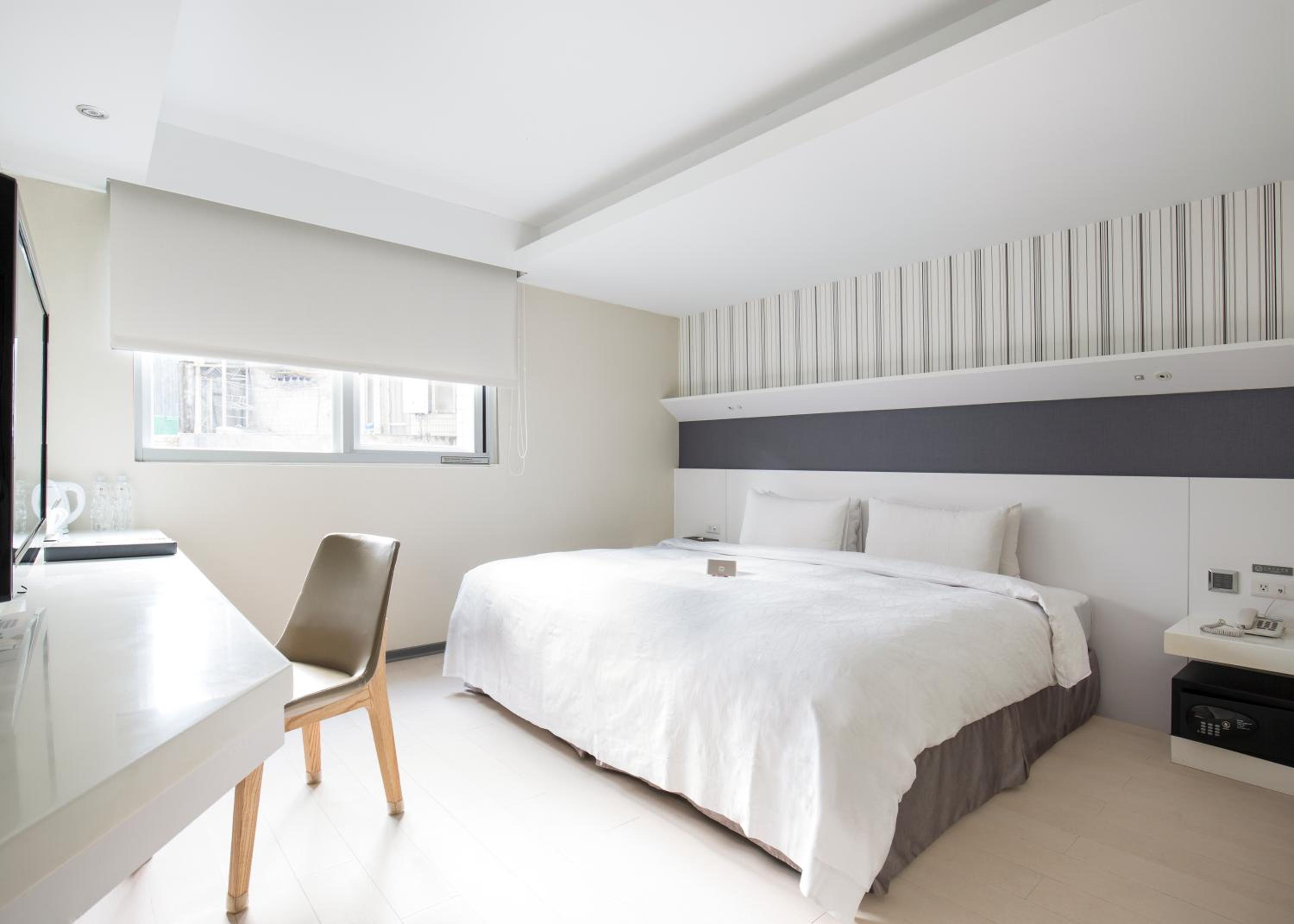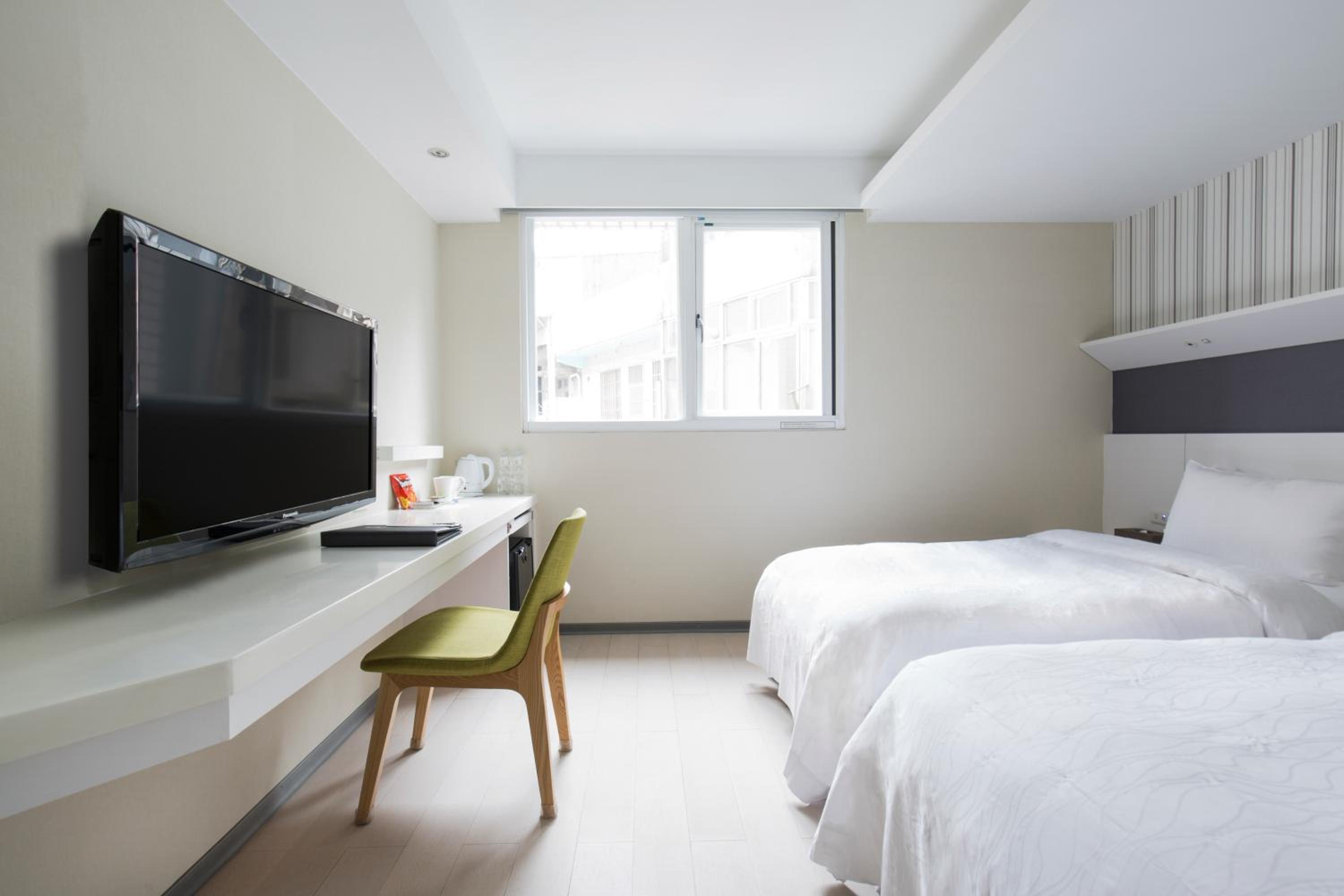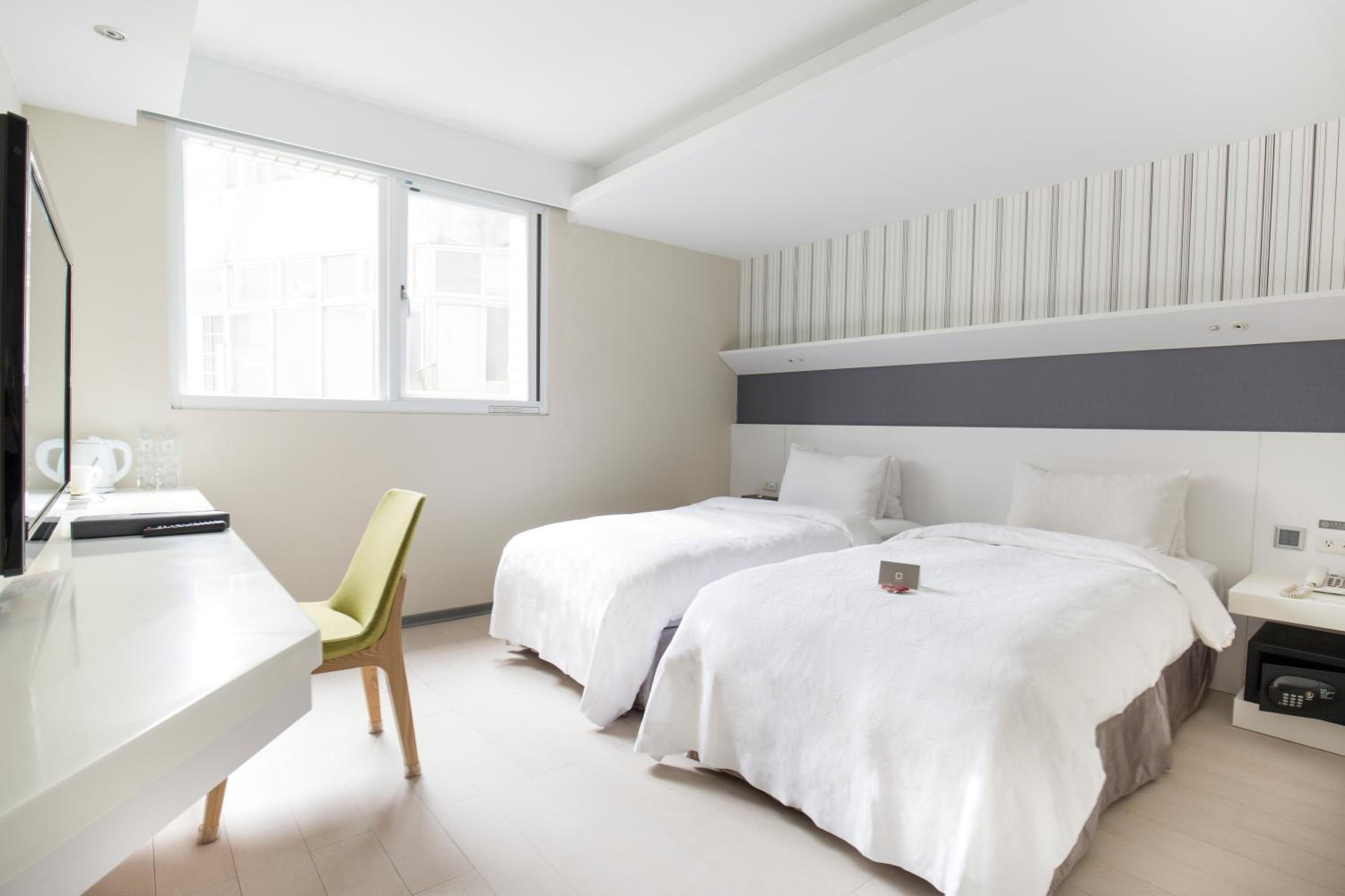 Relax in our air-conditioned rooms featuring stylish white and pale wood decor, spacious work areas, and essential amenities like a fridge and electric kettle. Book your stay at Dandy Tian Mu for a memorable Taipei experience.