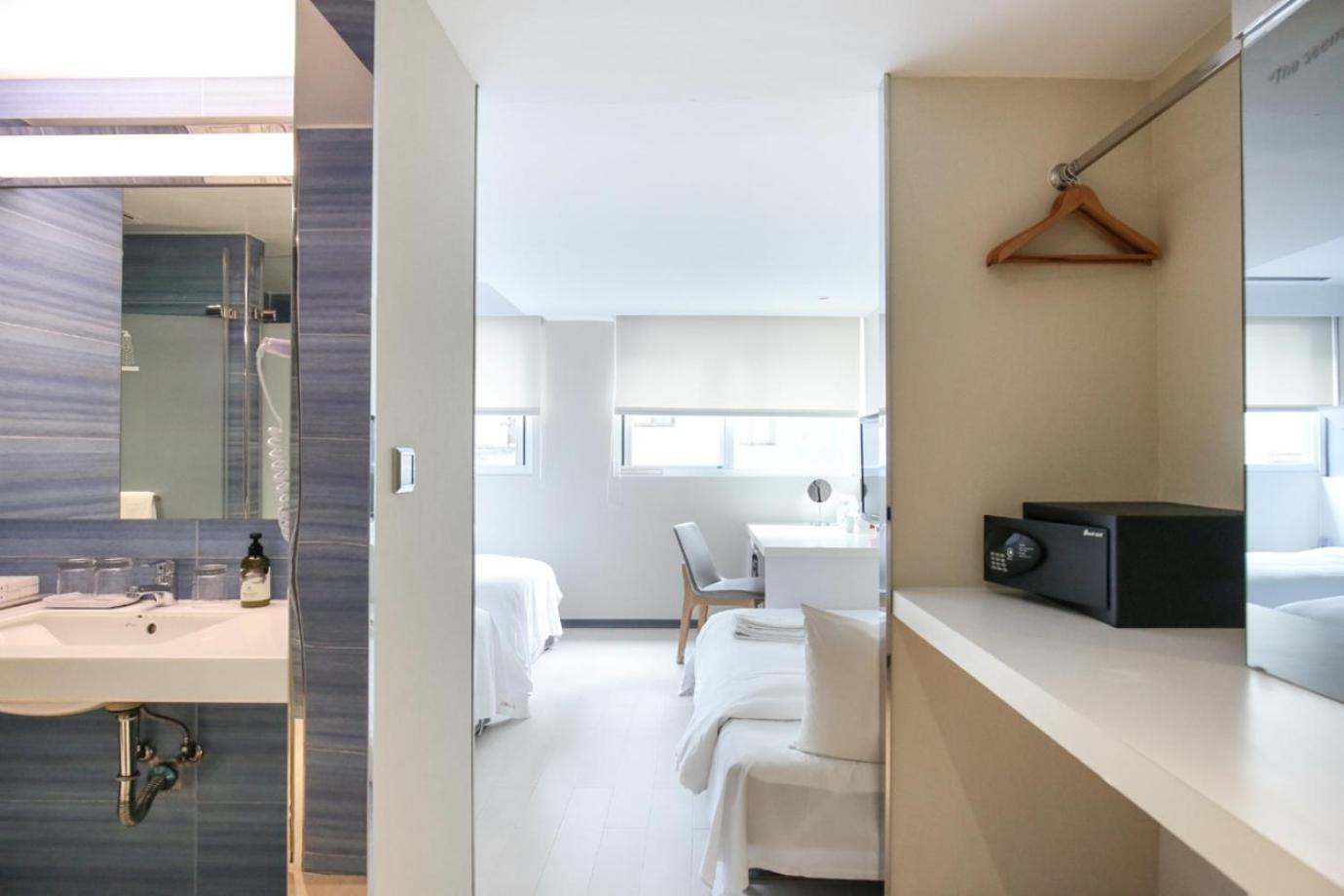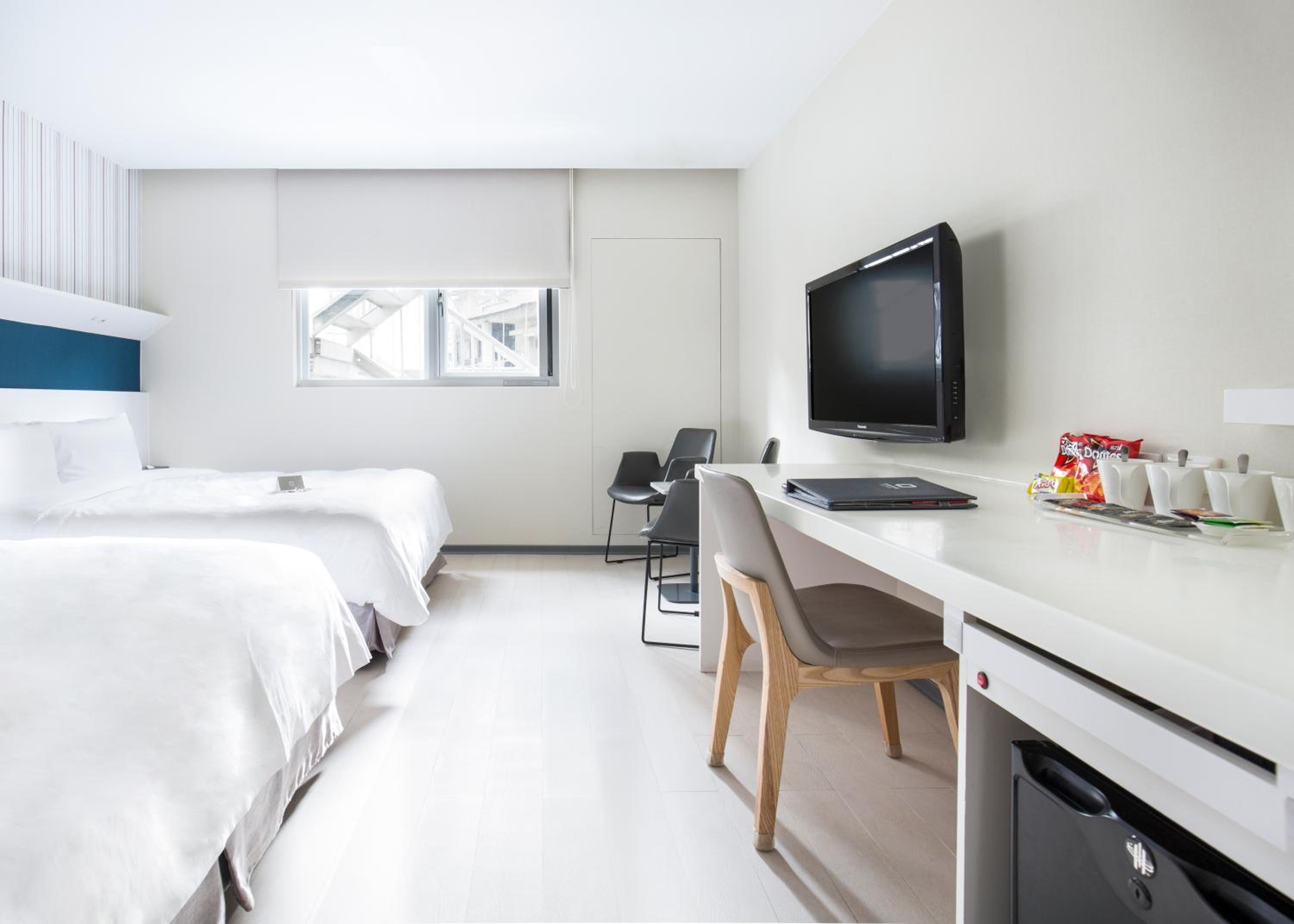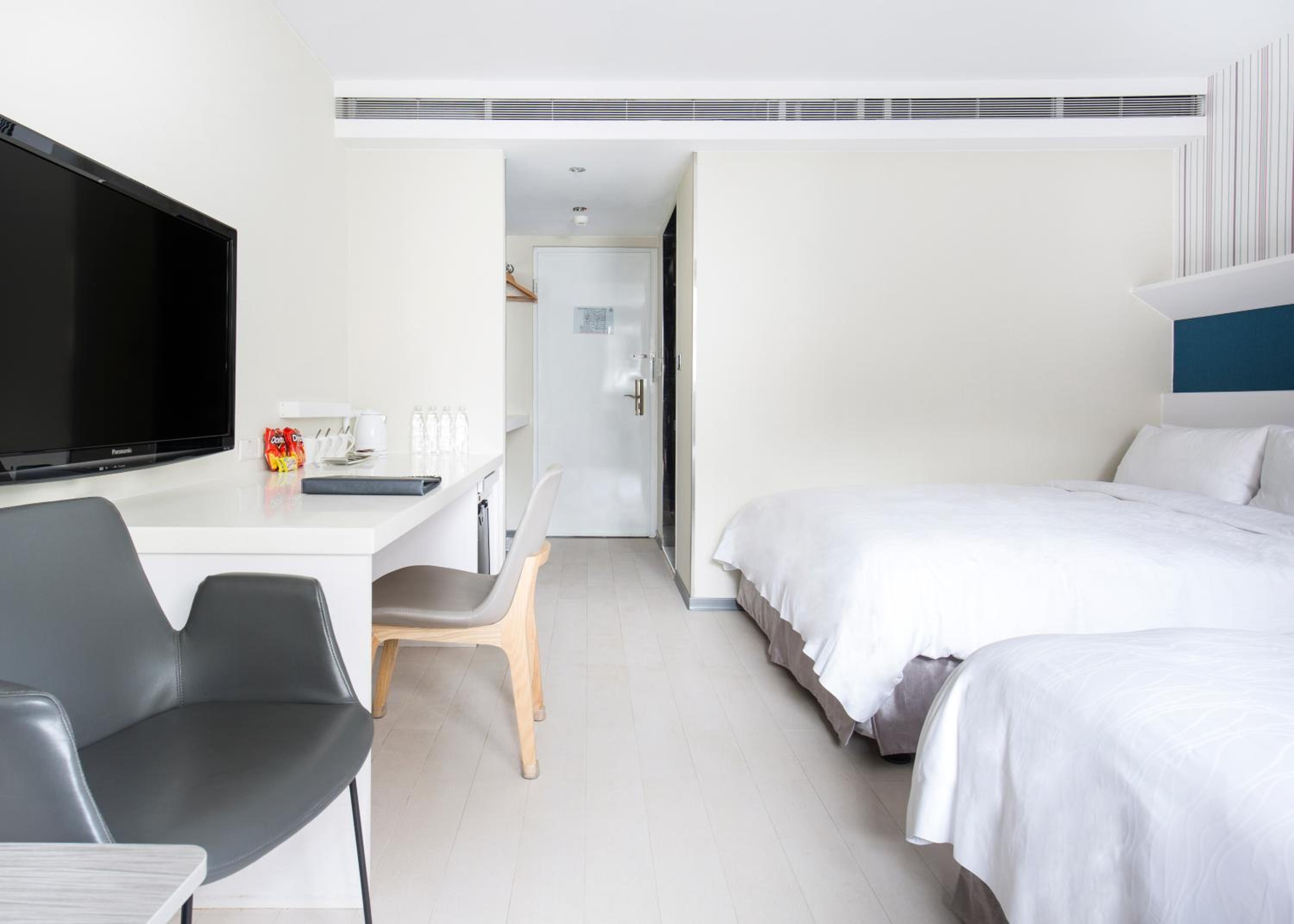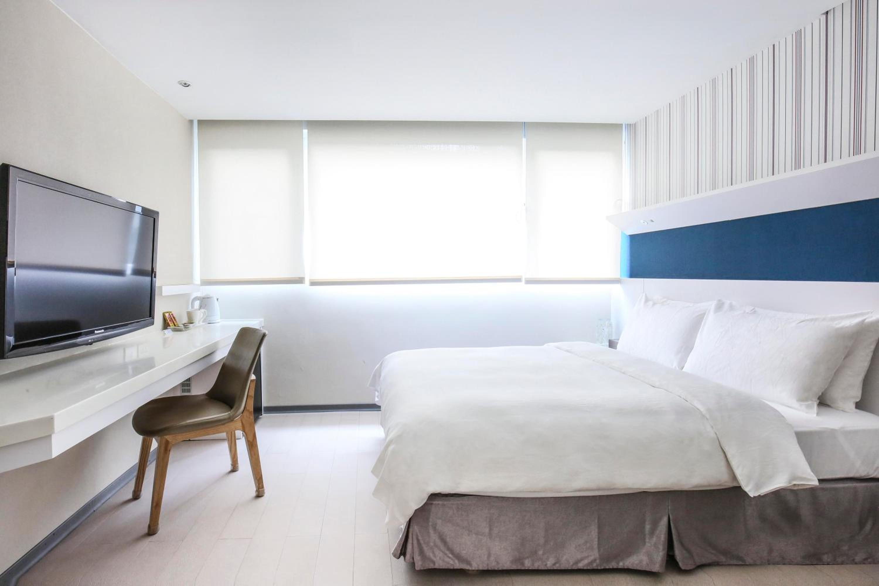 Relax in our air-conditioned rooms featuring stylish white and pale wood decor, spacious work areas, and essential amenities like a fridge and electric kettle. Book your stay at Dandy Tian Mu for a memorable Taipei experience.