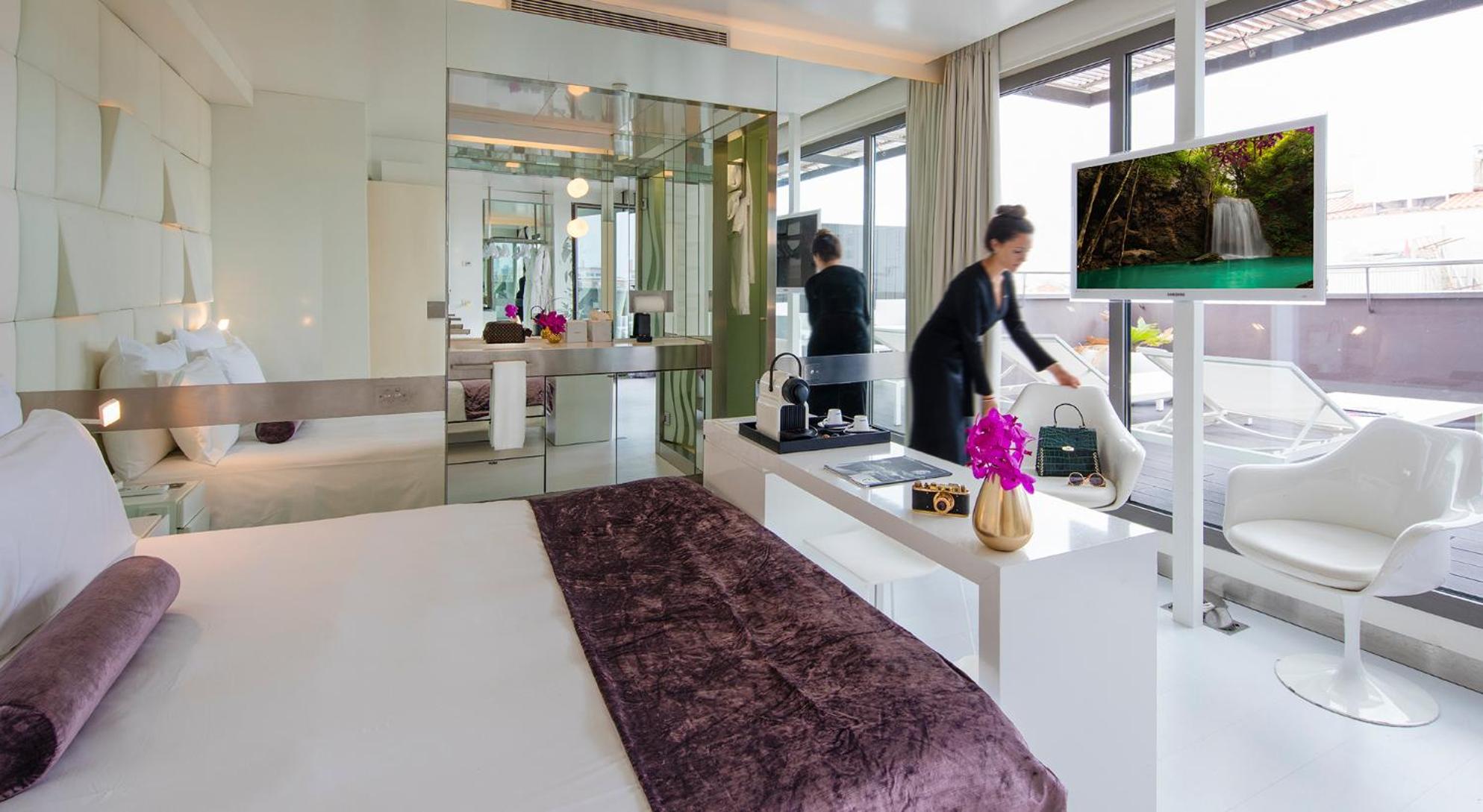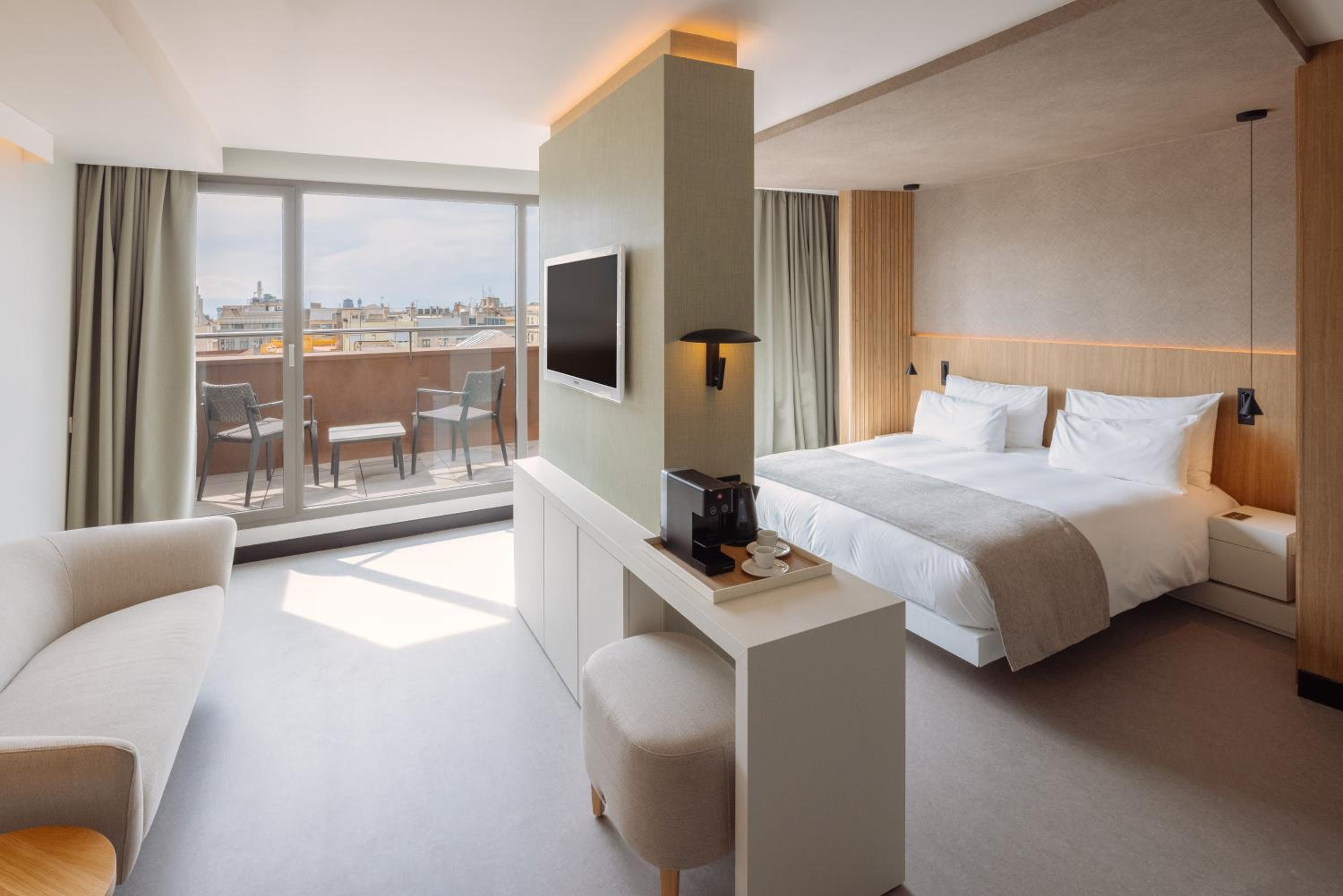 Experience elegance and sustainability at The Mirror Barcelona - Adults Only, located steps away from Paseo de Gracia Boulevard. The hotel boasts chic rooms adorned with mirrors, free WiFi, and LCD TVs in both the bedroom and bathroom. Unwind at the small outdoor pool, sauna, or terrace, and indulge in comfort with provided bathrobes and slippers.