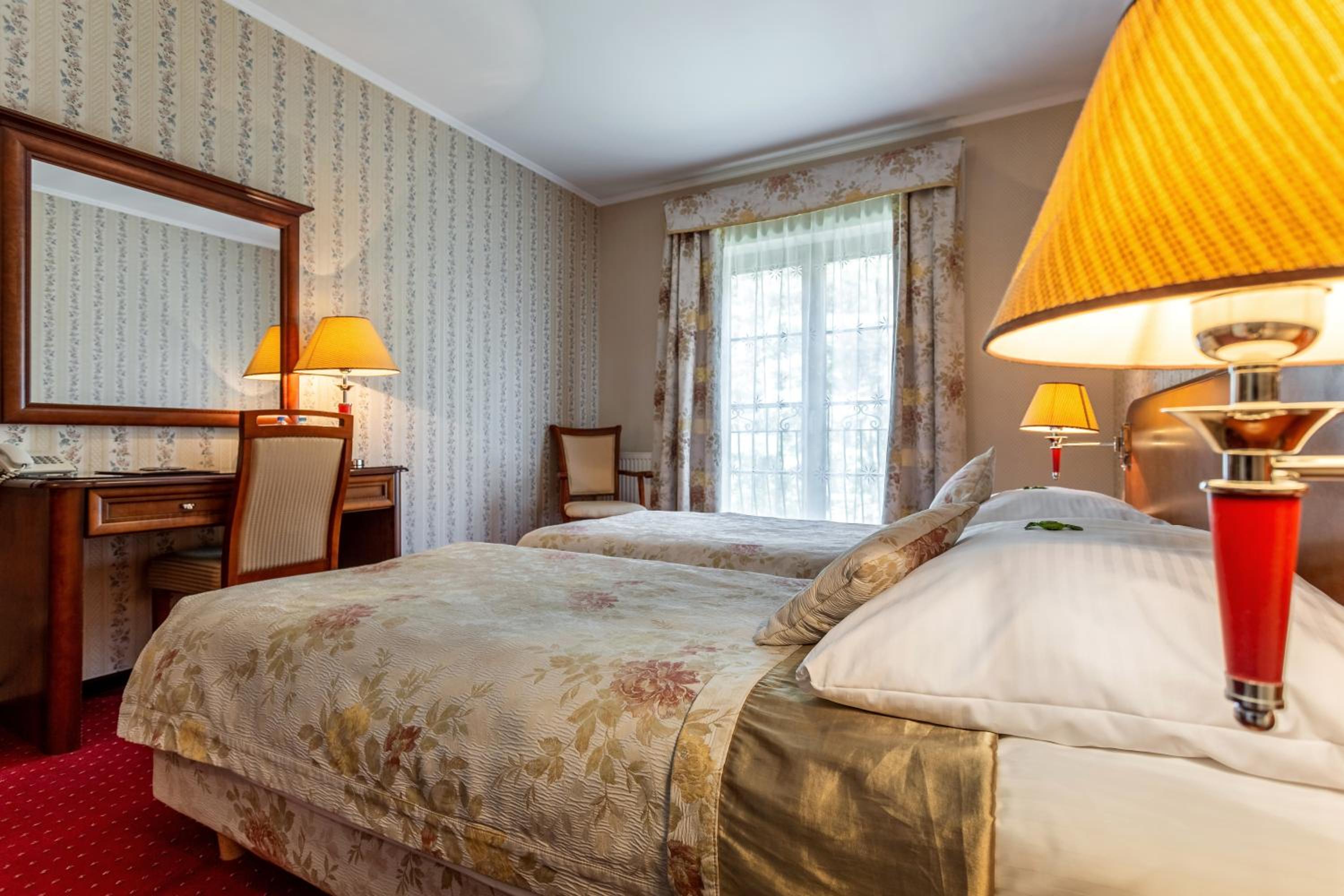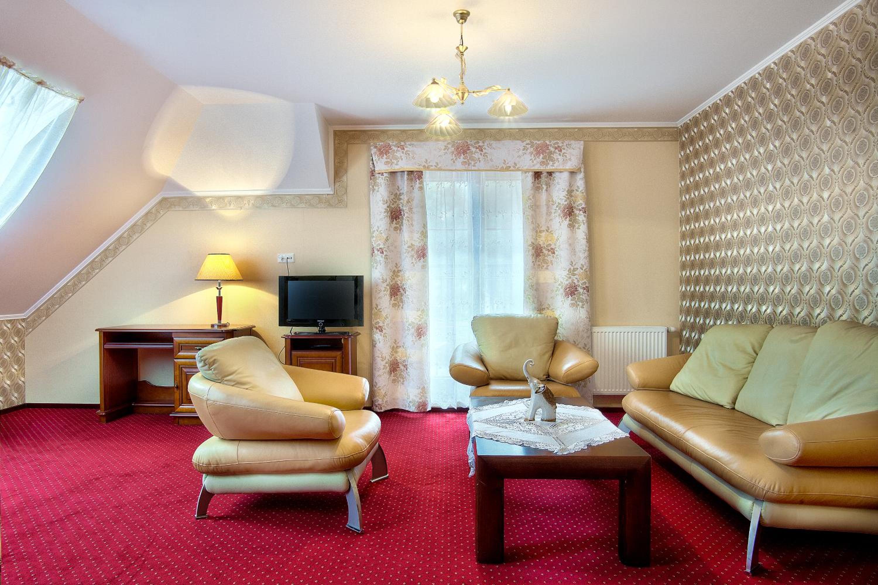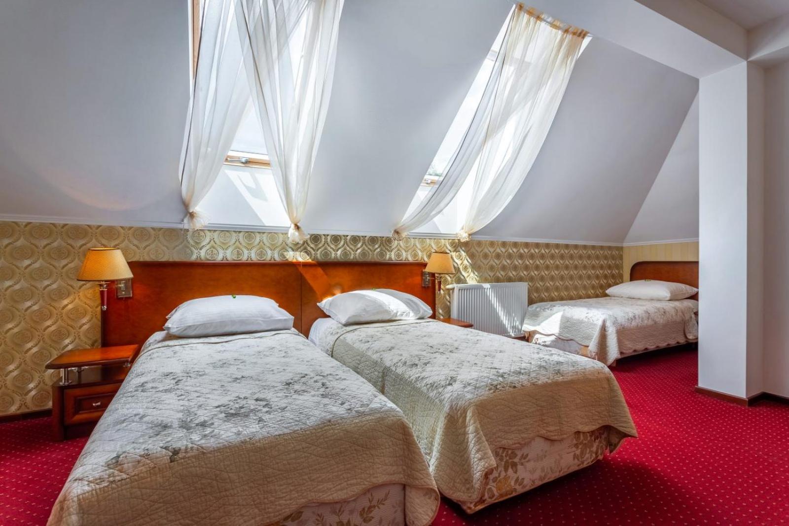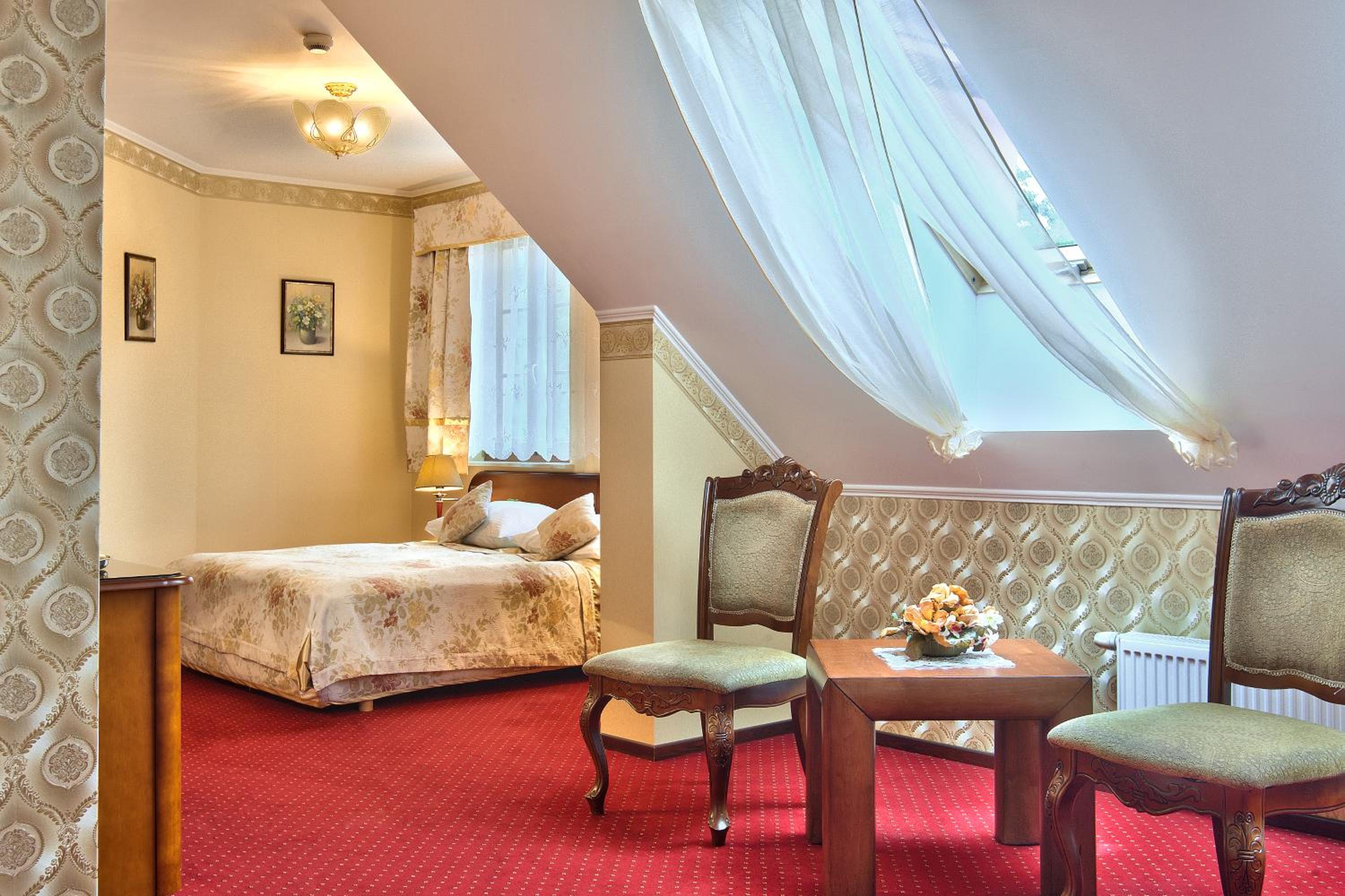The Dworek Tryumf hotel offers stylish and elegant rooms decorated in warm colors, complete with beautiful wooden furniture and cozy lighting for a relaxing stay.