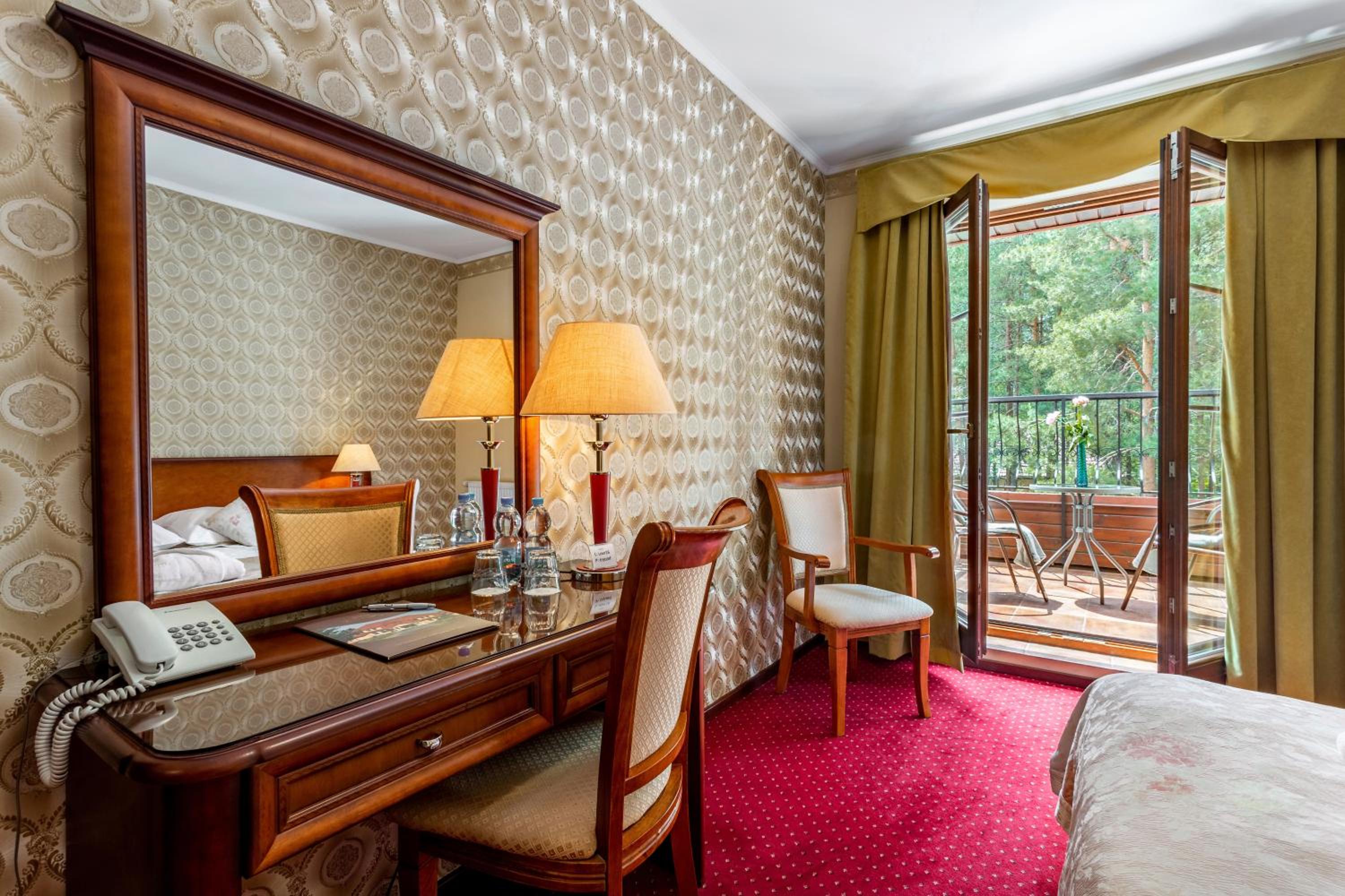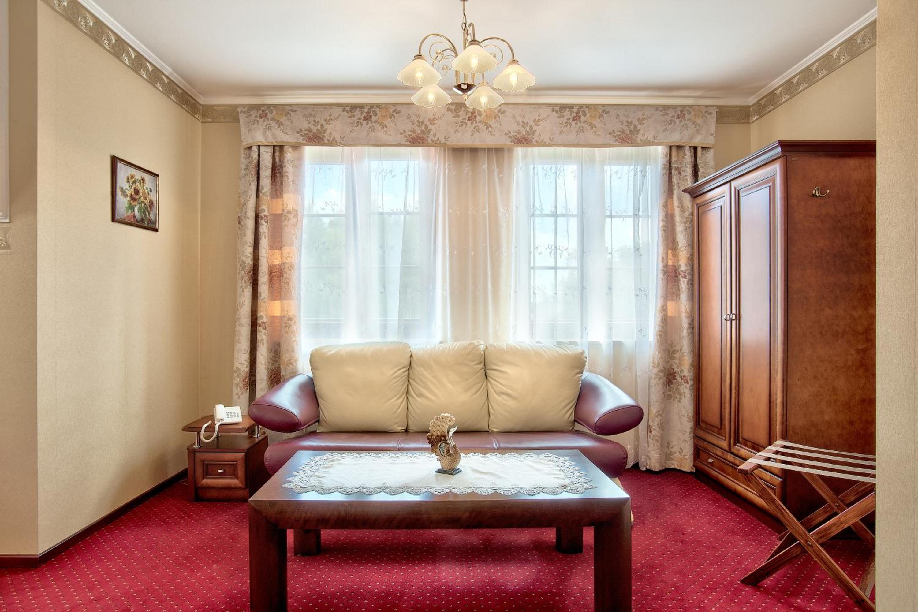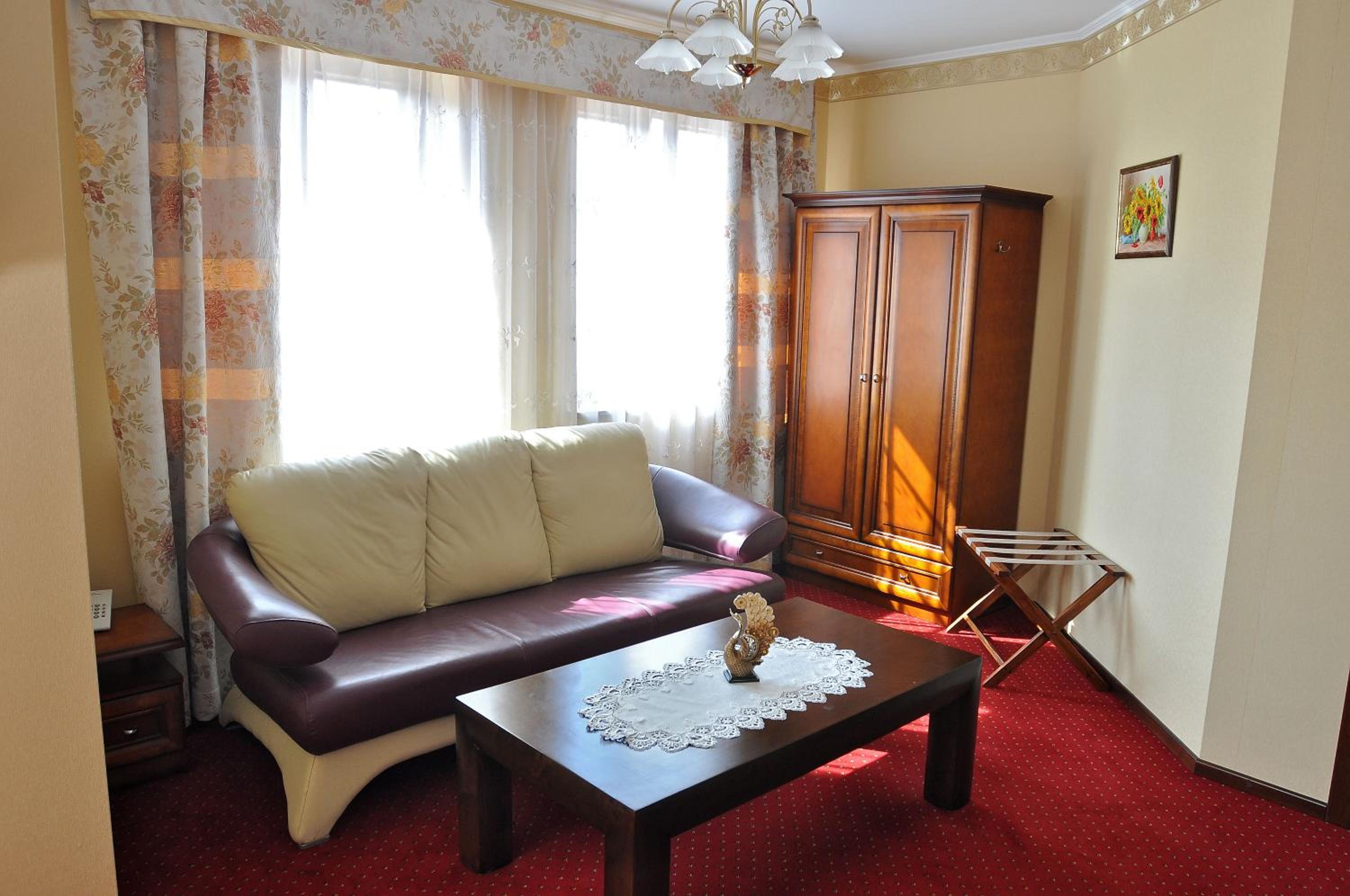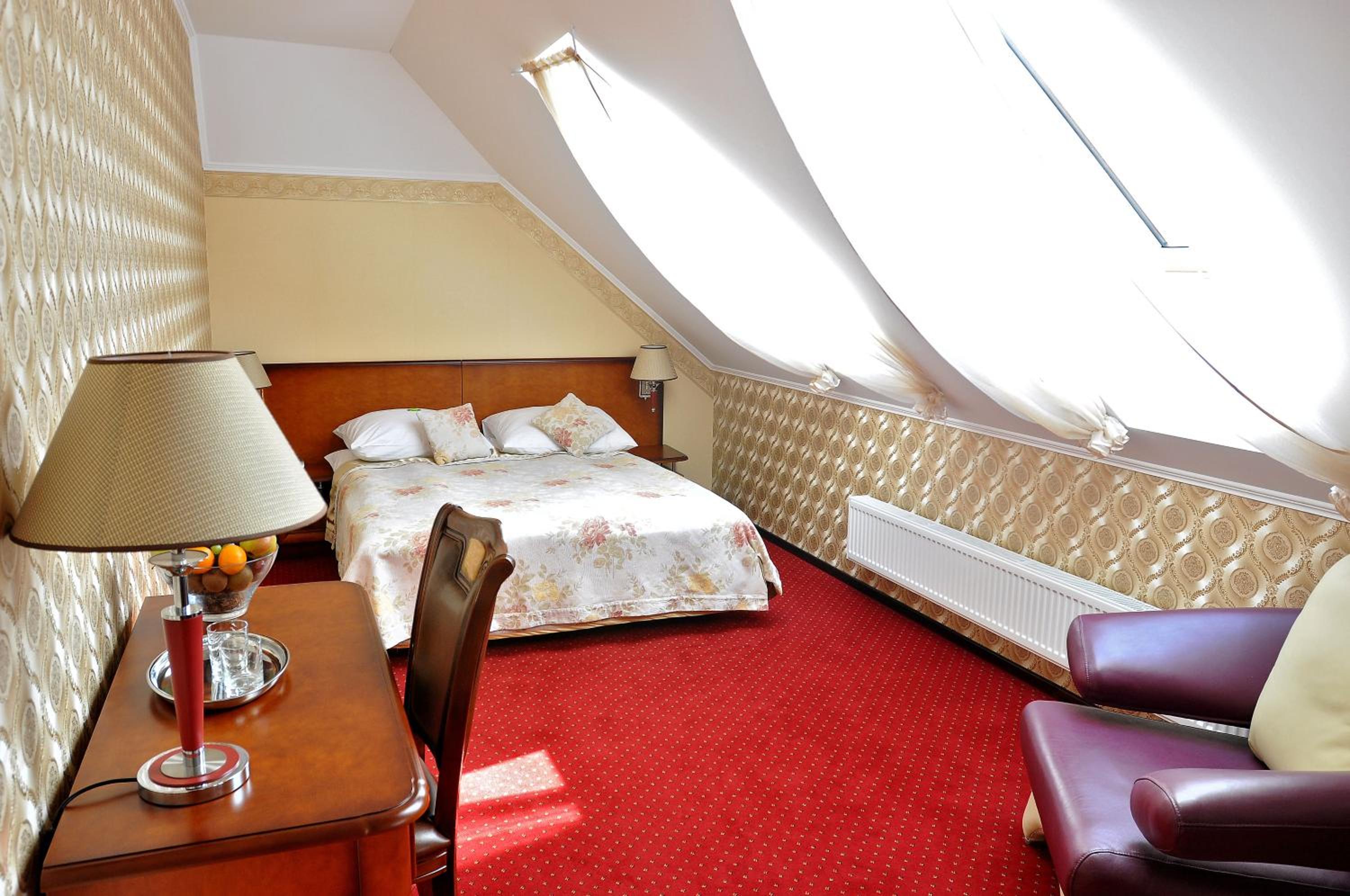 The Dworek Tryumf hotel offers stylish and elegant rooms decorated in warm colors, complete with beautiful wooden furniture and cozy lighting for a relaxing stay.