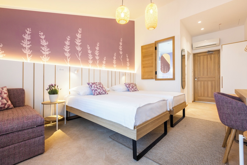 Obwohl wir eigentlich ein 5er Zimmer gebucht hatten, haben wir ein Upgrade auf 2 Schlafräume und einen Wohnraum (mit Schlafsofa), über Zwischentüren verbunden, erhalten! 2 Balkone waren auch dabei, Richtung Garten, mit Abendsonne.