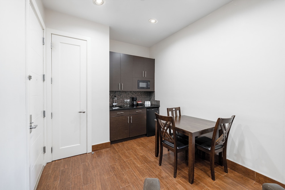 Room was spacious and contained a kitchenette (but no dishes or silverware). Unfortunately there was such intensive construction outside that it was nearly impossible to get our luggage down the street after check-out. Front desk checked in with us about arrival details and had good communication.