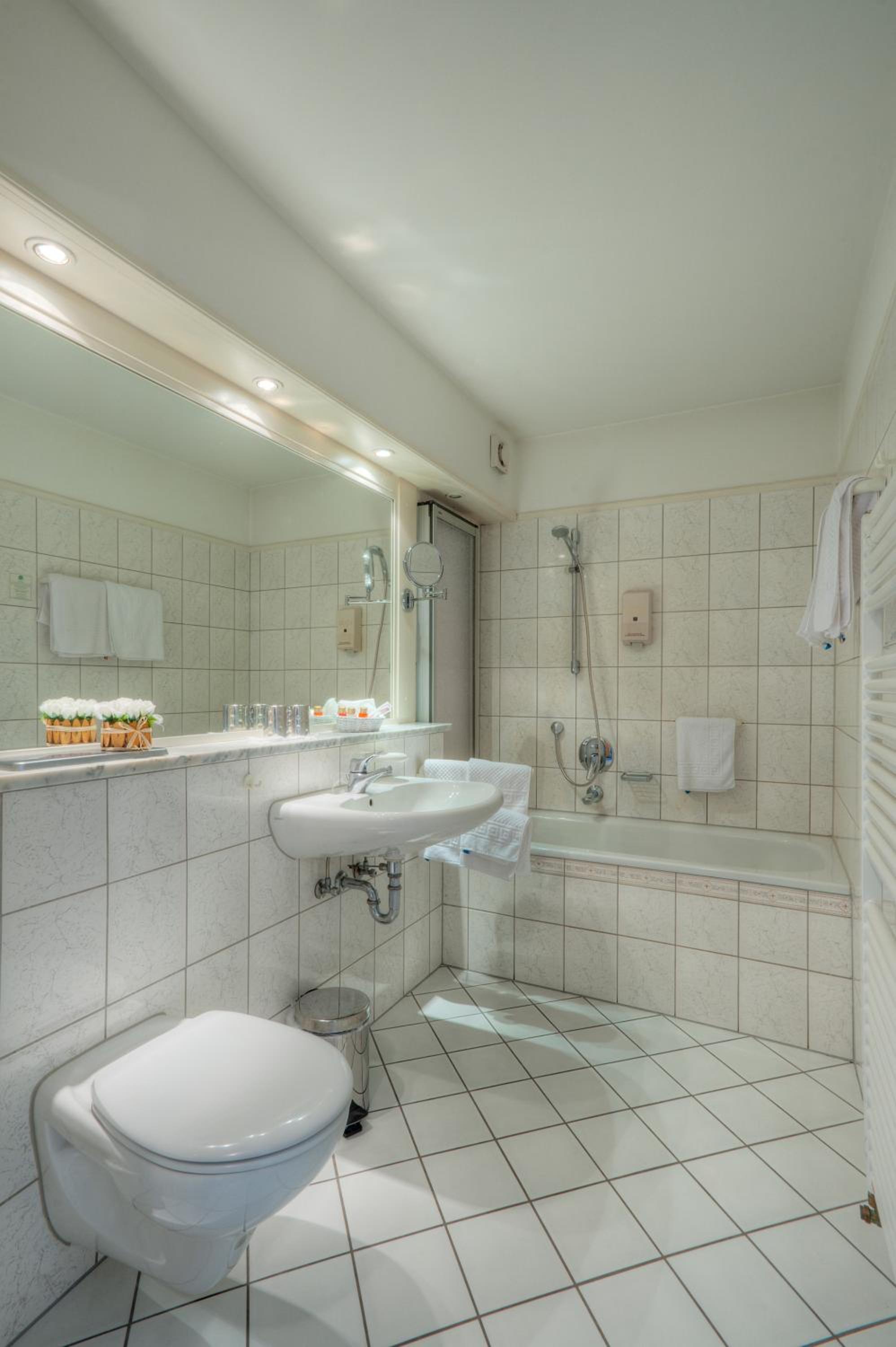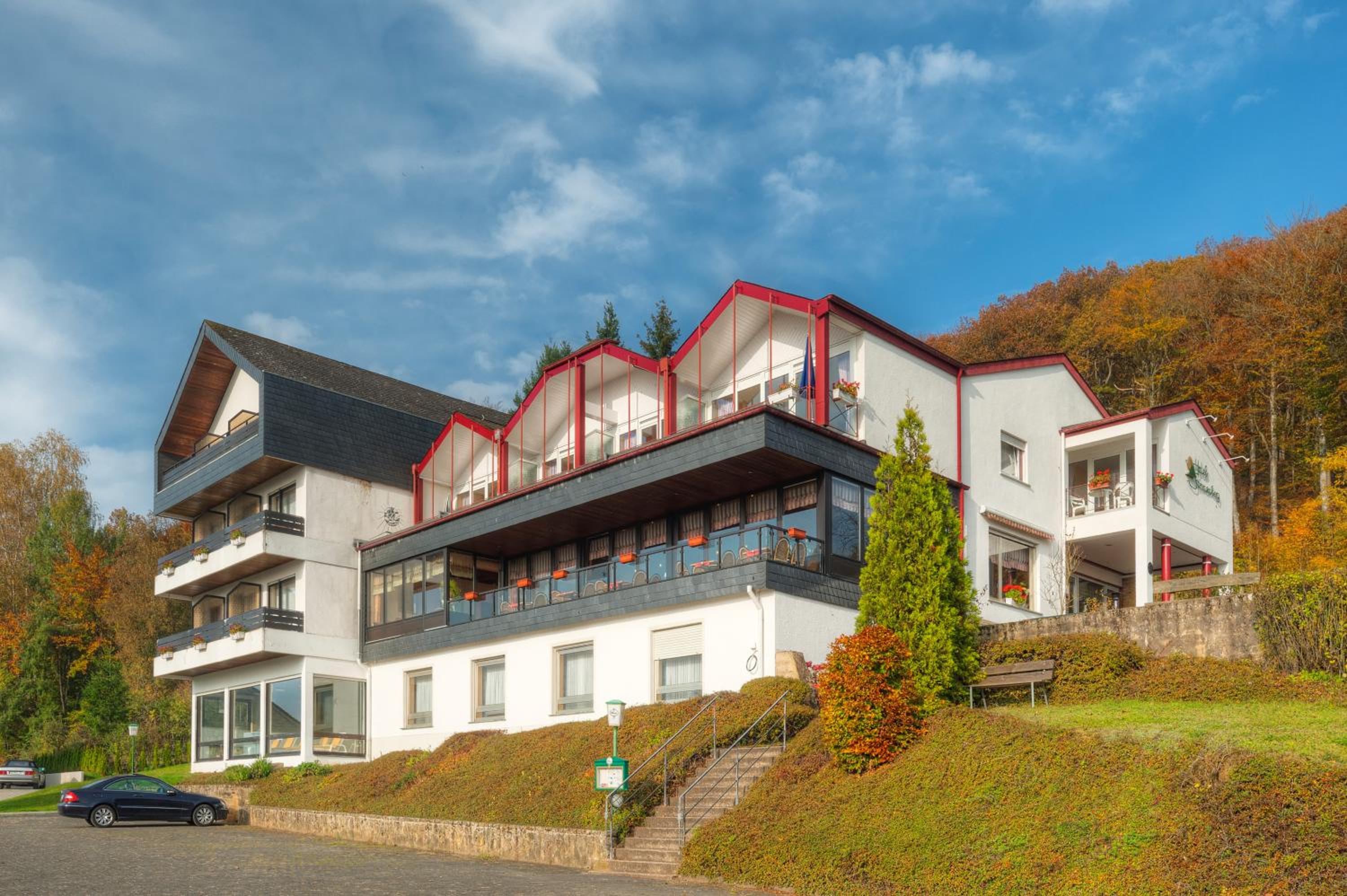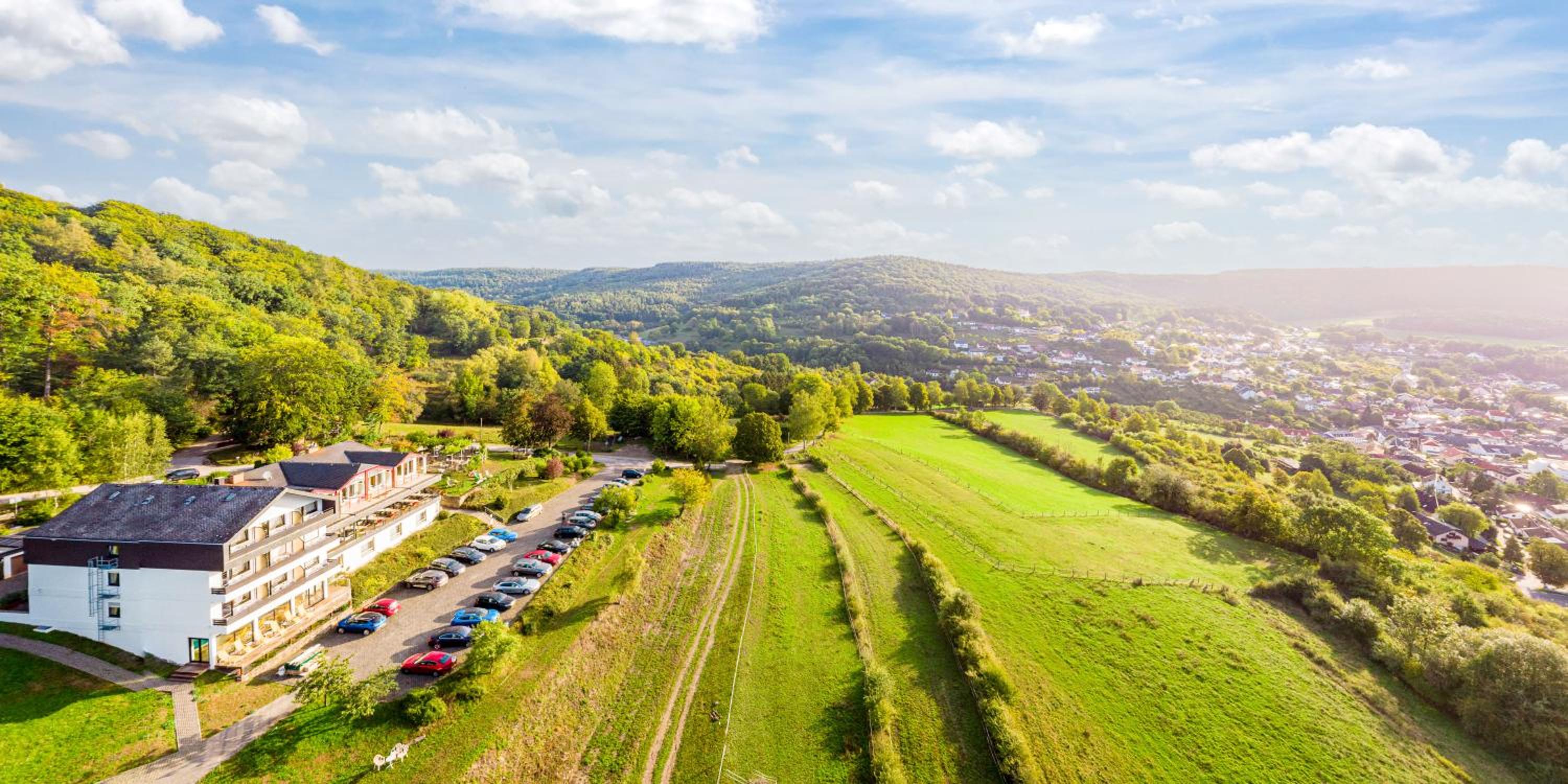 Surrounded by a 50,000 m² park, guests can unwind in the sunbathing lawn, barbecue area, and horse paddock. The hotel's proximity to the German-Luxembourg Nature Park allows for outdoor activities like walking, hiking, and cycling amidst stunning cliff formations and caves.