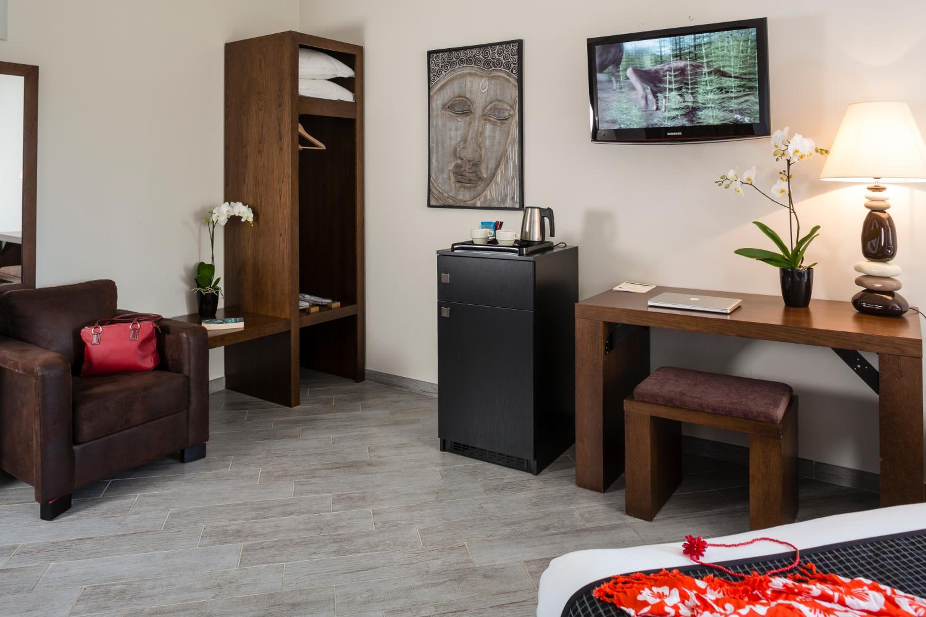 Équipement des chambres un peu trop succinct, pas de fauteuil, trop peu de prises électriques, climatisation bruyante