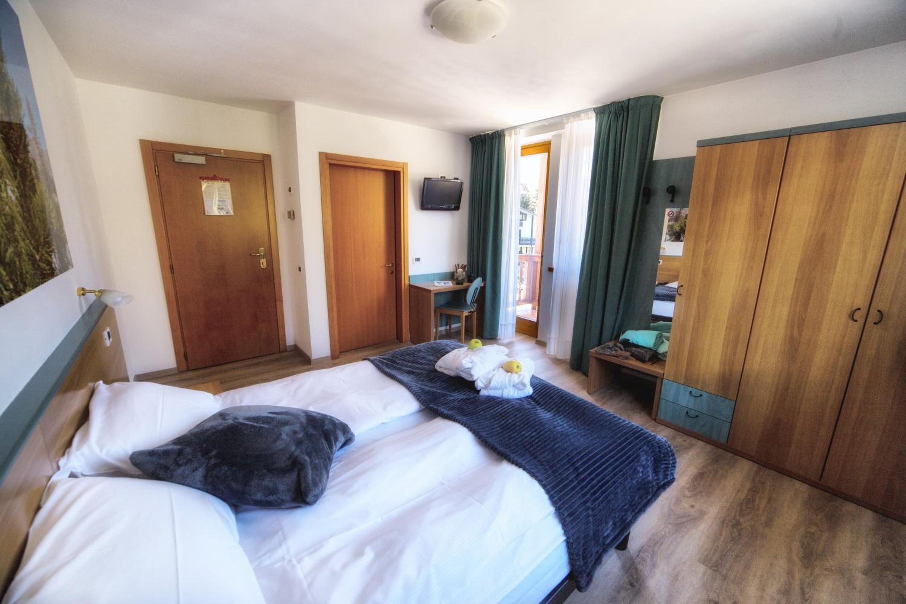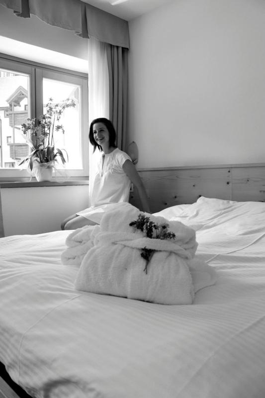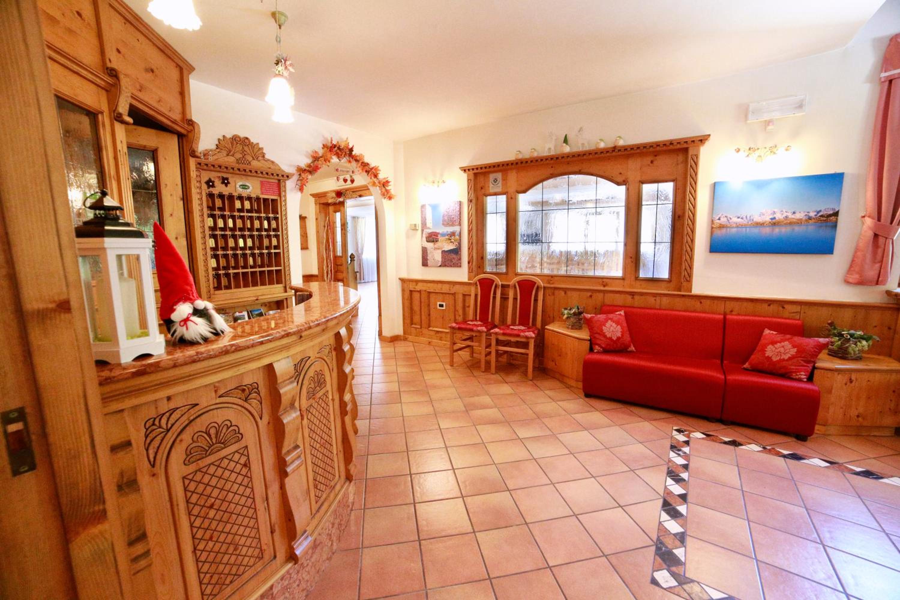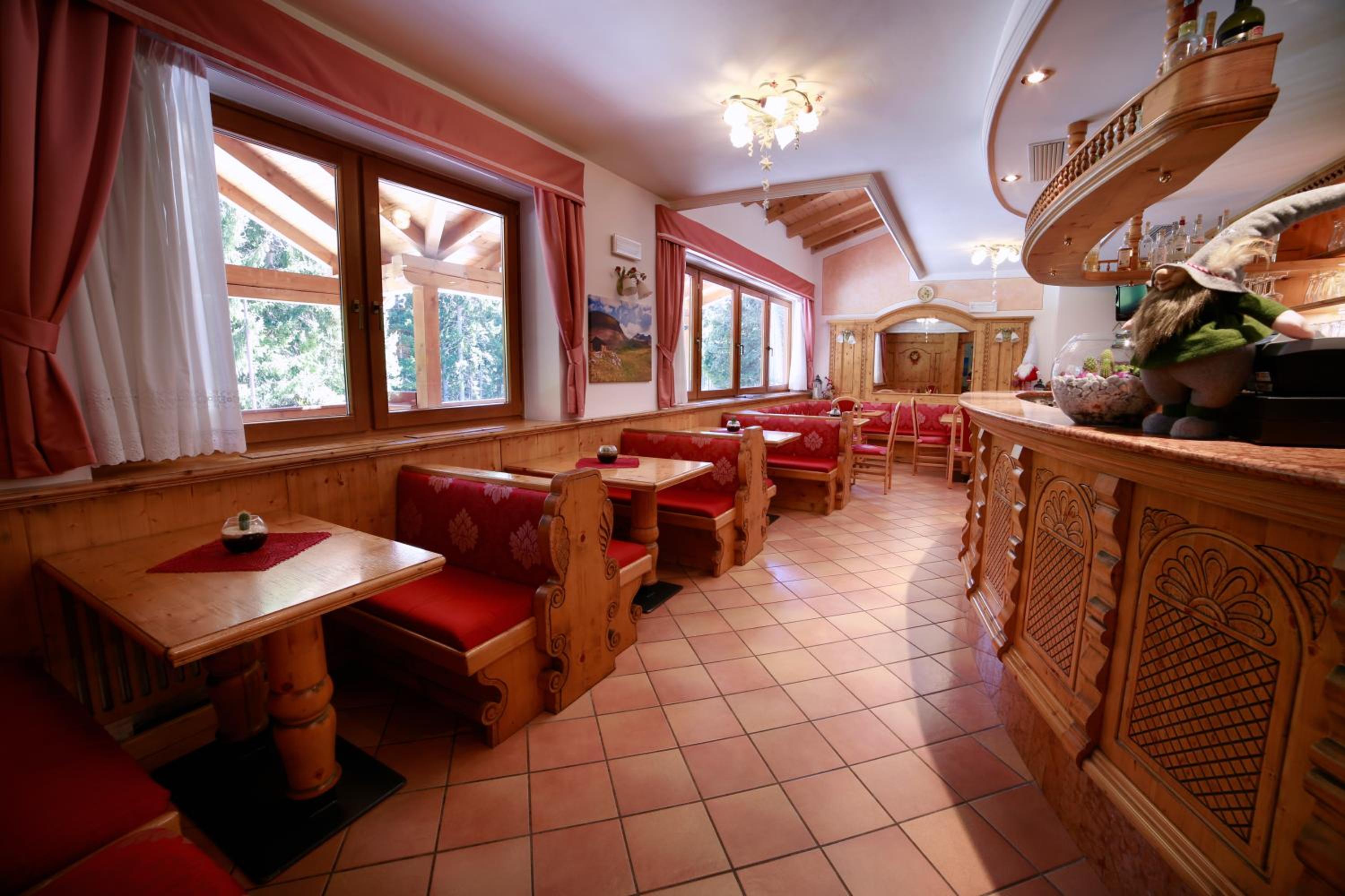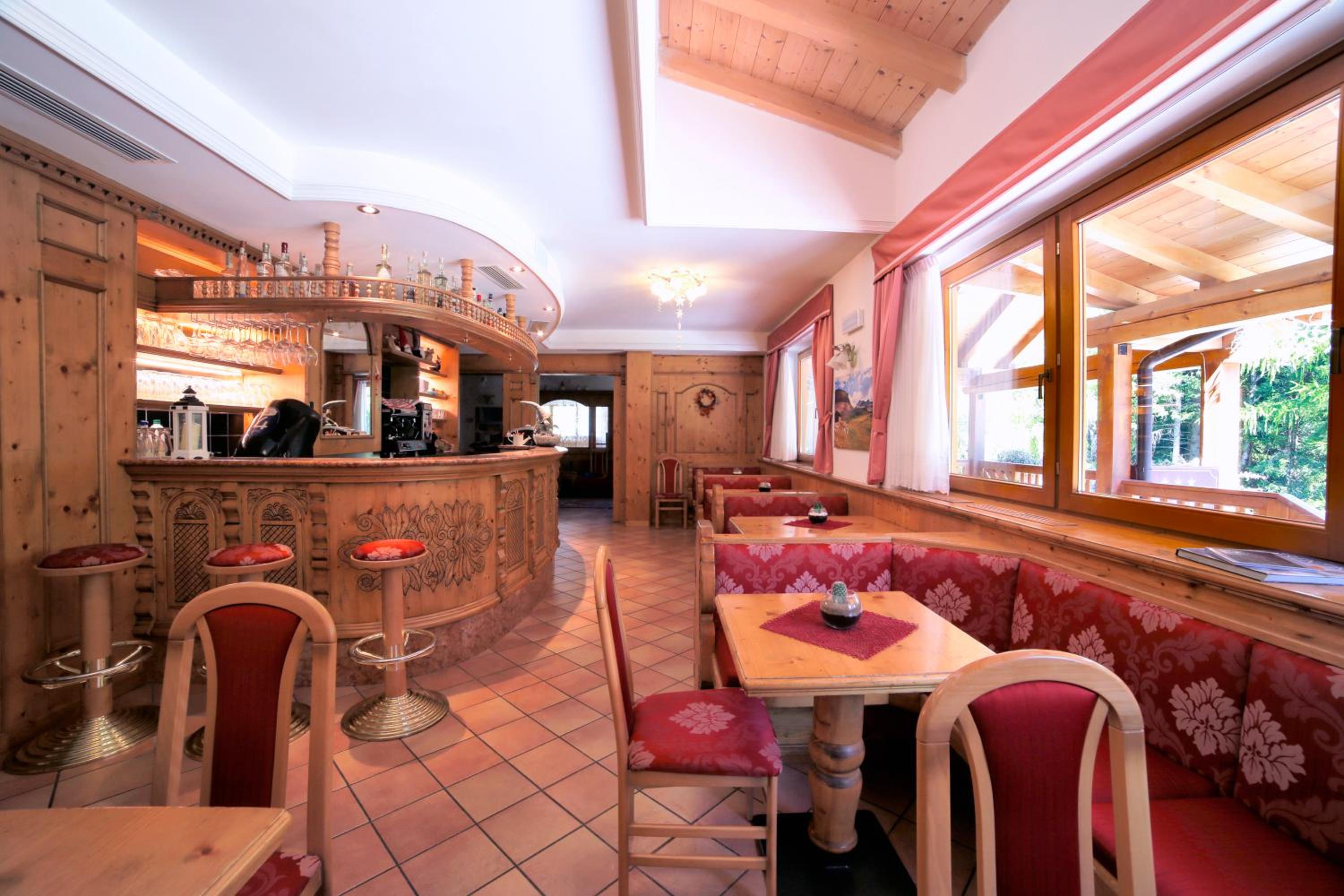 Experience cozy rooms with plush carpeted floors, LCD TVs, and private bathrooms. Wake up to stunning Dolomite views in select rooms. Enjoy drinks in our charming bar with wooden accents.