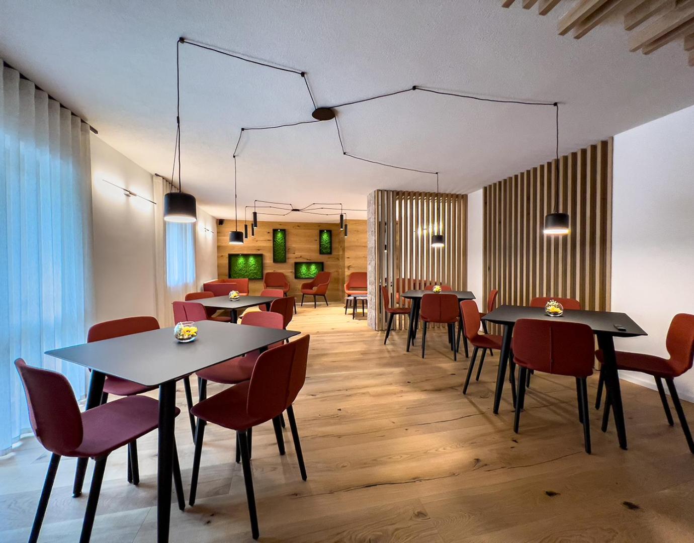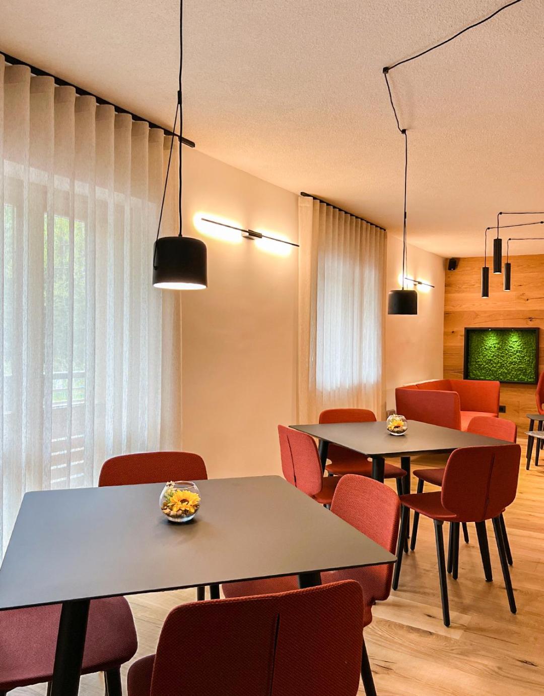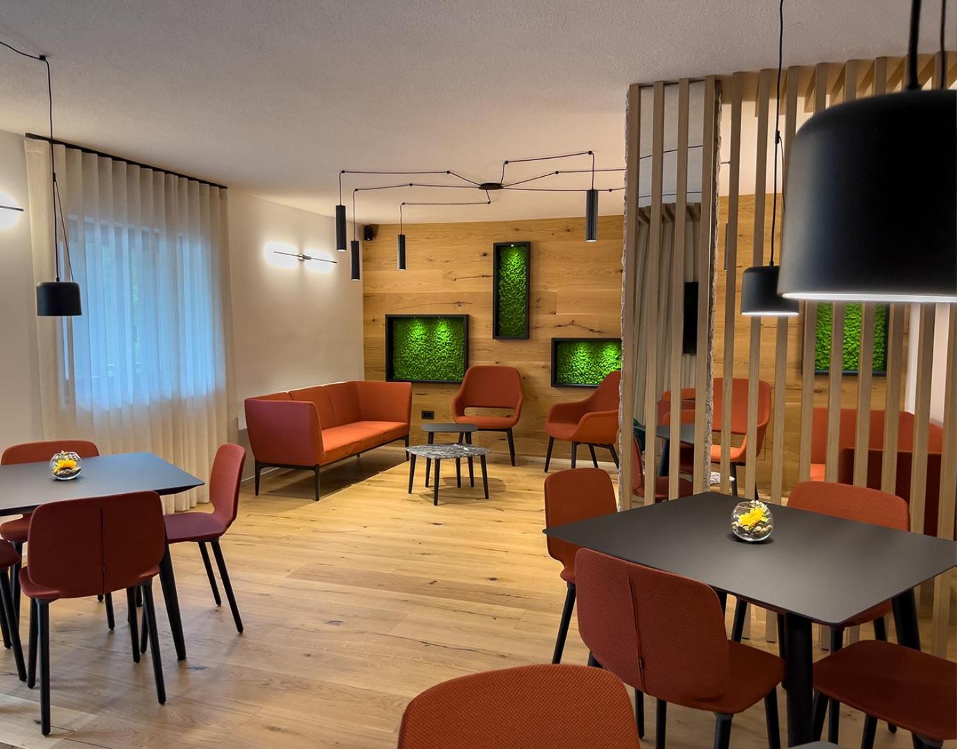Experience cozy rooms with plush carpeted floors, LCD TVs, and private bathrooms. Wake up to stunning Dolomite views in select rooms. Enjoy drinks in our charming bar with wooden accents.