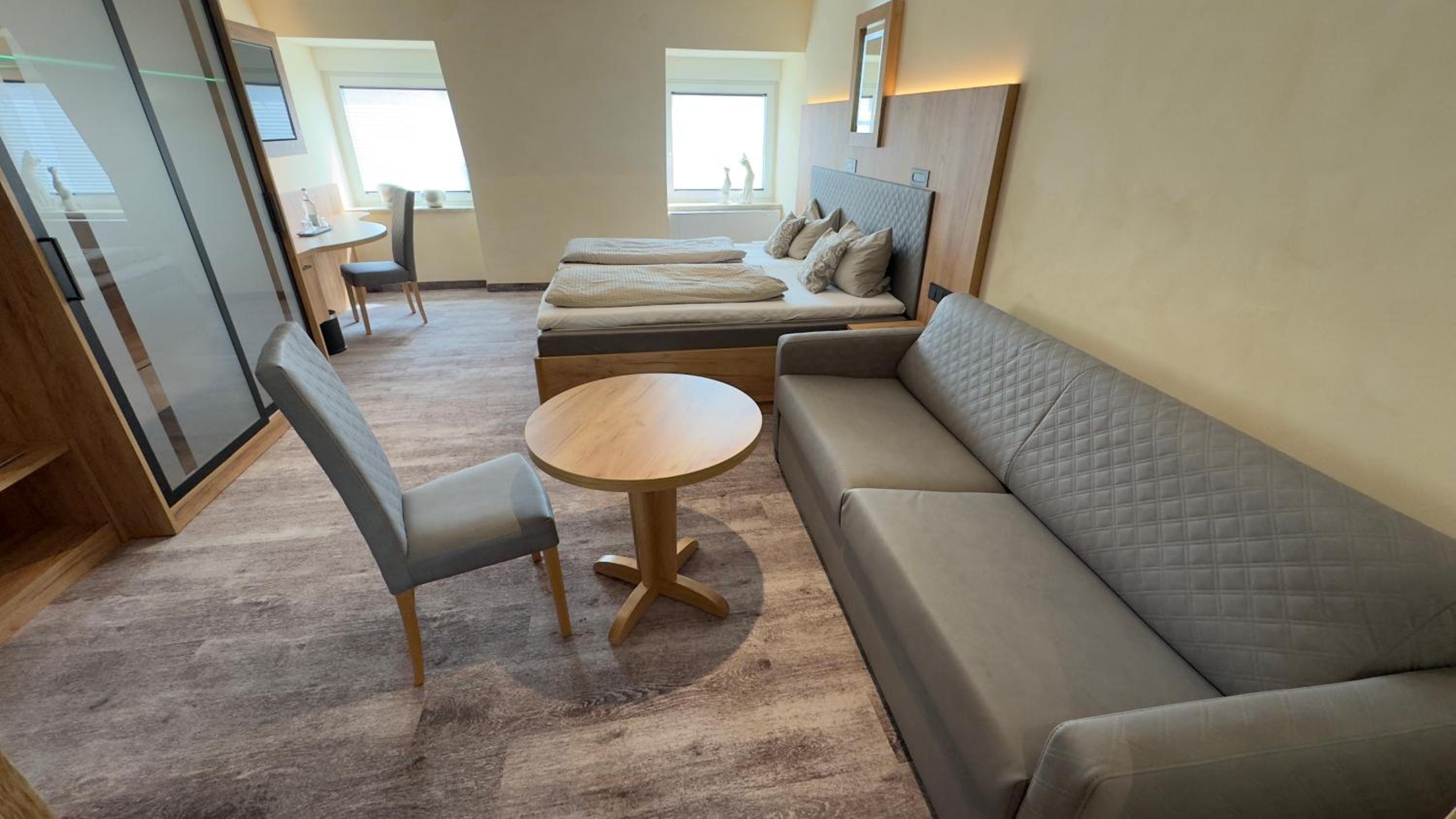 Zu dicke Kopfkissen (Geschmacksache), Haare unter einem der Kopfkissen, Spinnweben Zimmerecken sowie Bad diverse Ecken. Auf Booking.com nicht ersichtlich dass es sich um ein “richtiges” Bett sowie um ein großes Klappbett handelt (letzteres war nicht so komfortabel). Teppichboden im Zimmer (auch Eingangsbereich), leider keine Abtropfschale für Schuhe. Nervig dass Licht nur mit gesteckter Zimmerkarte funktioniert. Angefragtes und bestätigtes glutenfreies Frühstück gab es nicht. Auf Nachfrage war die Antwort “Nee, gibt es nicht, wir können ja nicht auf alles Rücksicht nehmen”. Frühstück ok aber nichts besonderes, hinter Heizkörpern sowie die gußeisernen Tischgestelle könnte mal gereinigt werden.