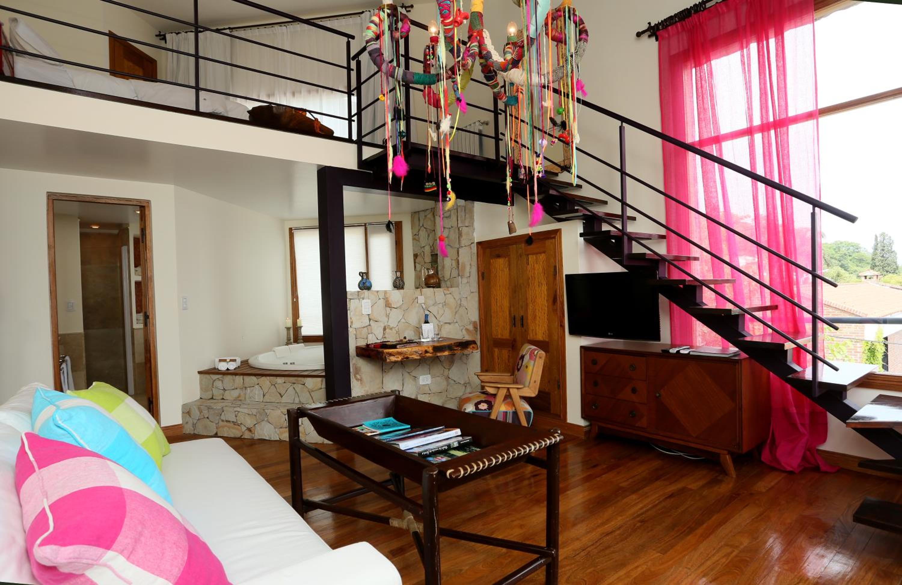 Experience 4-star comfort at Kkala, featuring elegant red sofas, a rustic fireplace, and hydromassage tubs in select rooms. Enjoy modern amenities like air-conditioning, flat-screen TVs, and balconies with city views.