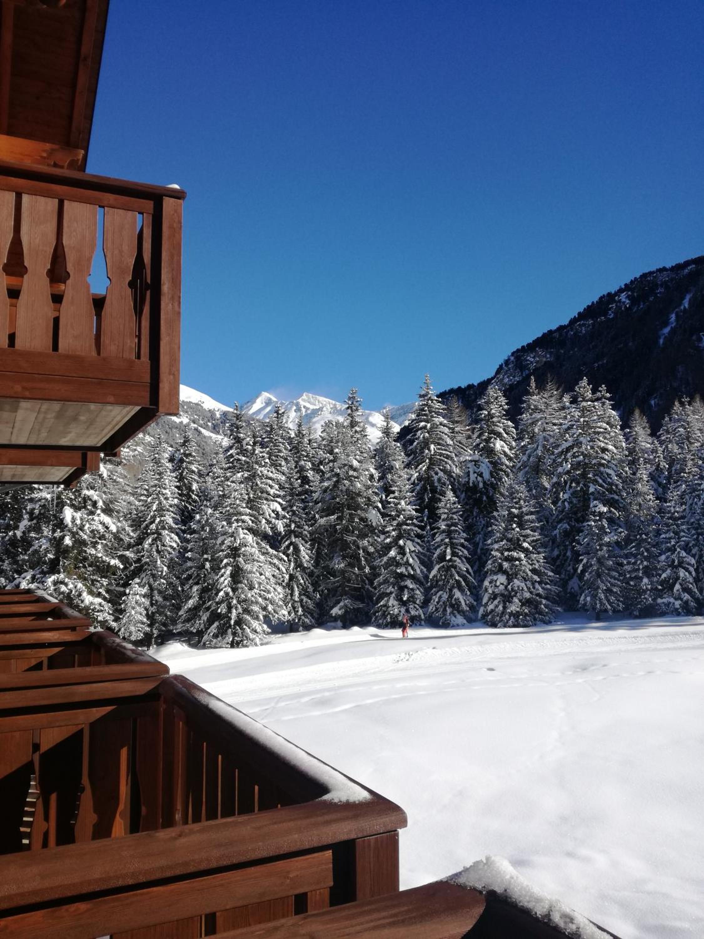 Experience the cozy ambiance of our rooms decorated in traditional mountain style, offering stunning balcony views of the majestic mountains. Relax in comfort with wood-beamed ceilings, rustic furniture, and modern amenities like a TV and a private bathroom.