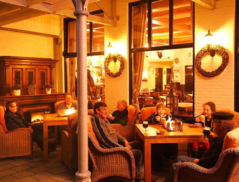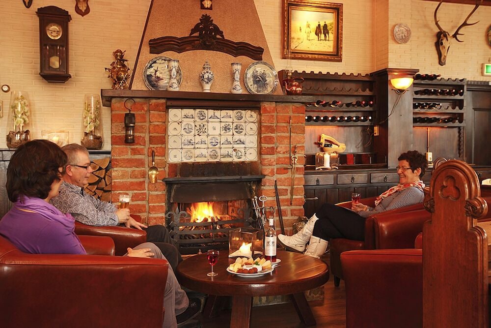 Gezellig bij de open haard eten in een historisch hotel.