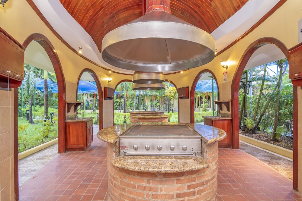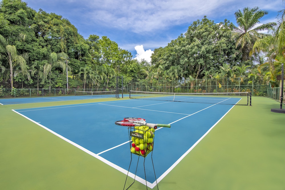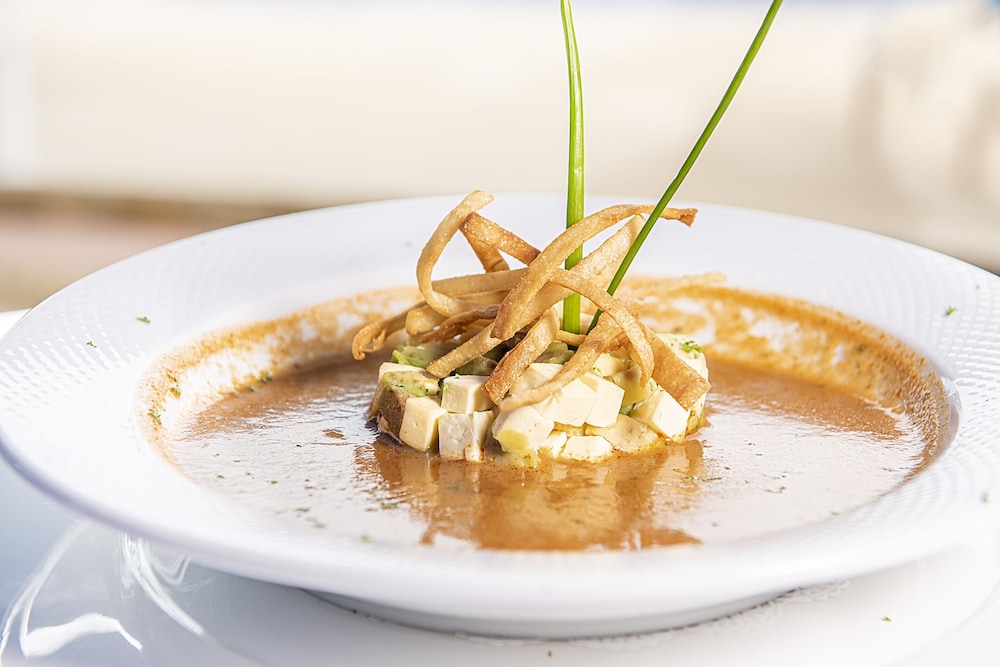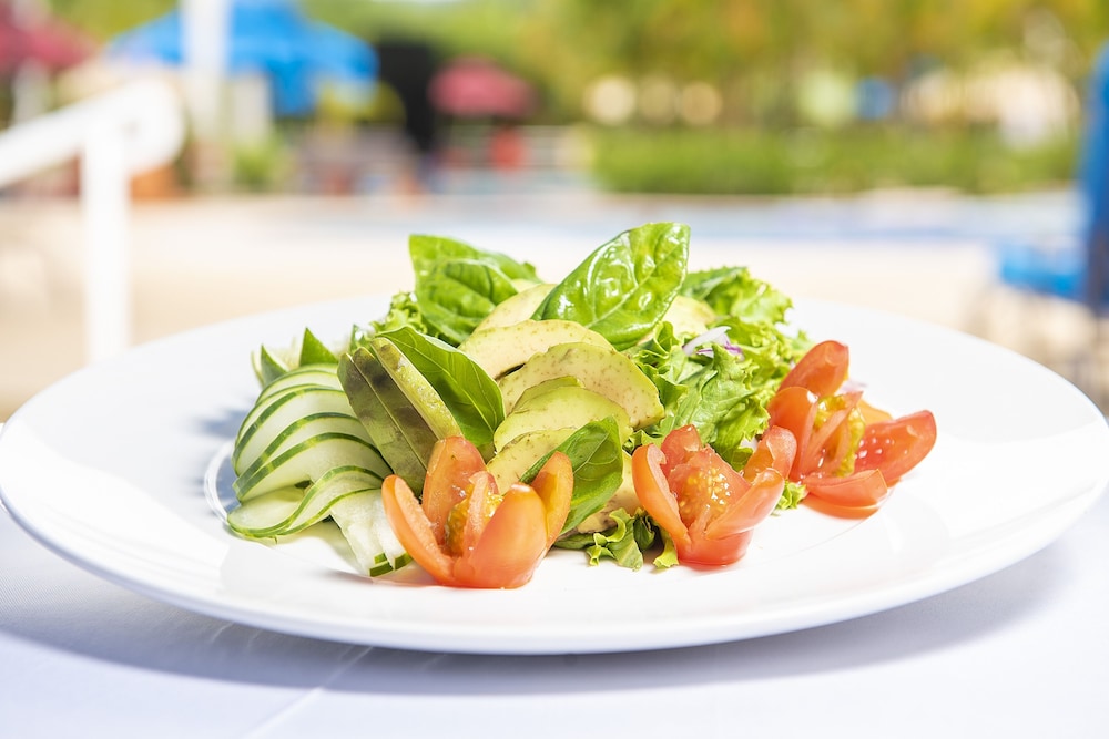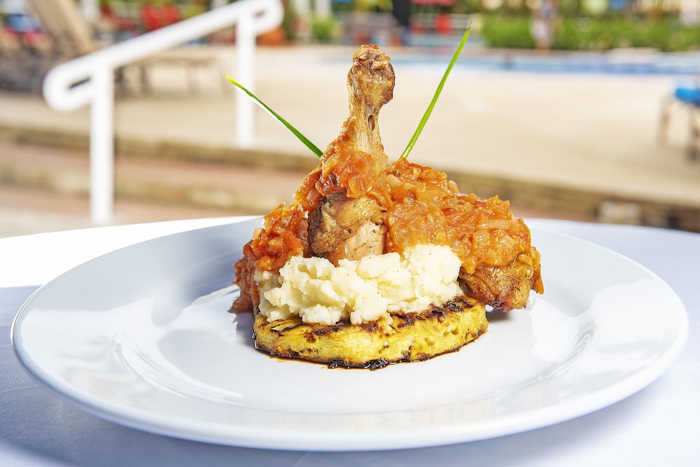 Oldish topical style with amazing cuisine and nice pools. Impressive menu.