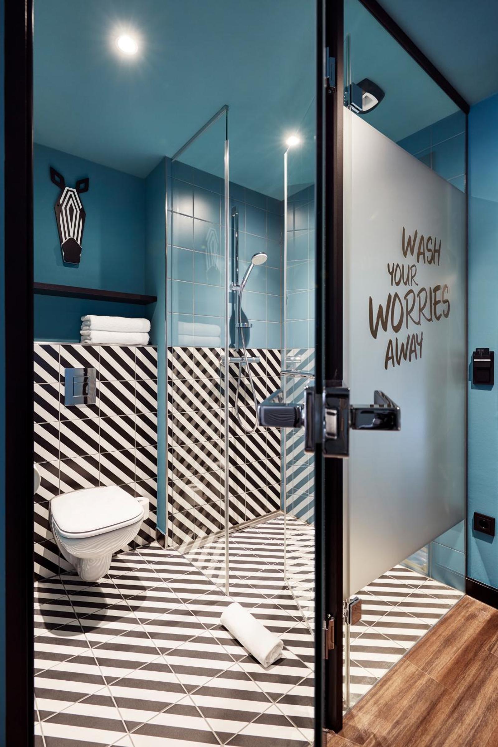 Experience comfort and style in our spacious rooms with large windows and modern amenities including a flat-screen TV and open-plan bathroom.