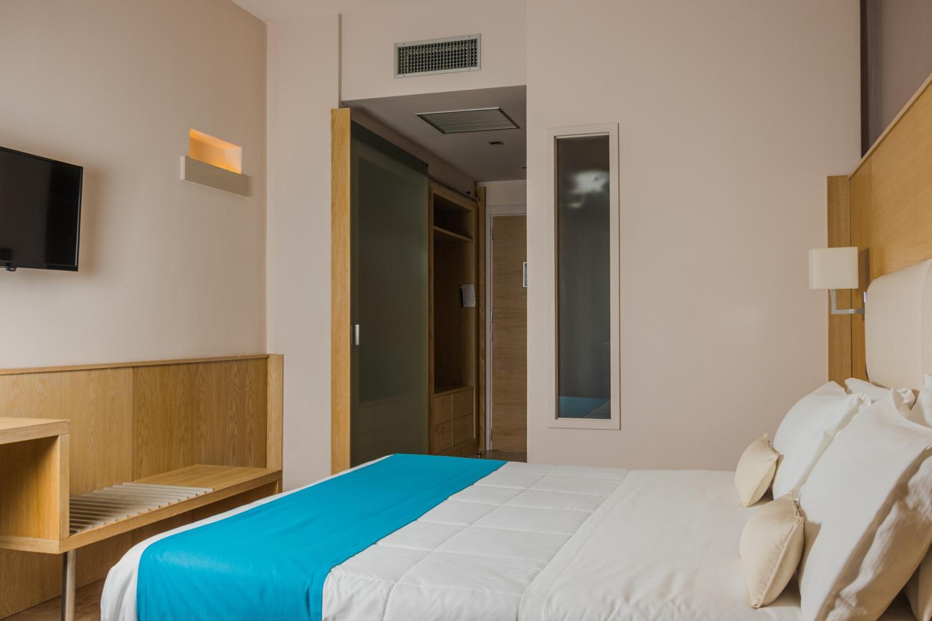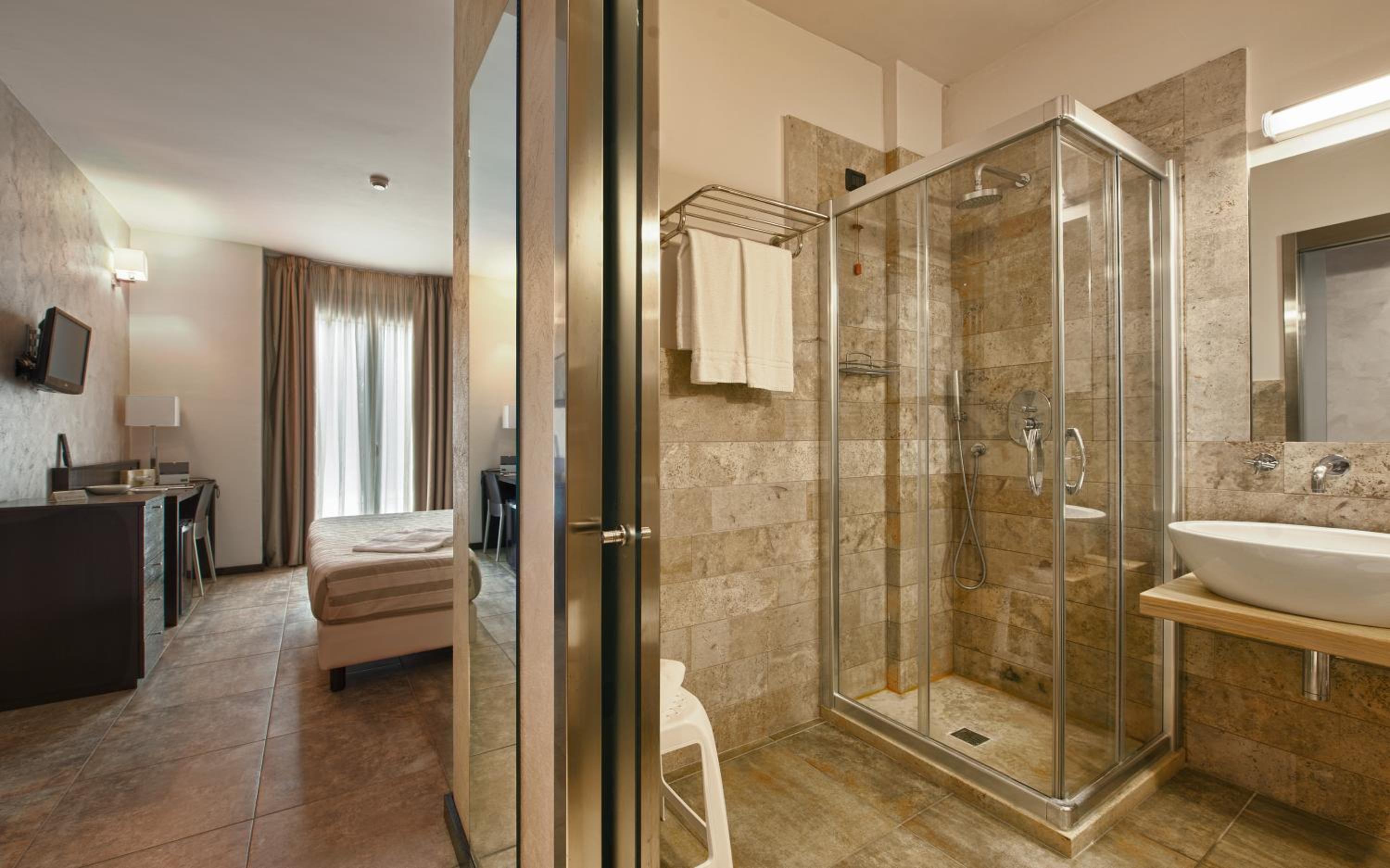 Il bagno é diviso dal resto della camera da una vetrata con annessa porta in vetro che non si chiude del tutto. Televisore in camera di dimensioni molto contenute.